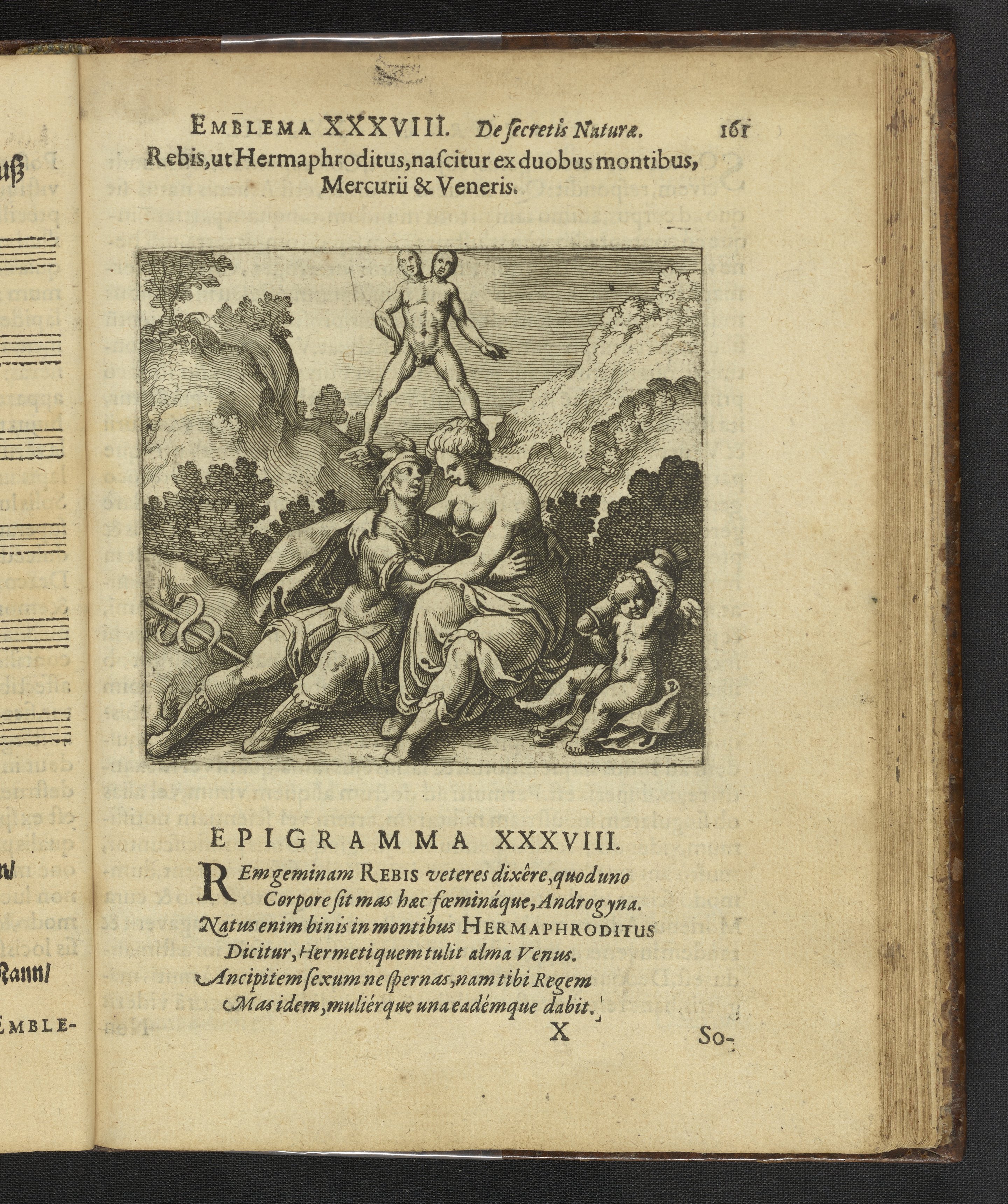 • Emblem 38. The Rebis, like a Hermaphrodite, is born from two mountains, of Mercury and of Venus.