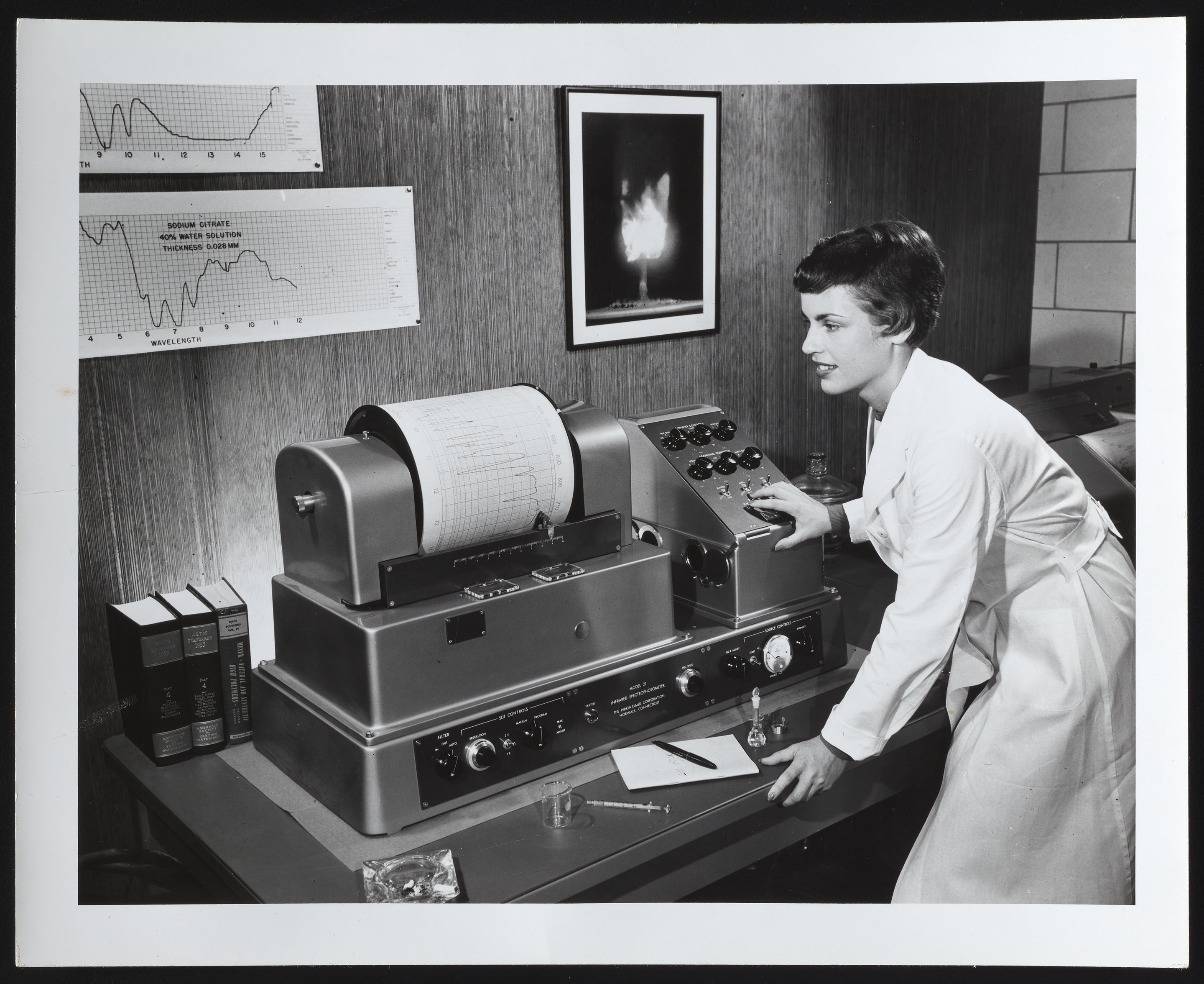 General view of an unidentified female model demonstrating use of a Perkin-Elmer Model 21 Infrared Spectrophotometer. Notably, the Perkin-Elmer Model 21 was designed as the first linear wave-number versus transmittance recording spectrophotometer.