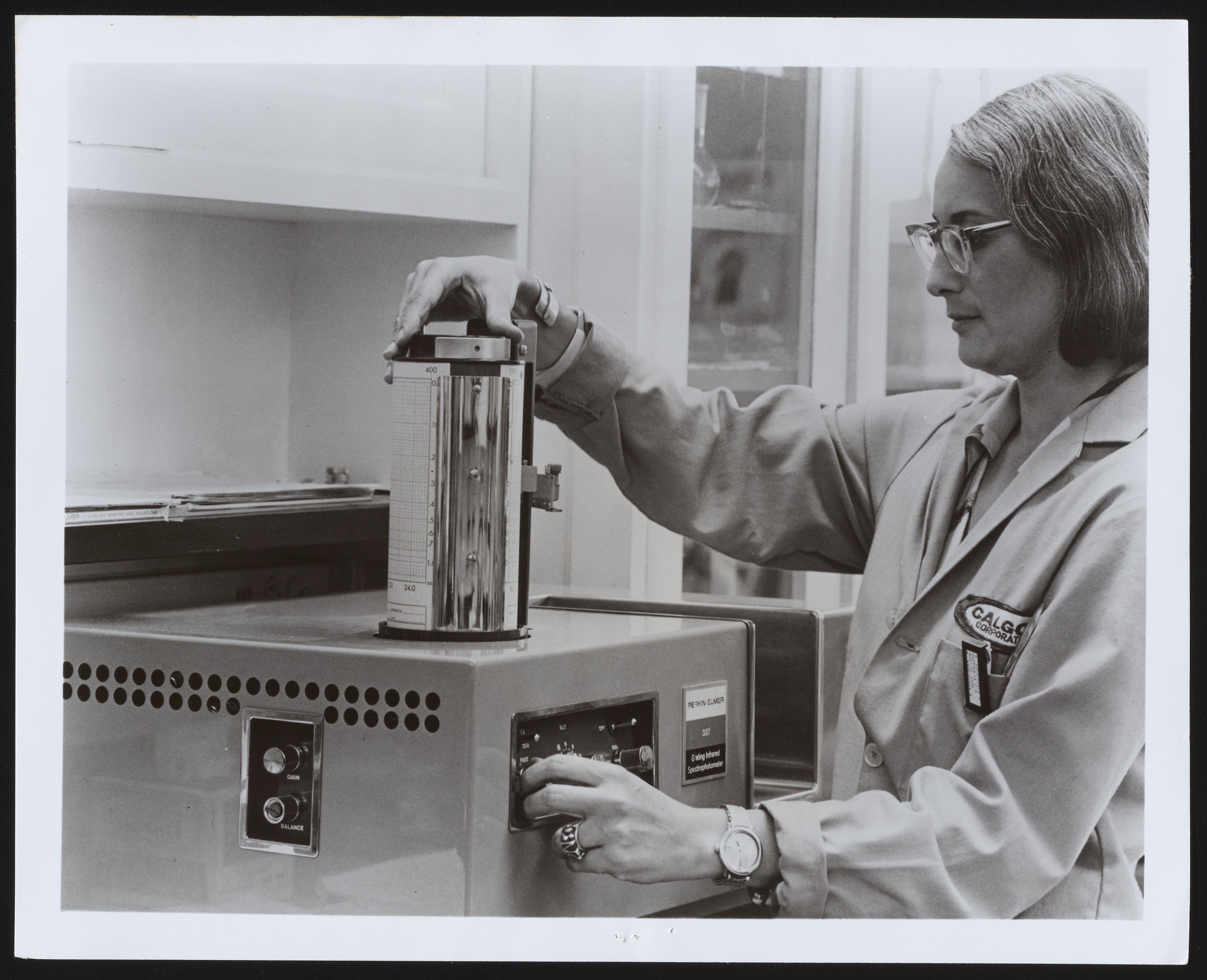General view of a Perkin-Elmer Model 337 Grating Infrared Spectrophotometer in use at a Calgon Water Management laboratory facility. The female technician visible in the photograph is unidentified.