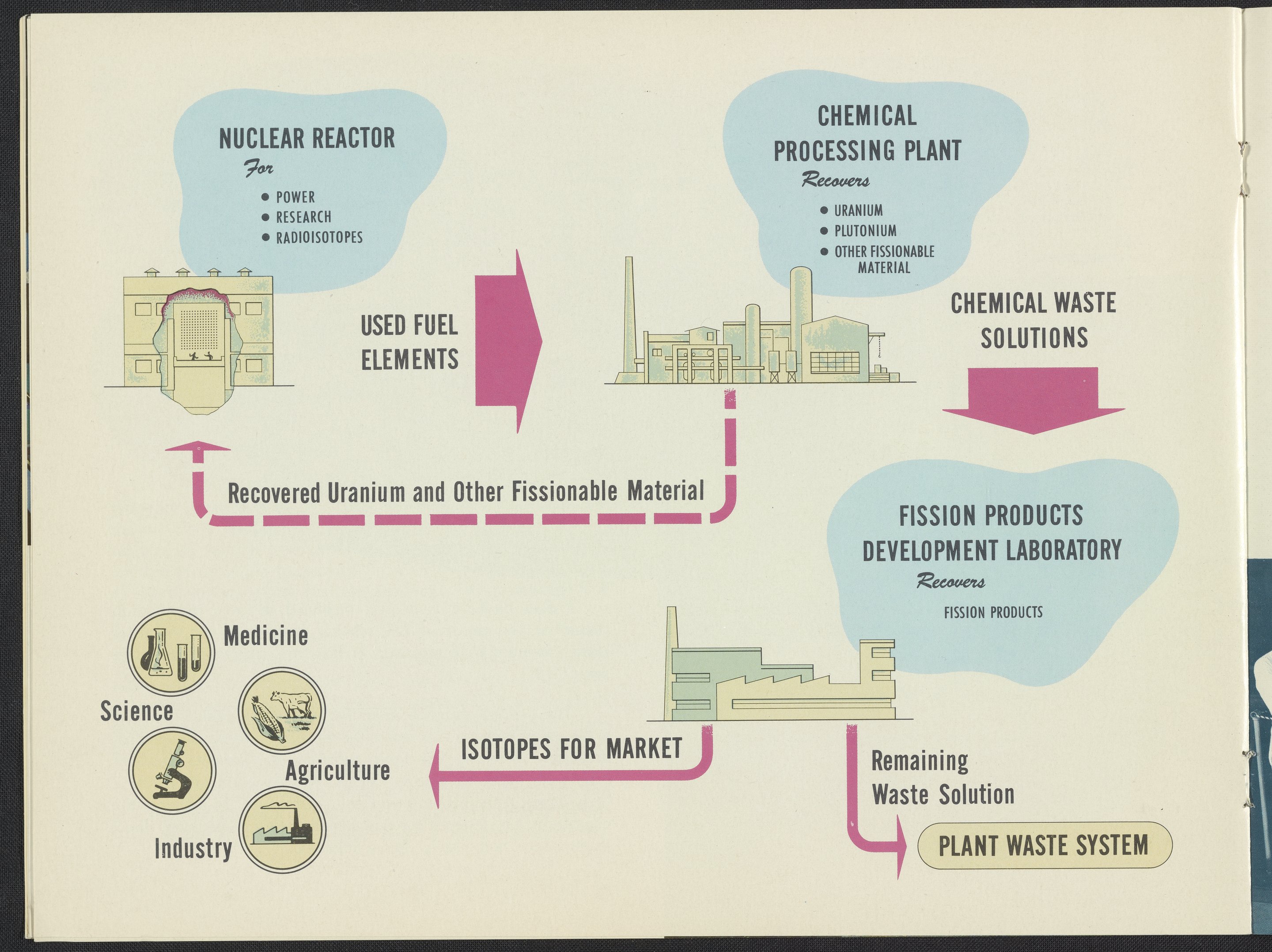 Illustration of the process of nuclear waste from reactor to development for market or waste system