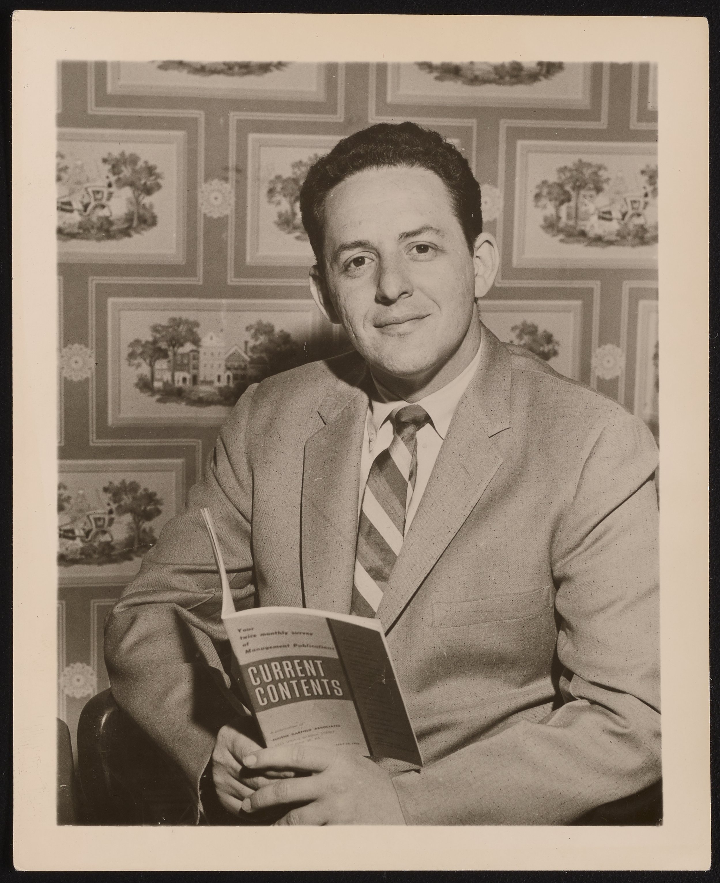 Black and white photograph of a seated Eugene Garfield (1925-2017) holding an open copy of Current Contents. Eugene Garfield was a prominent American information scientist and pioneer in the field of scientometrics. He was the founder of the Institute for Scientific Information (ISI), a renowned academic publishing service that offered scientometric and bibliographic database services and specialized in citation index and analysis. Garfield was also the inventor of the Science Citation Index (SCI), Social Sciences Citation Index (SSCI), Current Contents, and Arts and Humanities Citation Index. These inventions provided an objective and quantitative basis for analyzing information flow in scientific communication and fostered the growth of the field of scientometrics.