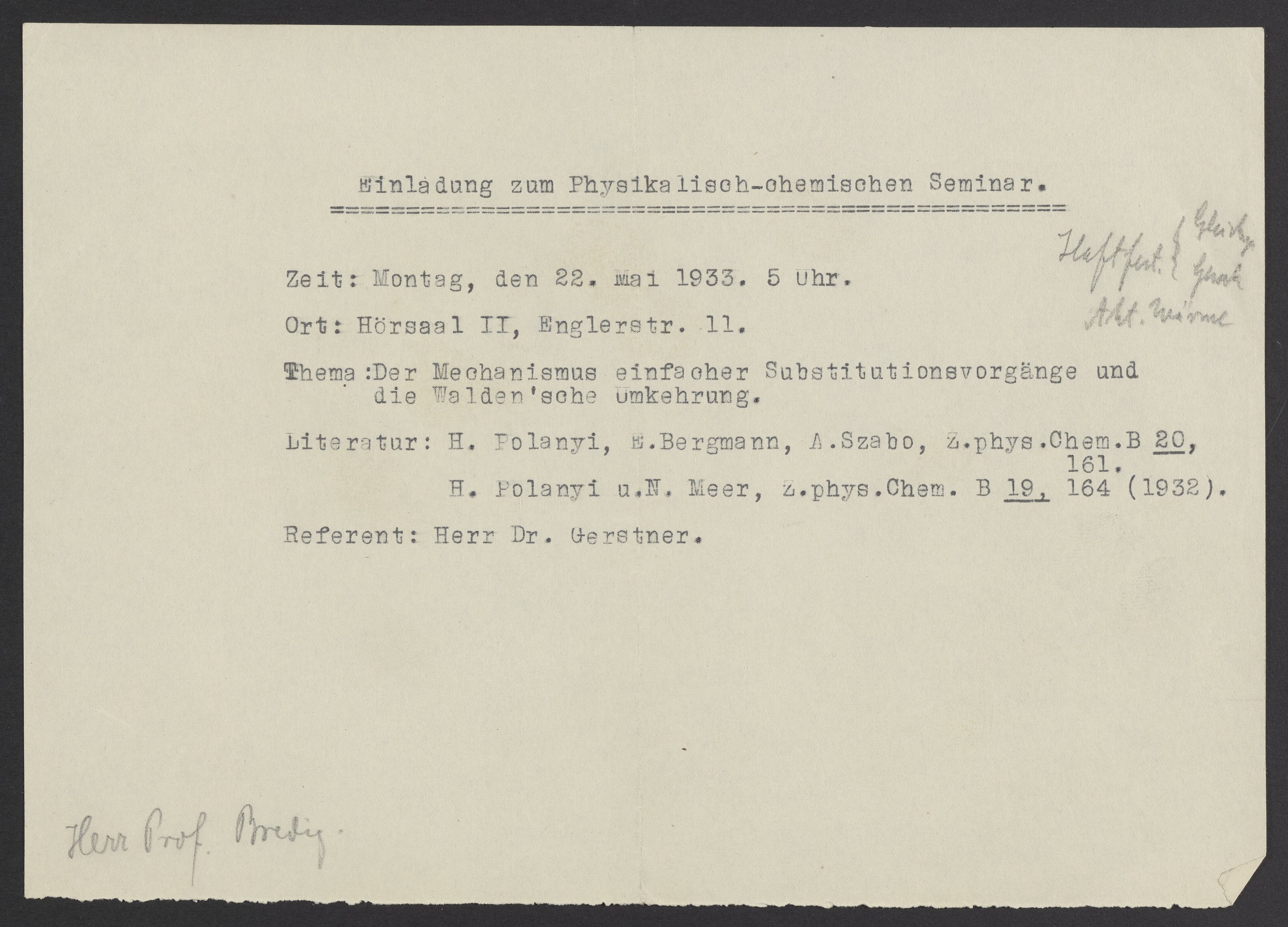 Invitation to a physical chemistry lecture, 1933