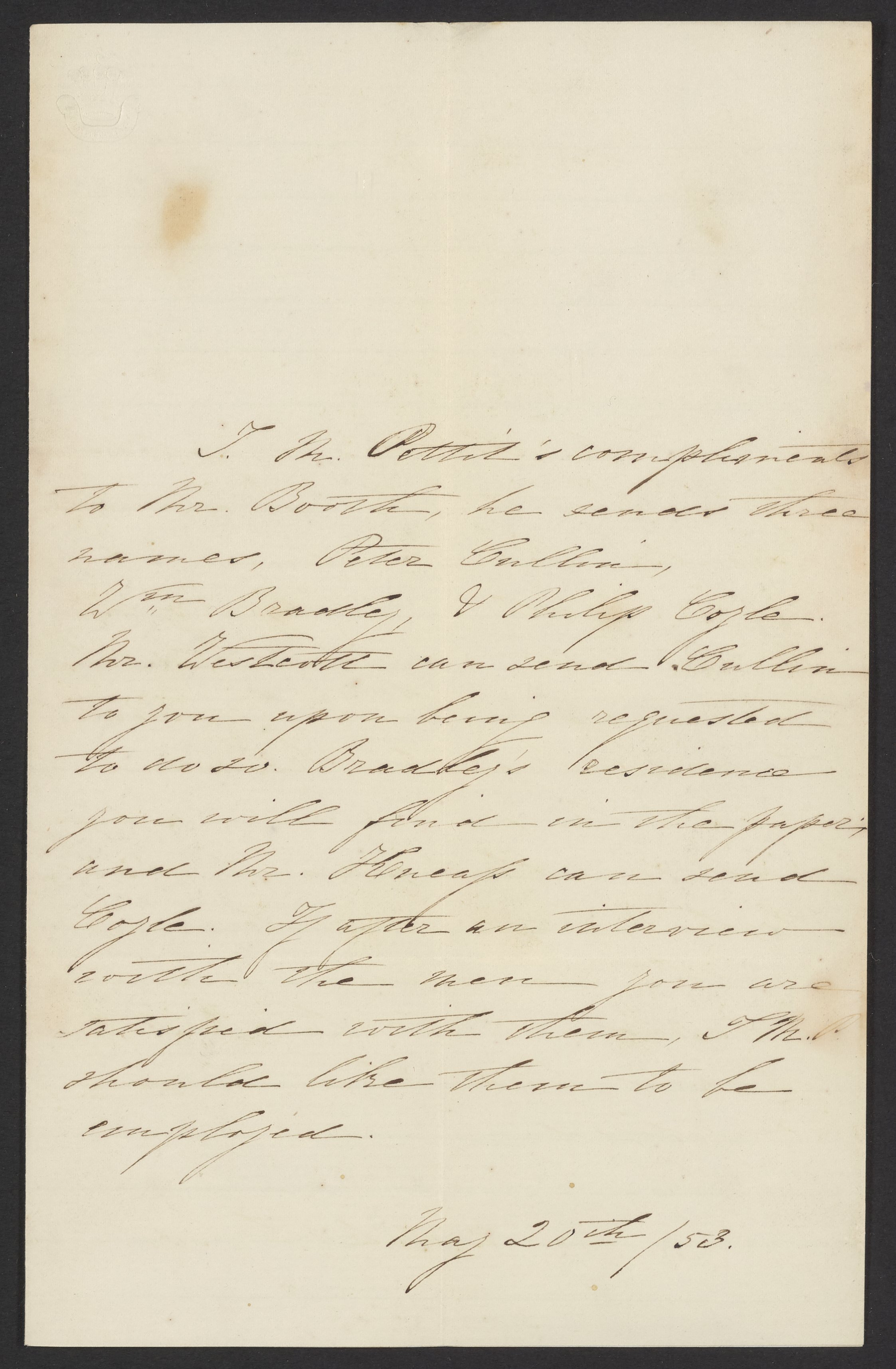 Letter from G.M. Pettit to James Curtis Booth, May 20, 1853