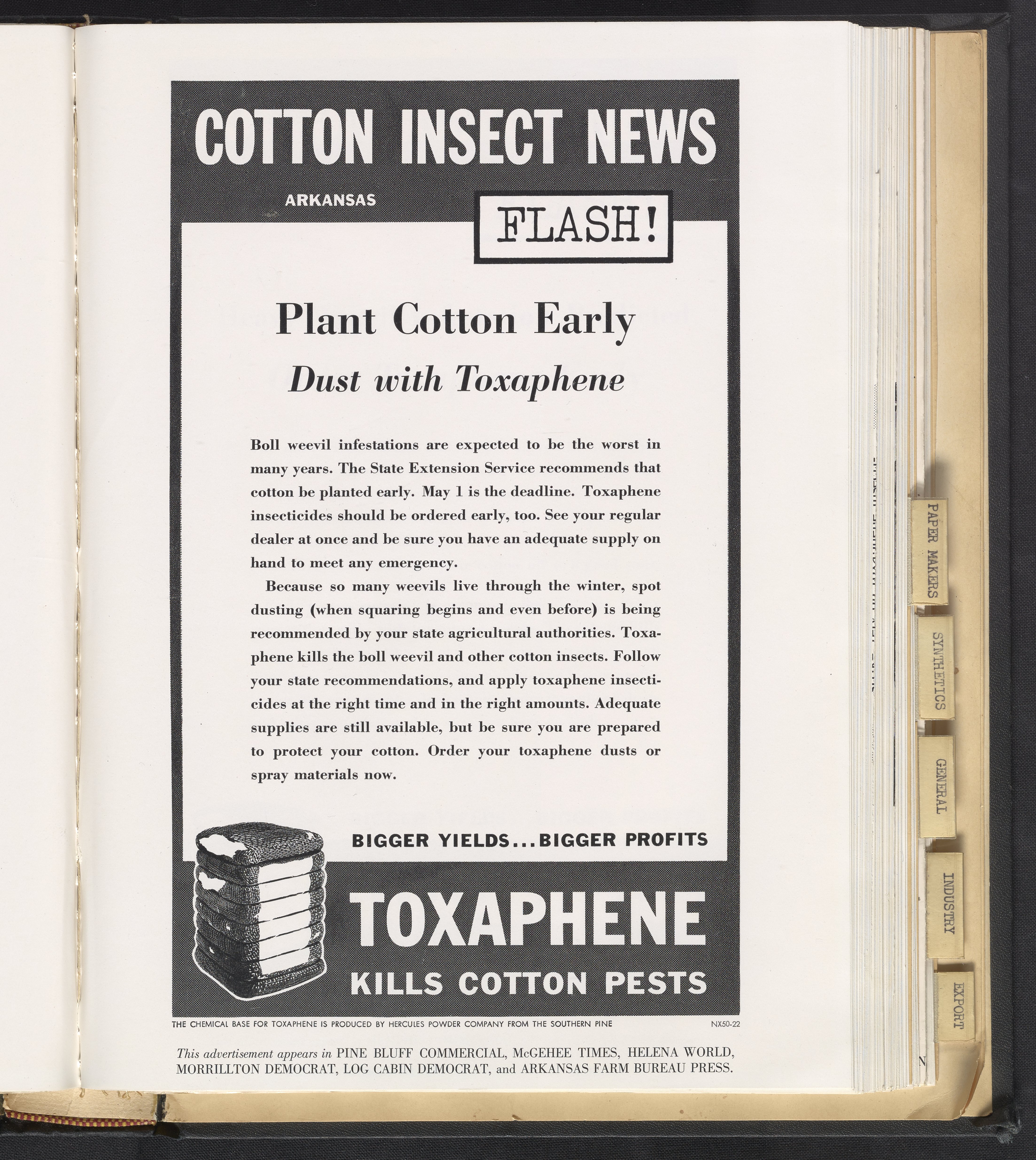 Print advertisement for toxaphene produced by Hercules Powder Company reads "Cotton Insect News Flash! Arkansas" with a bale of cotton alongside the toxaphene tagline that reads "kills cotton pests." Accompanying paragraph discusses the use of toxaphene to combat the year's predicted boll weevil infestations. This advertisement appeared in Pine Bluff Commercial, McGehee Times, Helena World, Morrillton Democrat, Log Cabin Democrat, and Arkansas Farm Bureau Press.
