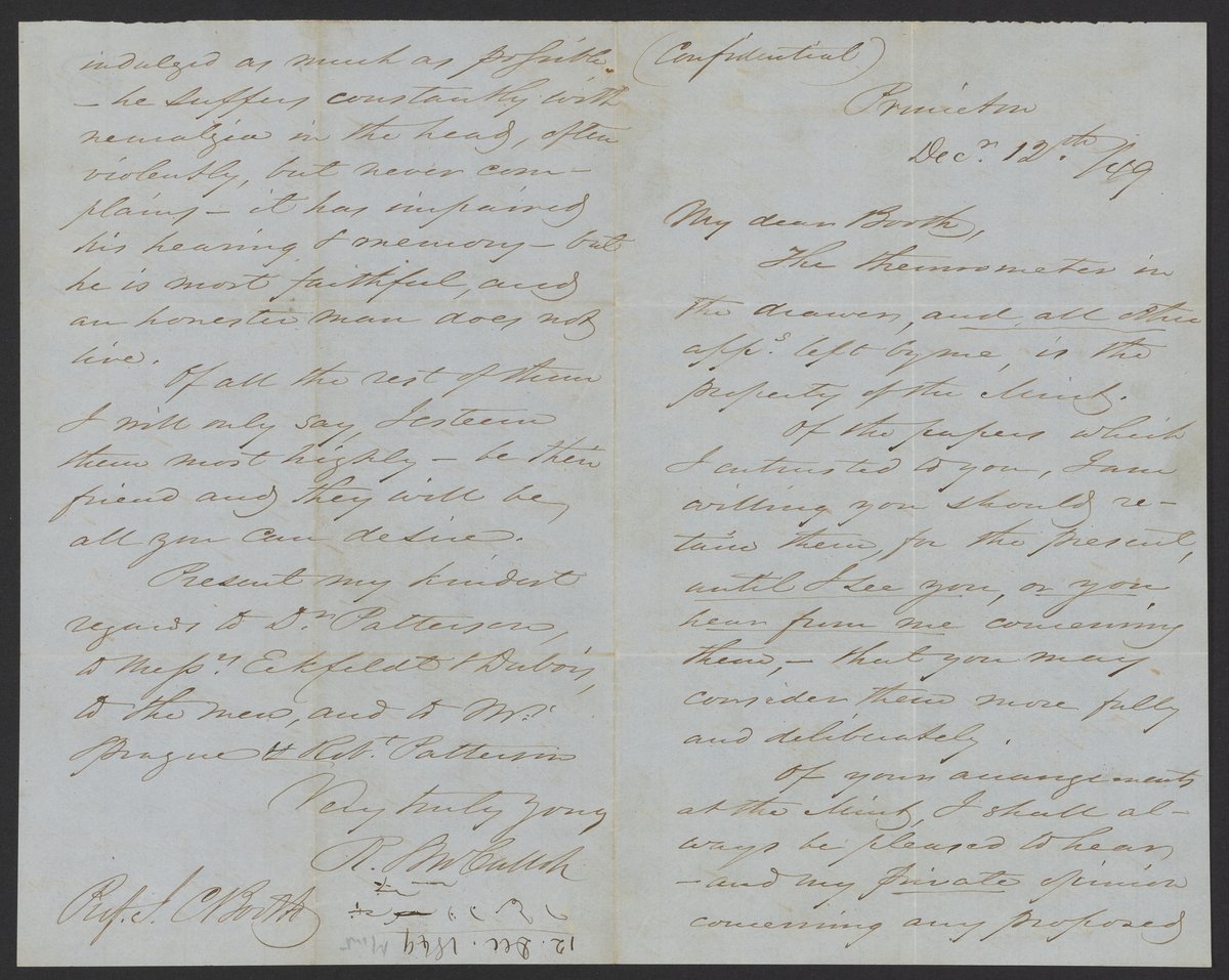 Small JPG1200 x 957px — 199 KBLarge JPG2880 x 2298px — 988 KBFull-sized JPG4052 x 3233px — 1.8 MBOriginal fileTIFF — 4052 x 3233px — 37.5 MBLetter marked "confidential" discussing business of the United States Mint. Richard S. McCulloh (1818-1894) studied chemistry in Philadelphia with James Curtis Booth (1810-1888) from 1838 to 1839. From 1846 to 1849 he worked for the U.S. Mint in Philadelphia.