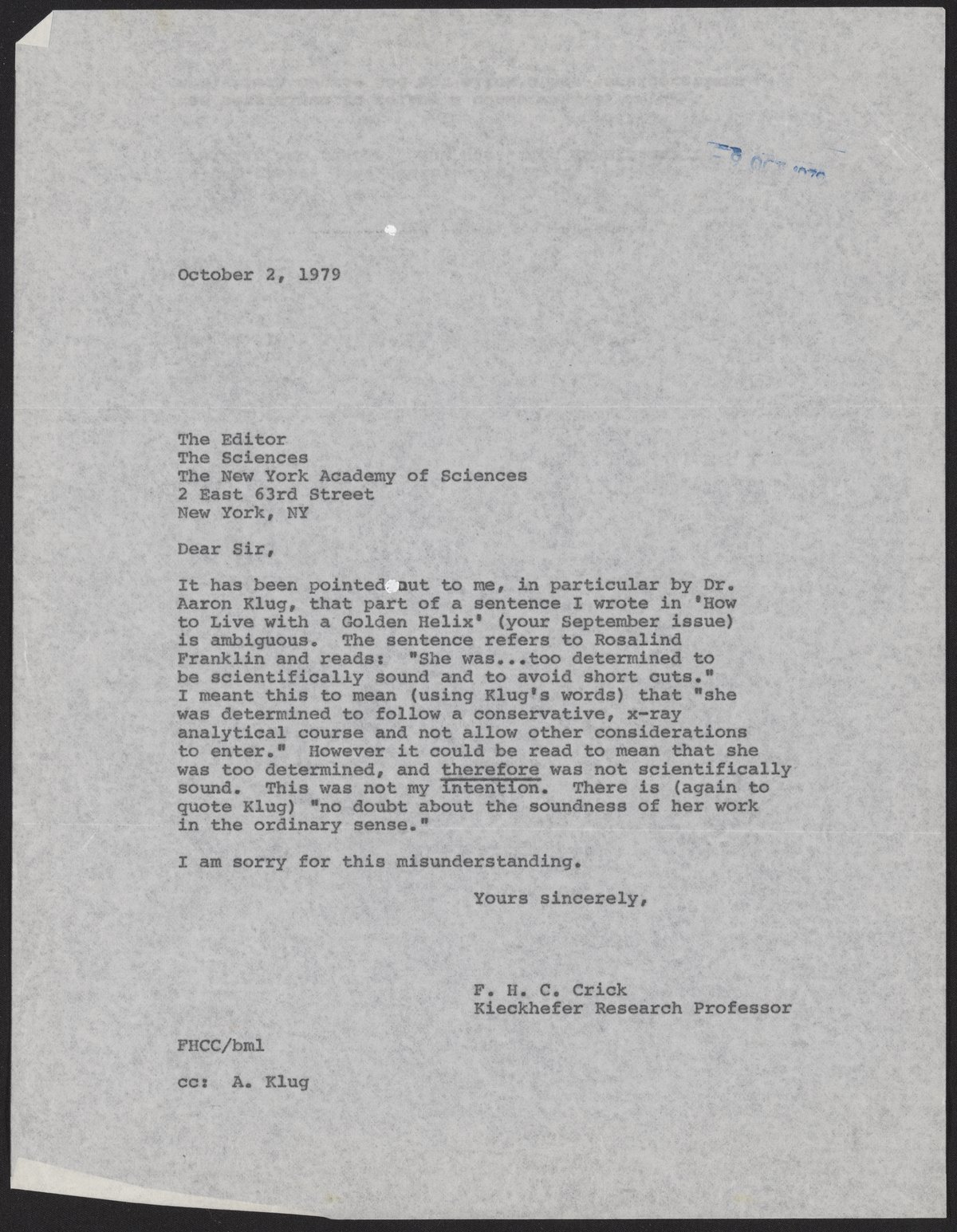 The second letter, written on October 2, 1979, by Francis Crick to the editor of The Sciences. Crick provides clarity to a sentence written in his article and states that he did not intend to imply that Franklin was not scientifically sound.