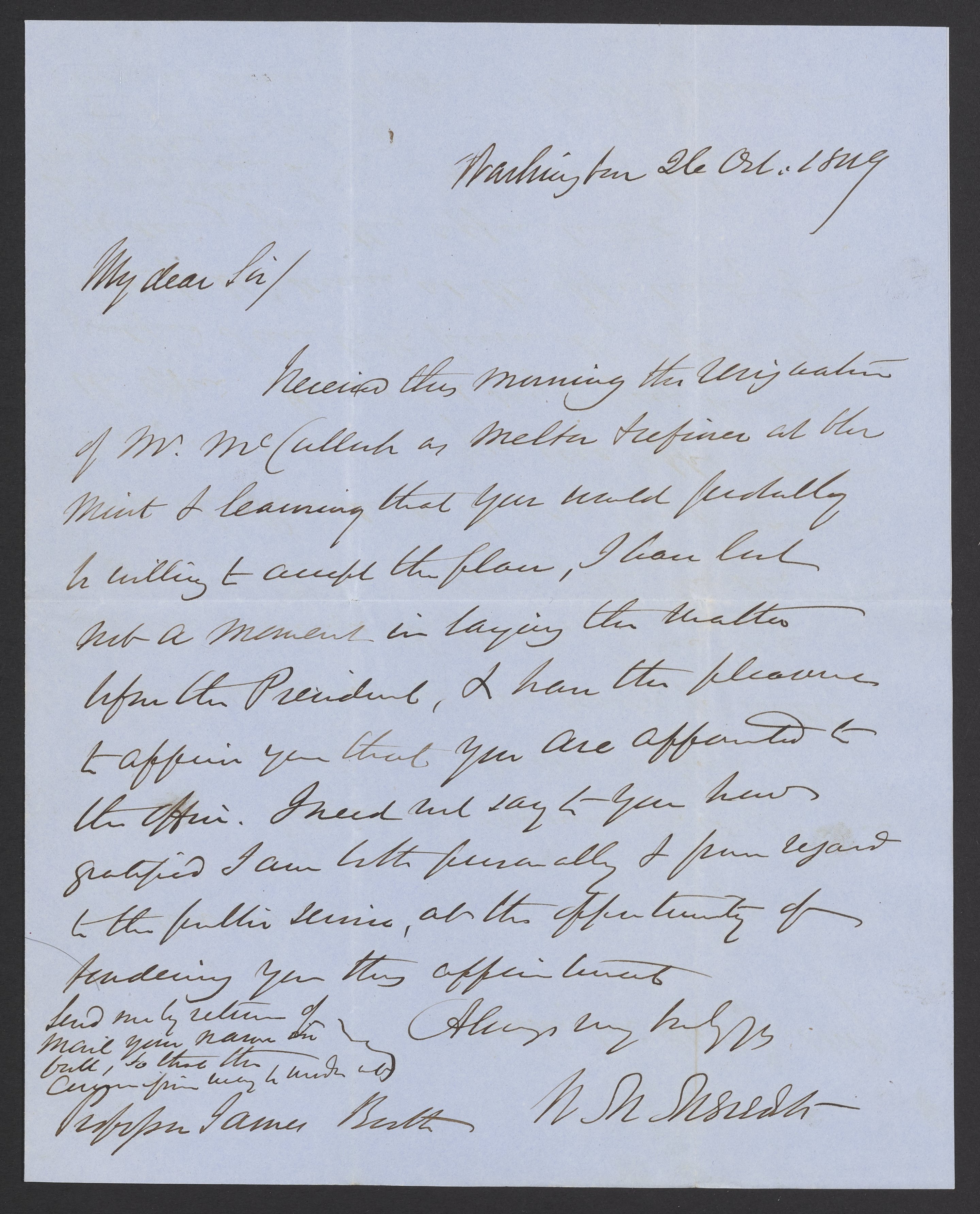 William M. Meredith (1799-1873) an American lawyer and politician from Philadelphia, Pennsylvania who served as the United States Secretary of the Treasury during President Zachary Taylor's Administration, writes to appoint James Curtis Booth (1810-1888) as the Melter & Refiner of the United States Mint.