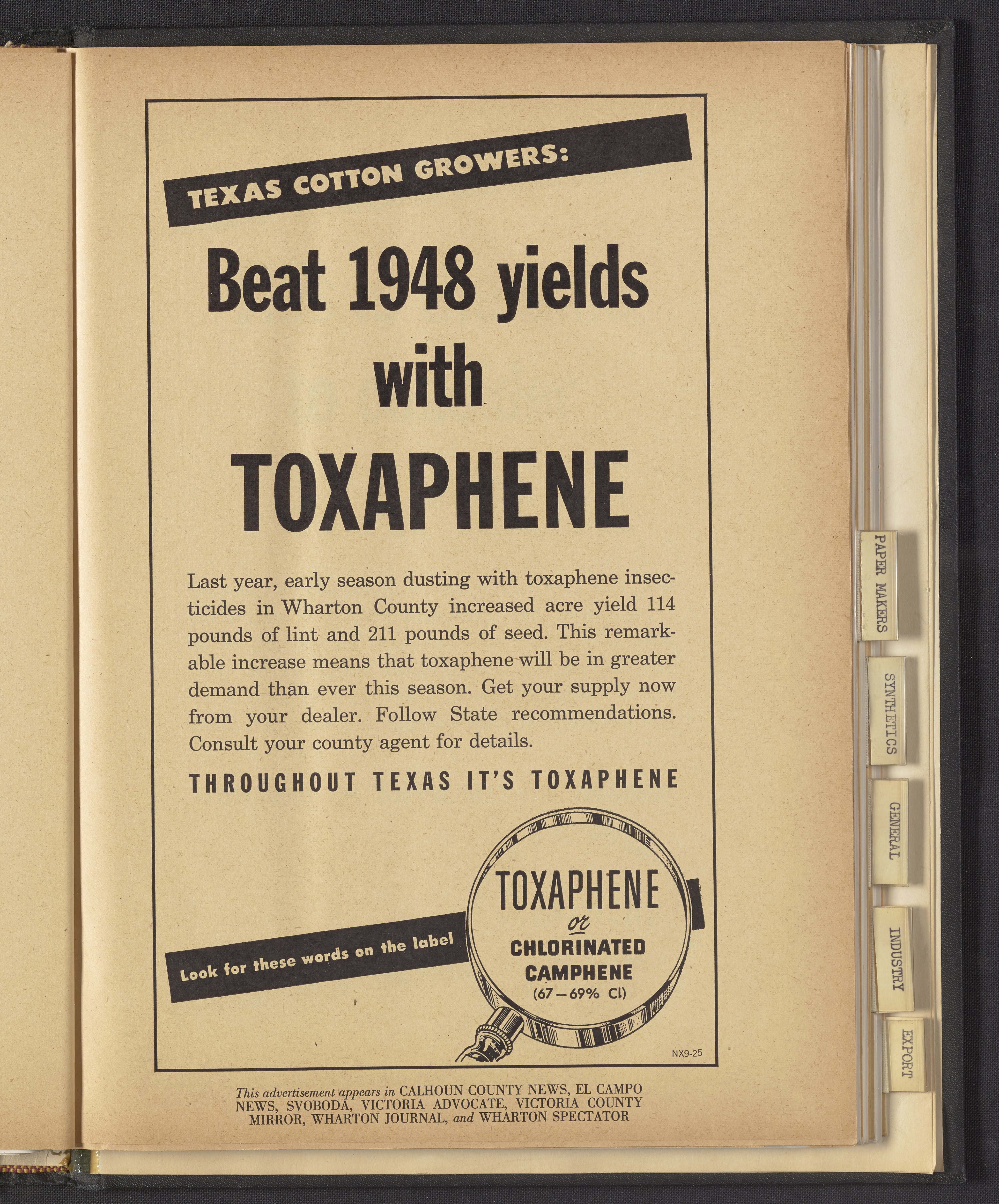 Hercules Incorporated. “Texas Cotton Growers: Beat 1948 Yields with Toxaphene.” 1949 Hercules Advertisements, 1949. Records of Hercules Incorporated, Volume 1949. Science History Institute. Philadelphia. https://digital.sciencehistory.org/works/wm117p56k.