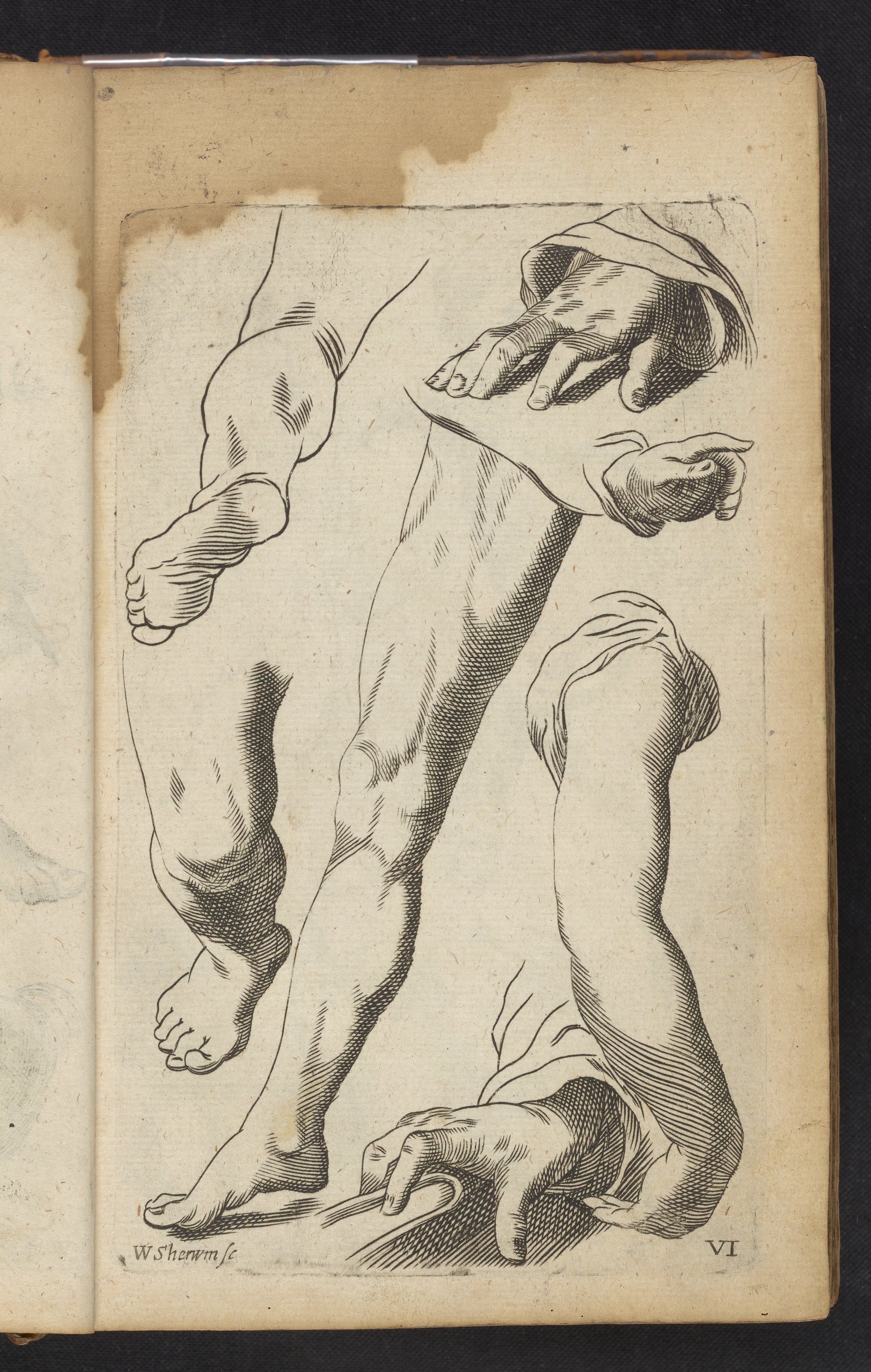 Salmon, William. “Plate VI: Artist Study of Legs, Arms, Hands and Feet.” In Polygraphice, or, the Arts of Drawing, Engraving, Etching, Limning, Painting, Washing, Varnishing, Gilding, Colouring, Dying, Beautifying and Perfuming. London, England: Printed for Thomas Passinger at the Three Bibles on London Bridge and Thomas Sawbridge at the Three Flower de Luces in Little-Brittain, 1685. https://digital.sciencehistory.org/works/wm117p983.
