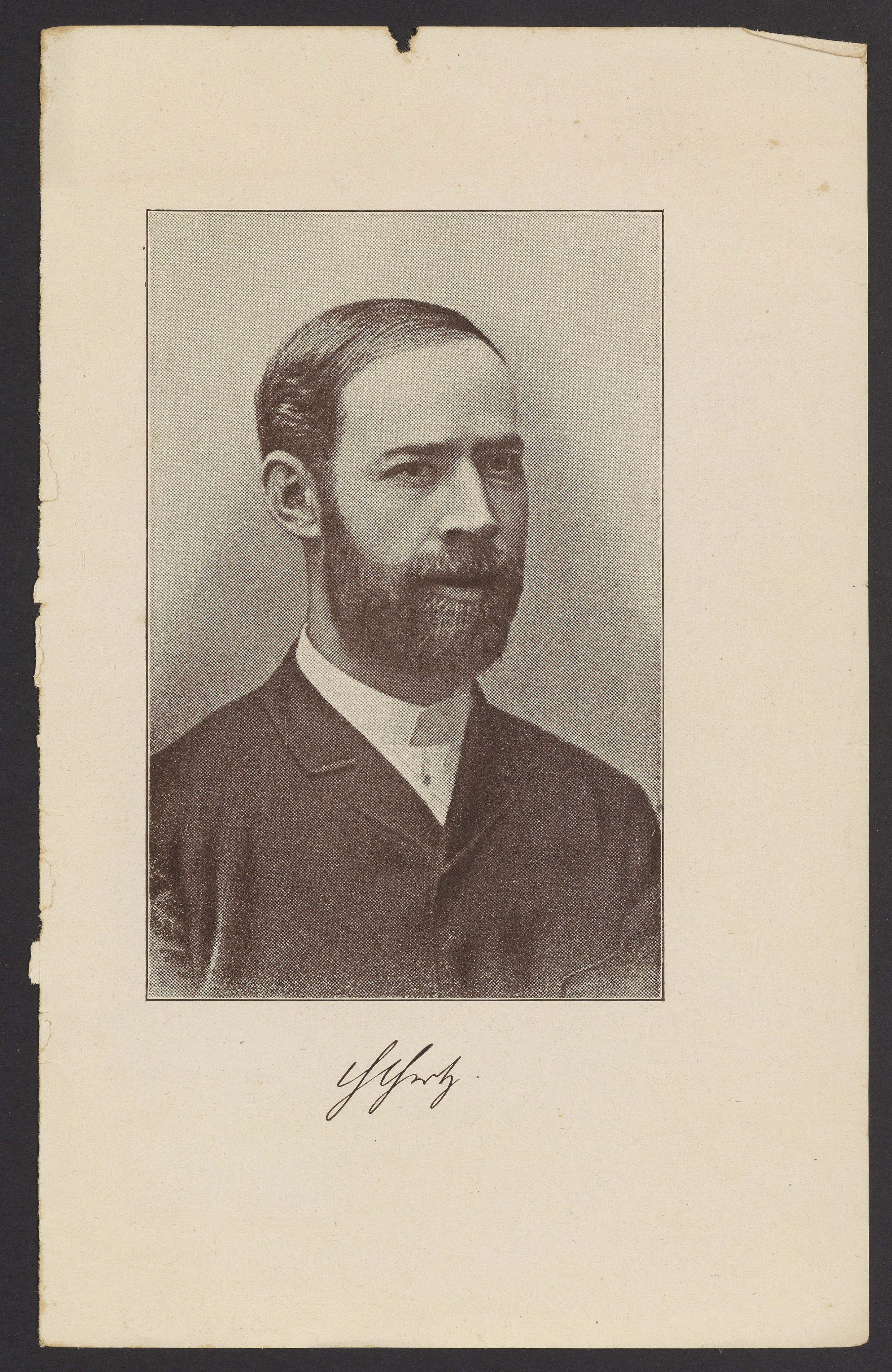 Black and white printed portrait of a scientist with an indecipherable autograph beneath.