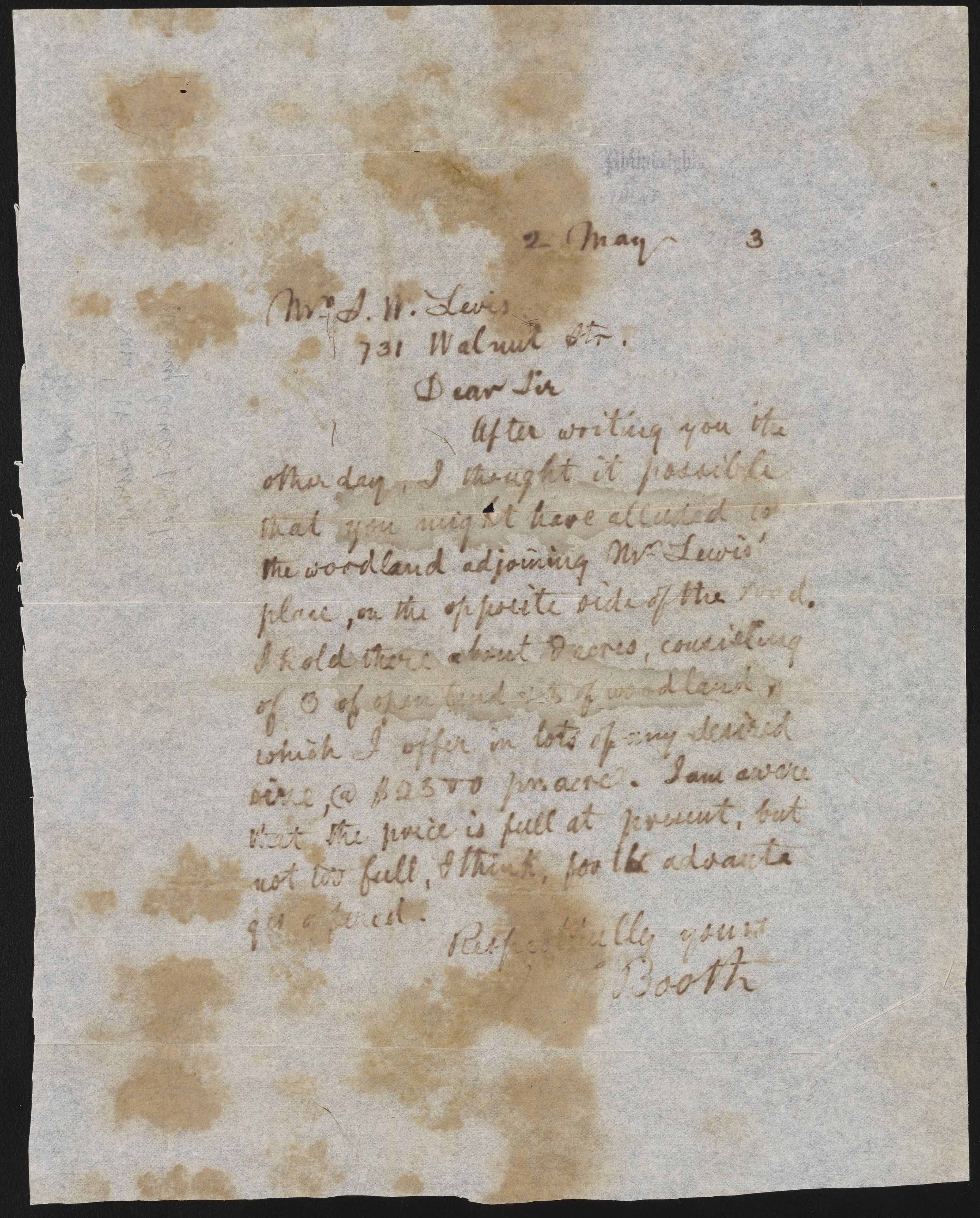 Small JPG1200 x 1491px — 376 KBLarge JPG2880 x 3579px — 2.2 MBFull-sized JPG5183 x 6441px — 6.3 MBOriginal fileTIFF — 5183 x 6441px — 95.6 MBJames Curtis Booth (1810-1888) describes a property he wishes to sell to Samuel W. Levis.