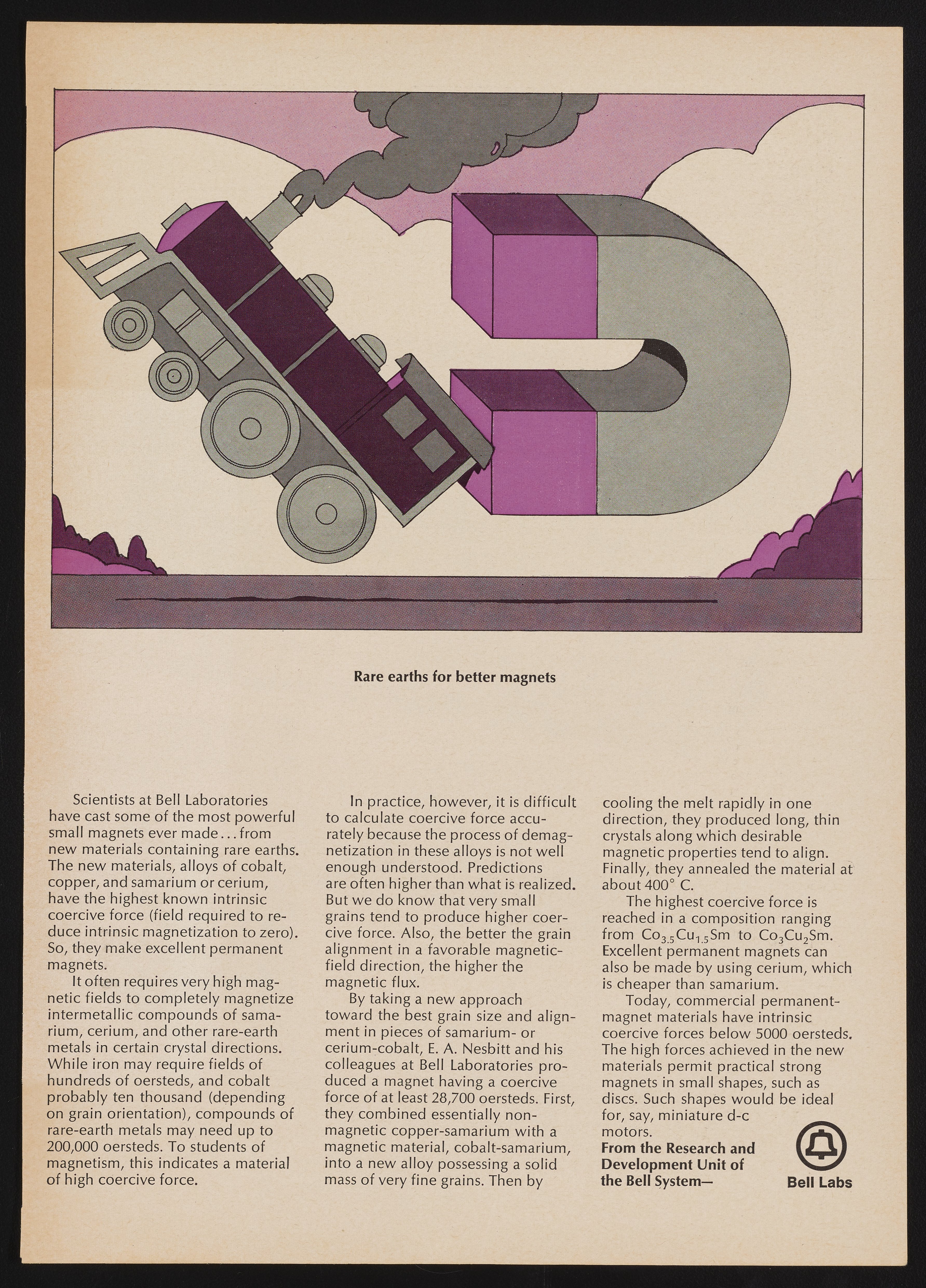 Bell Telephone Laboratories. “Rare Earths for Better Magnets.” Paper (fiber product), 1970. Science History Institute. Philadelphia. https://digital.sciencehistory.org/works/woakd5x.