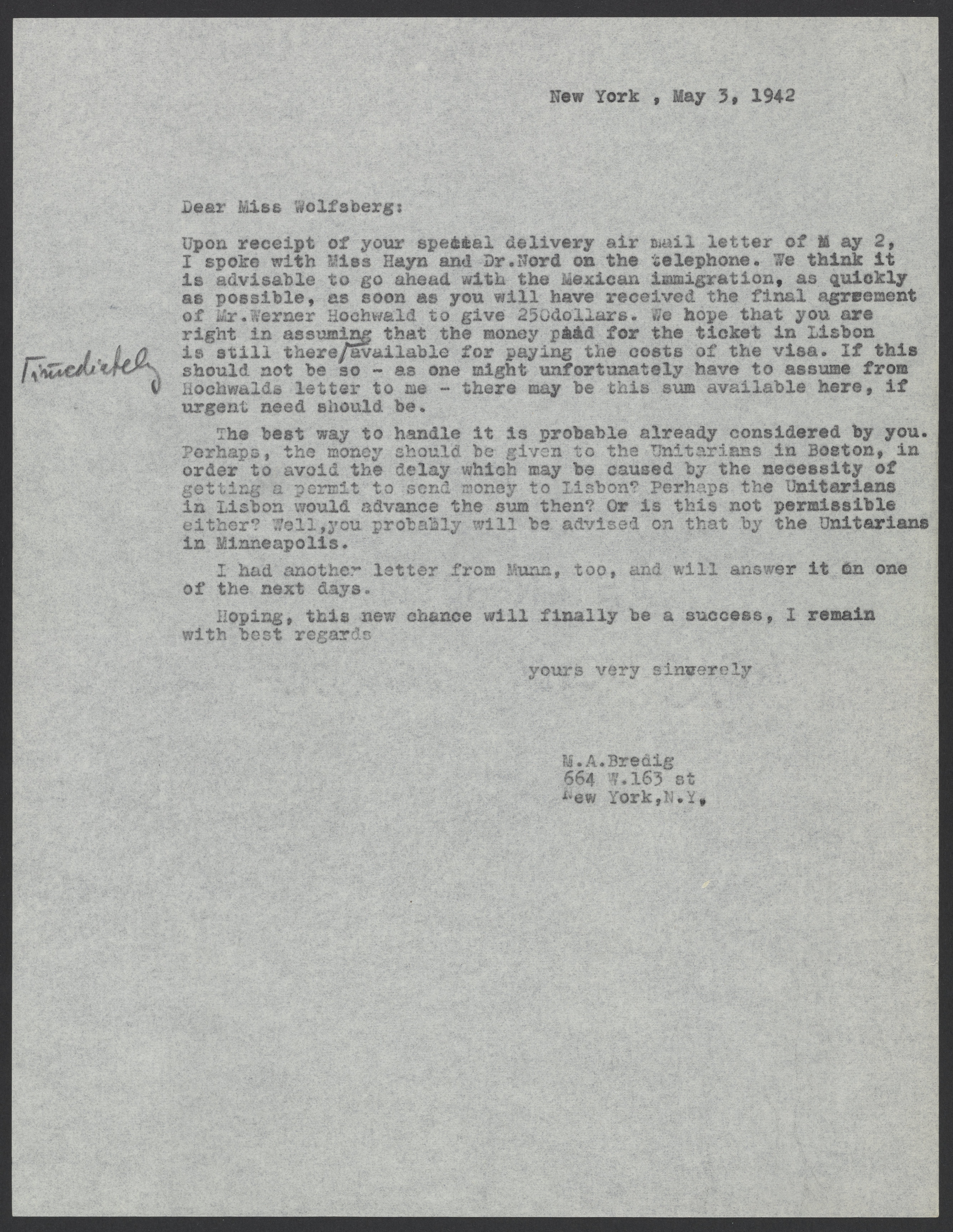 Max Bredig (1902-1977) recommends that Fritz Hochwald (1897-1968) pursue immigration to Mexico as soon as possible.