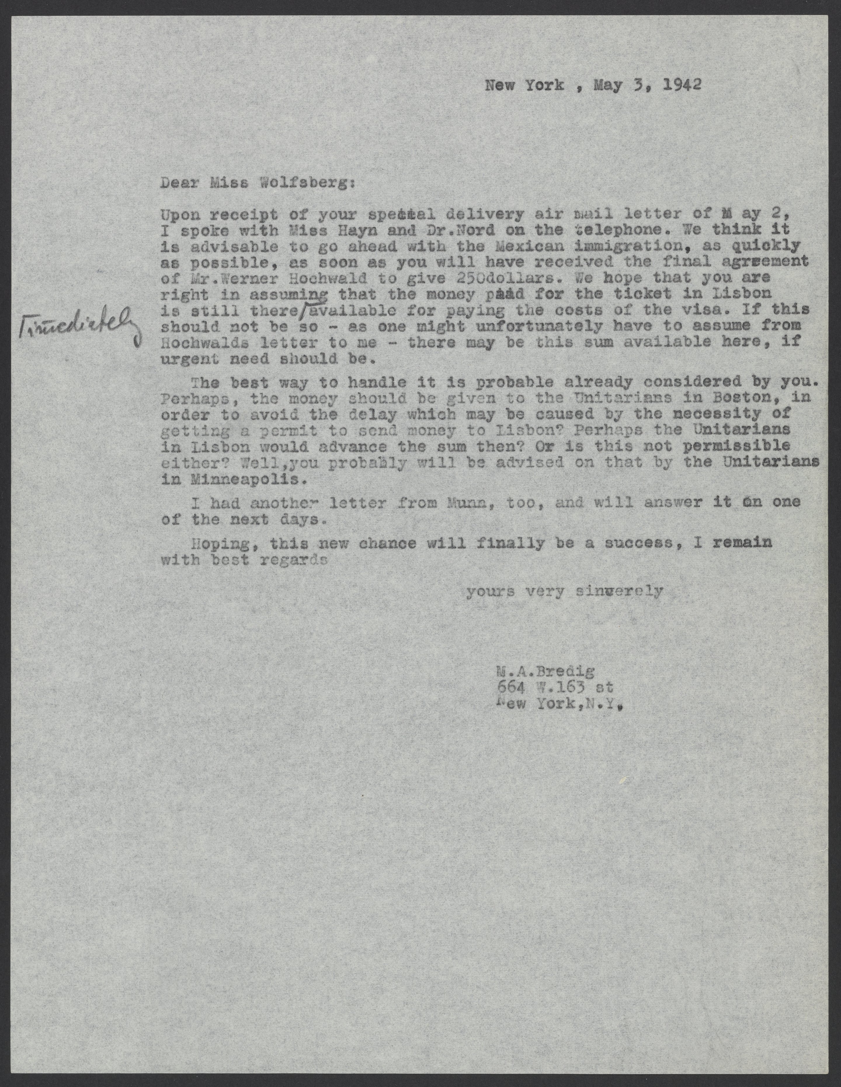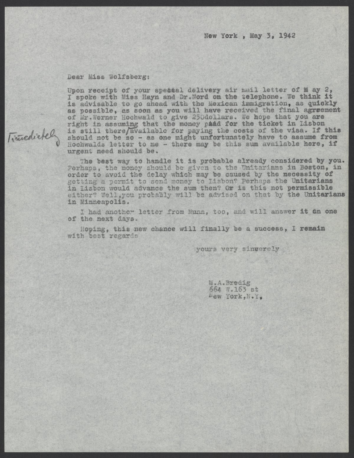 Letter from Max Bredig to Ilse Wolfsberg, May 3, 1942