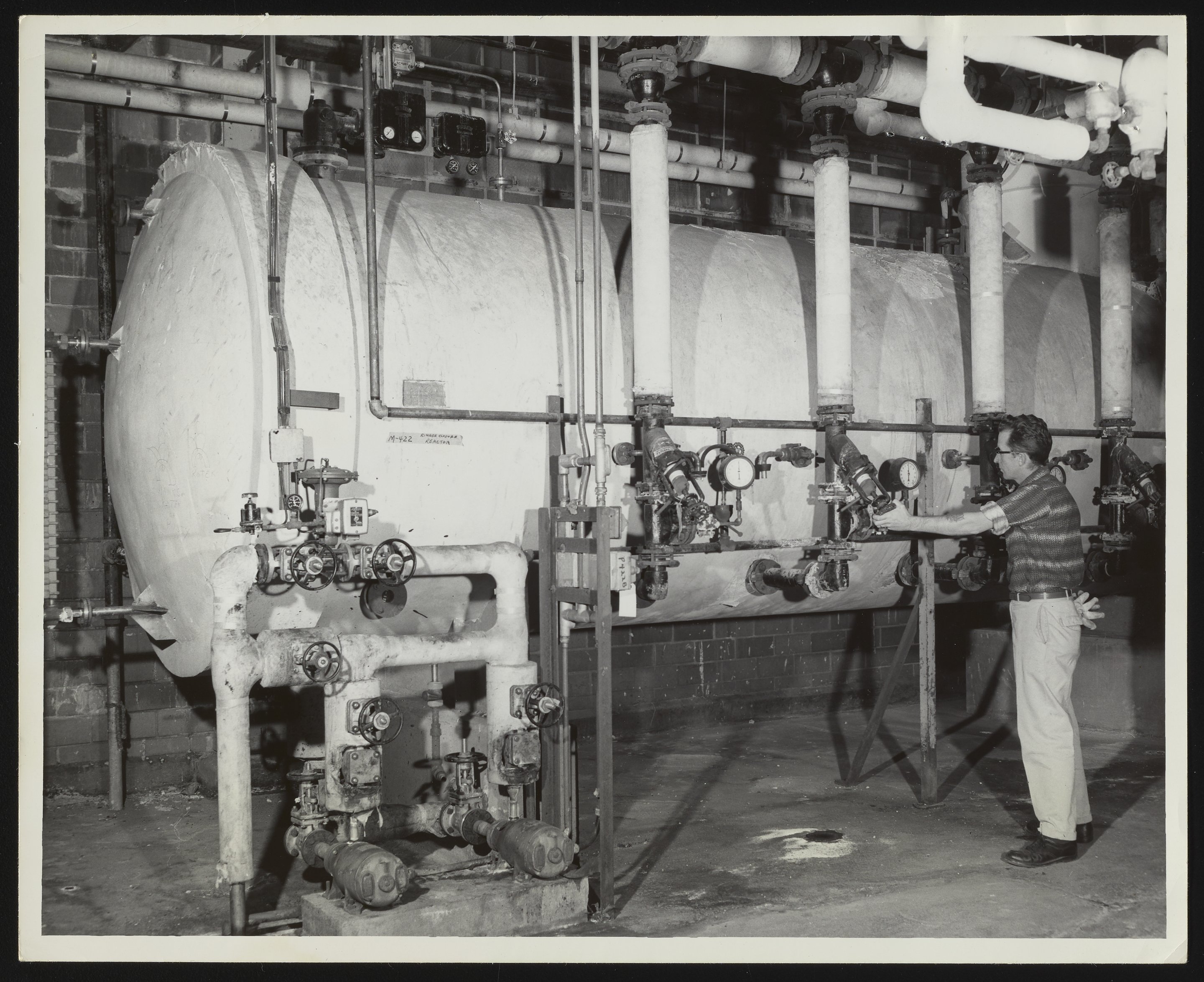 General view of a ring closure reactor used in the production of Penton, a chlorinated polyether used as an ingredient in protective coatings for structural steel and other metals, papers, cardboard, and plastics, at the Hercules Powder Company plant in Parlin, New Jersey. The employee visible in the photograph is unidentified. Per notations accompanying the photograph, the ring closure reactor was used to form BCMO, a type of monomer, from Pentaerythritol Trichloro Monoacetate, a key intermediate useful in the production of films, filaments, and plastics.