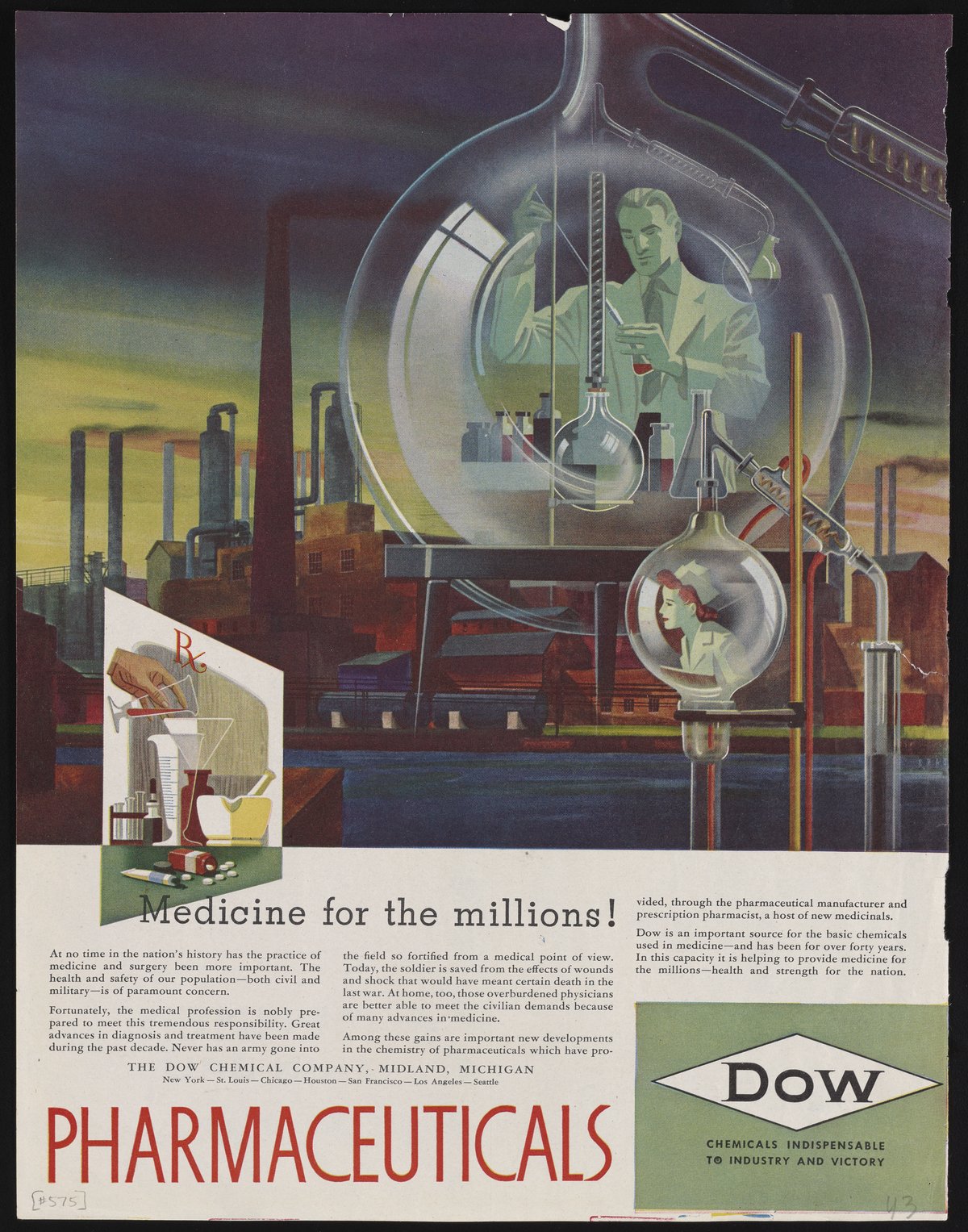 Dow Chemical Company. “Medicine for the Millions!,” 1943. Advertisements from the Dow Chemical Historical Collection, Box 9. Science History Institute. Philadelphia. https://digital.sciencehistory.org/works/wrdbluu.