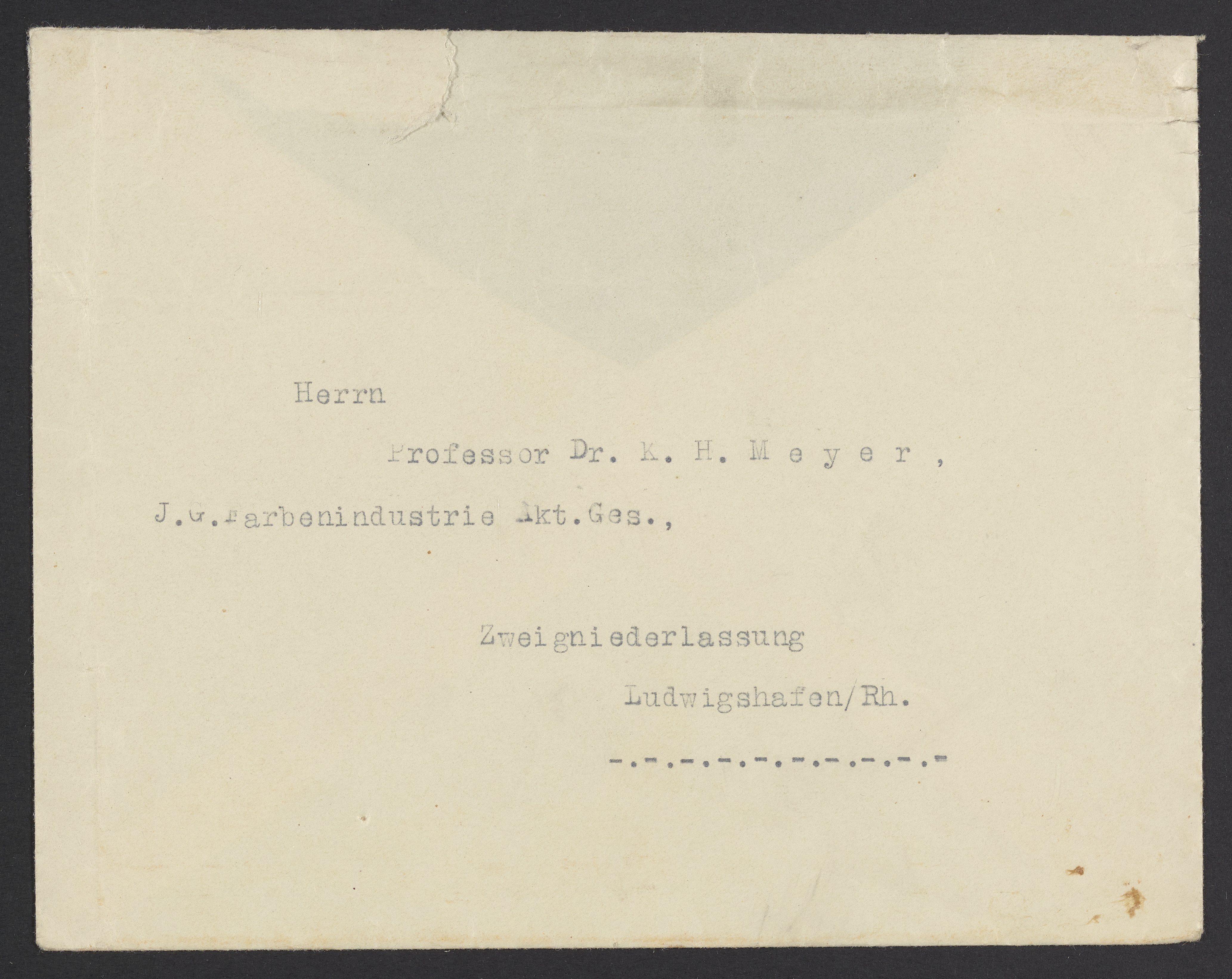 Small JPG1200 x 1513px — 224 KBLarge JPG2880 x 3630px — 1.4 MBFull-sized JPG5678 x 7157px — 5.7 MBOriginal fileTIFF — 5678 x 7157px — 116 MBFritz Haber (1868-1934) writes to Kurt Hans Meyer (1883-1952) about Max Albert Bredig (1902-1977) studying X-ray imaging under Dr. Herman Mark (1895-1992). Before Bredig can begin with Mark, the managers at I. G. Farben must approve the request.