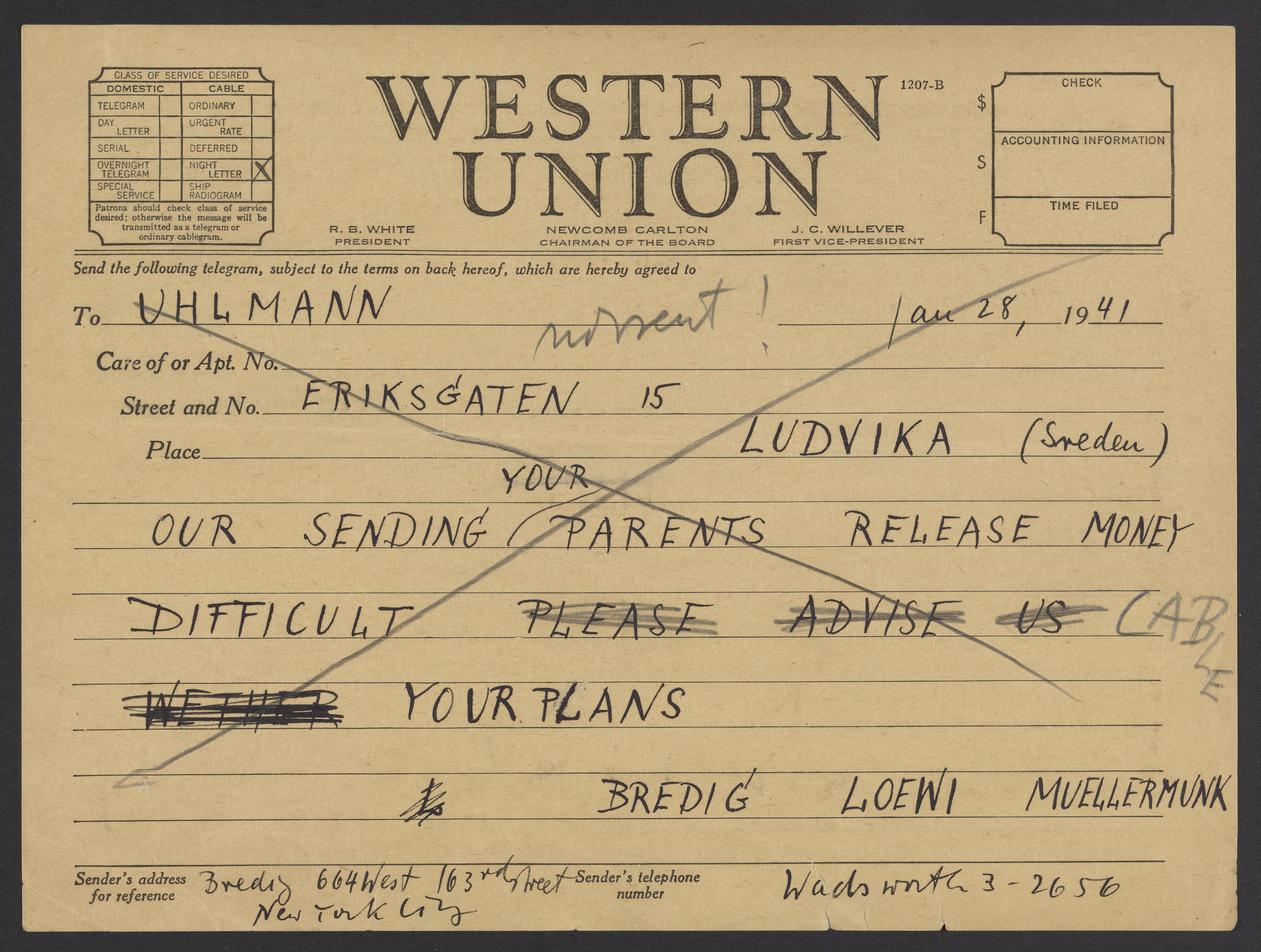 Telegram from Max Bredig to Uhlmann