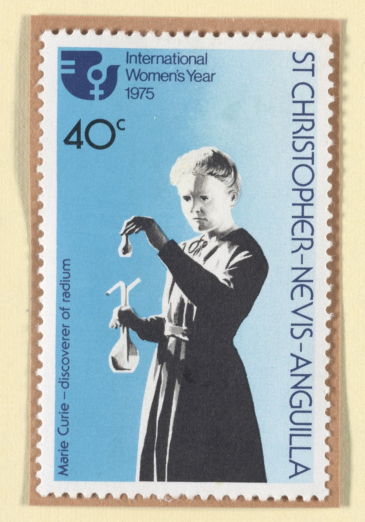 Stamp issued during International Women's Year (1975), depicting Marie Curie, "discoverer of radium," by the former British colony Saint Christopher-Nevis-Anguilla (now called the Federation of Saint Kitts and Nevis.)