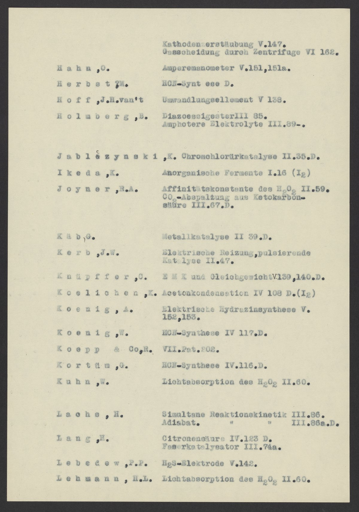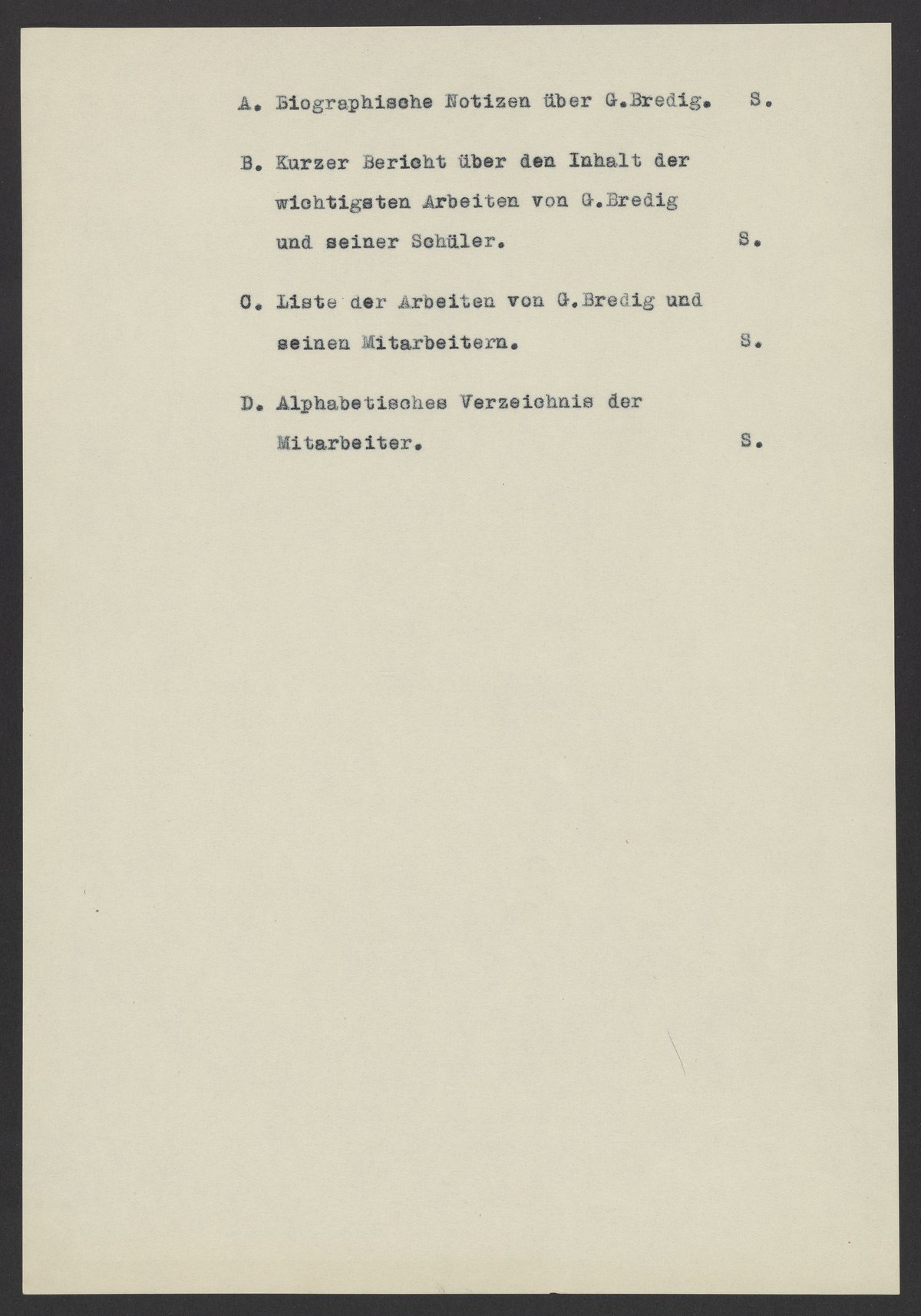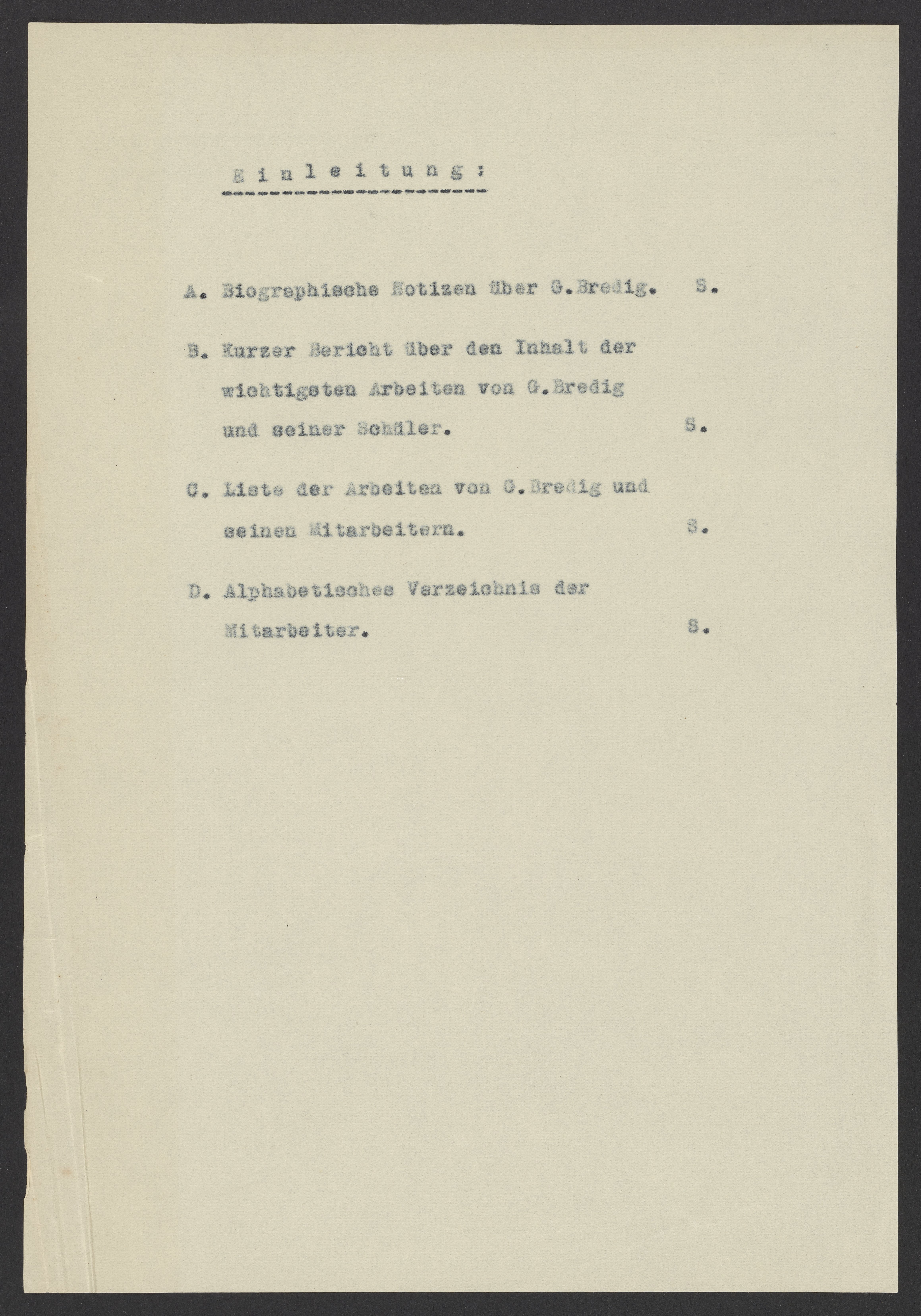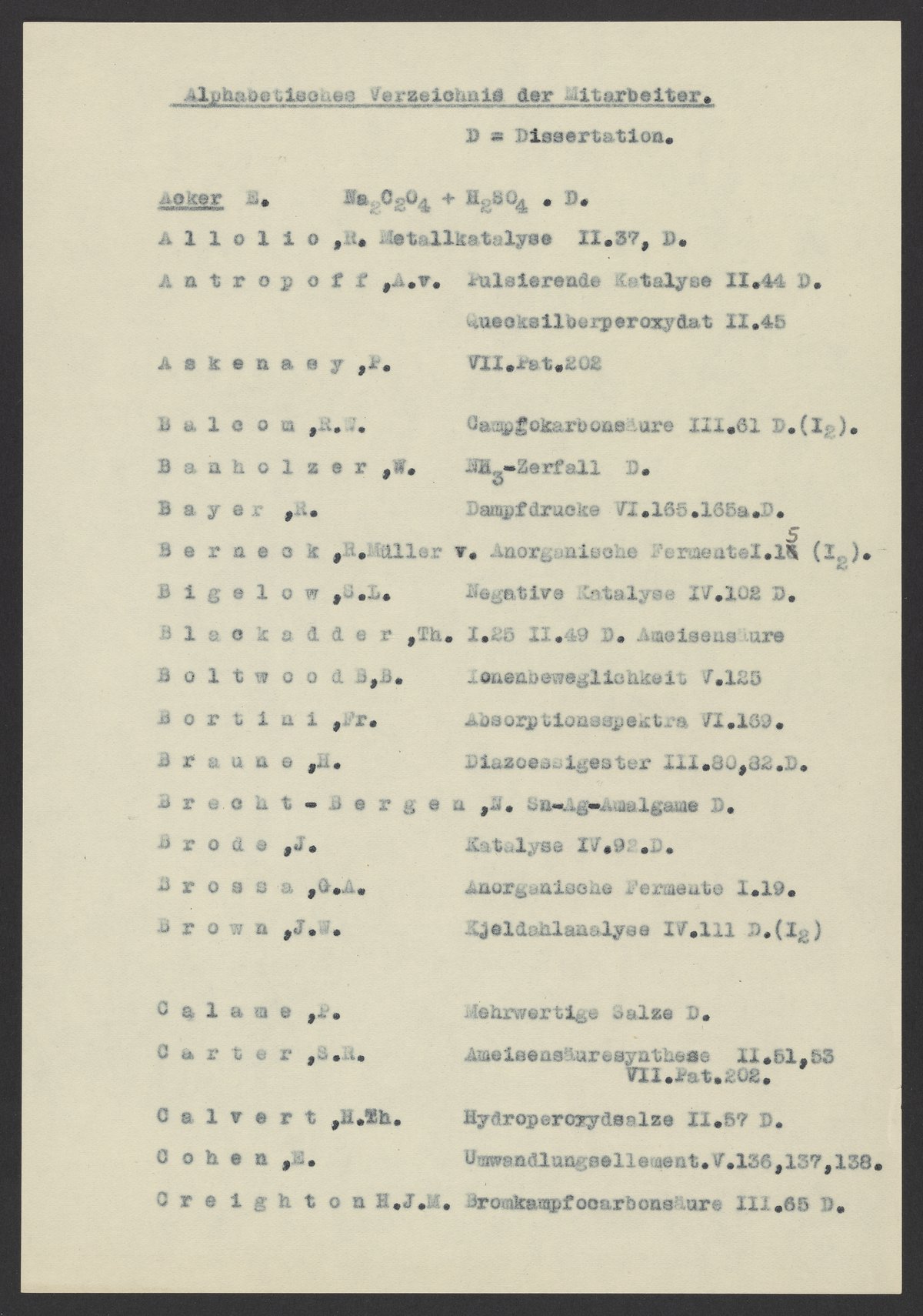 Includes a table of contents and an alphabetical list of Georg Bredig's (1868-1944) employees.