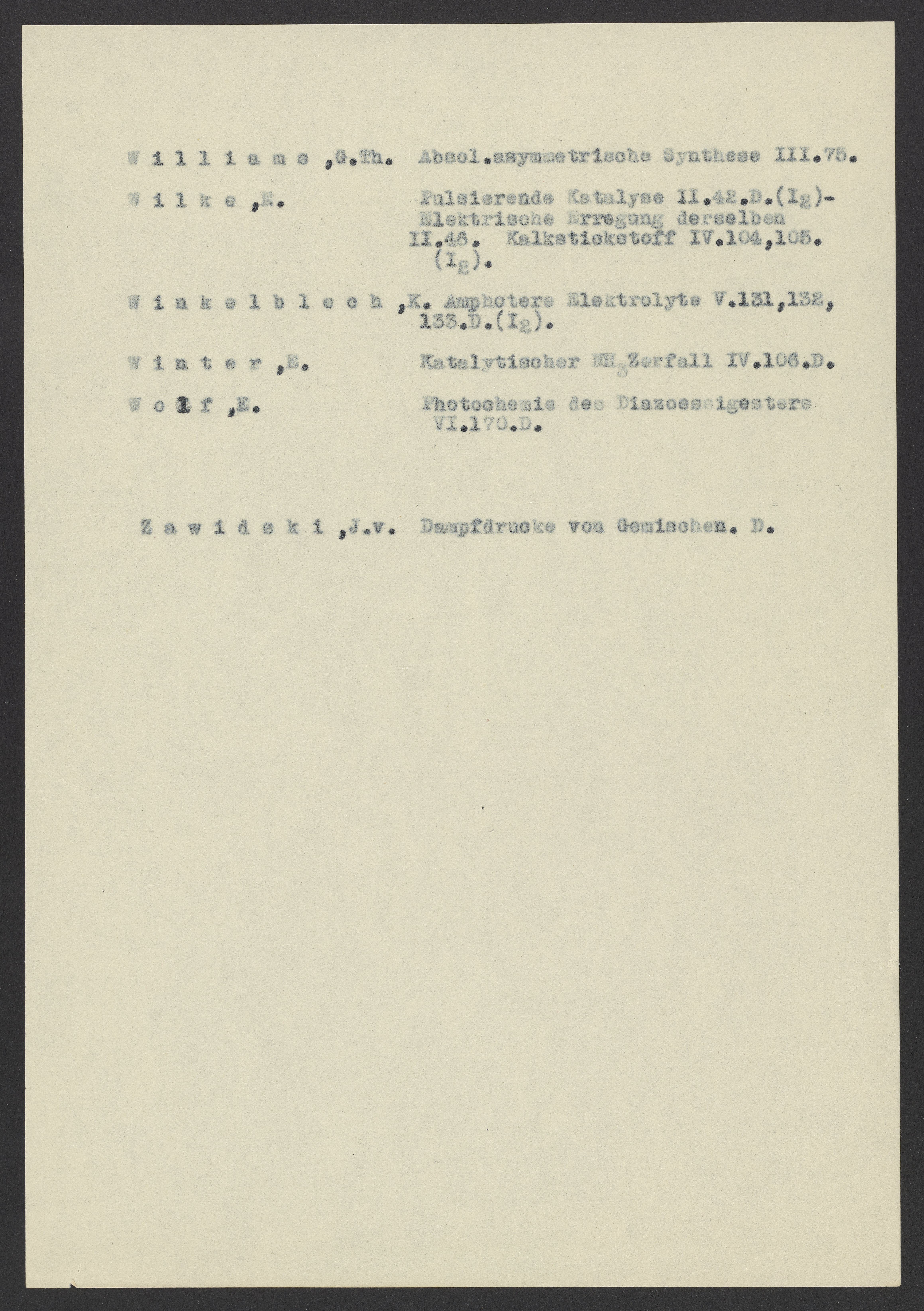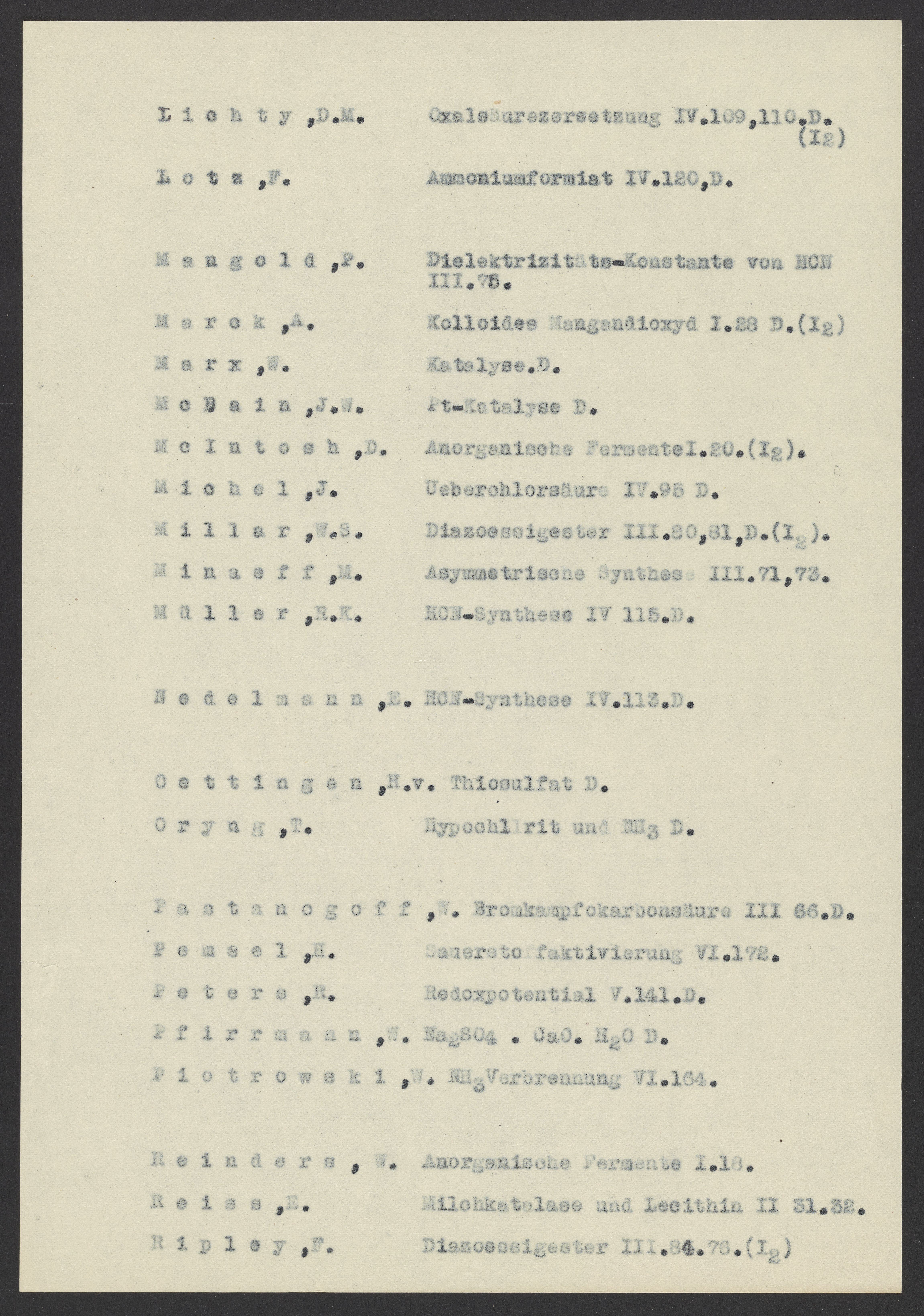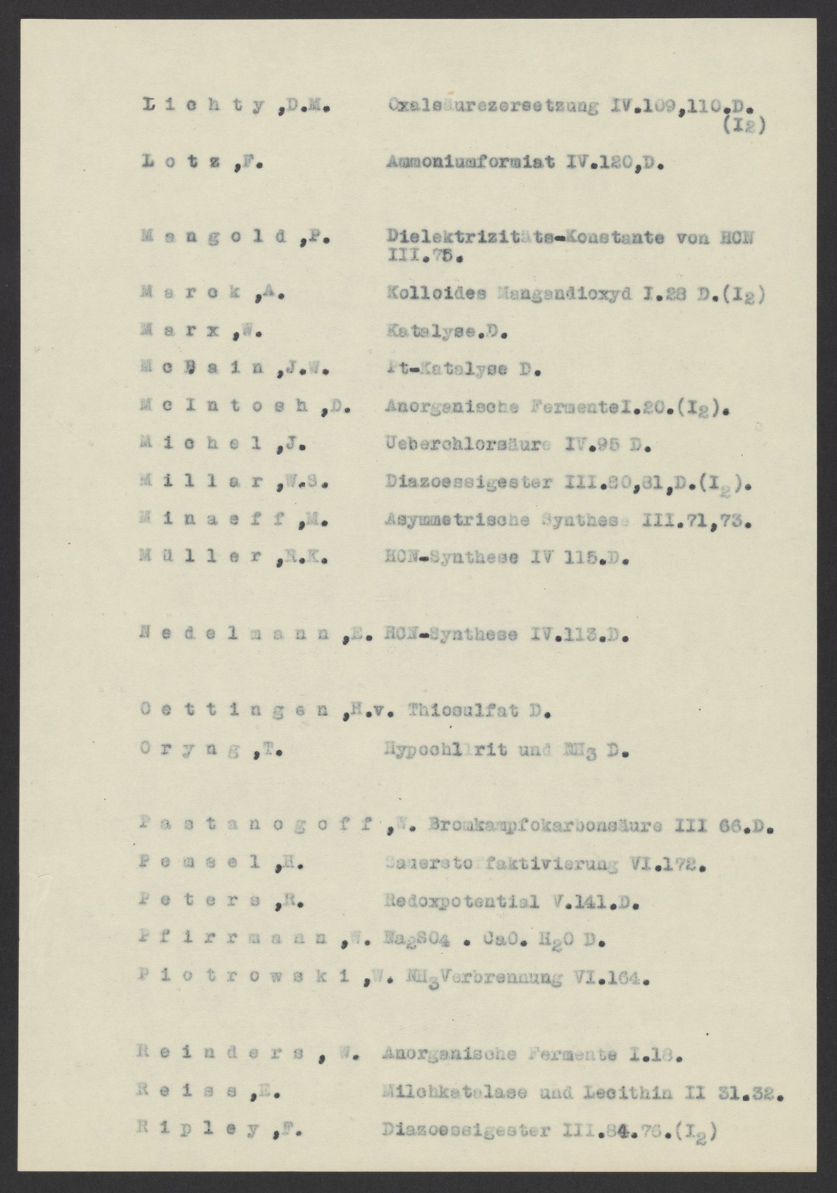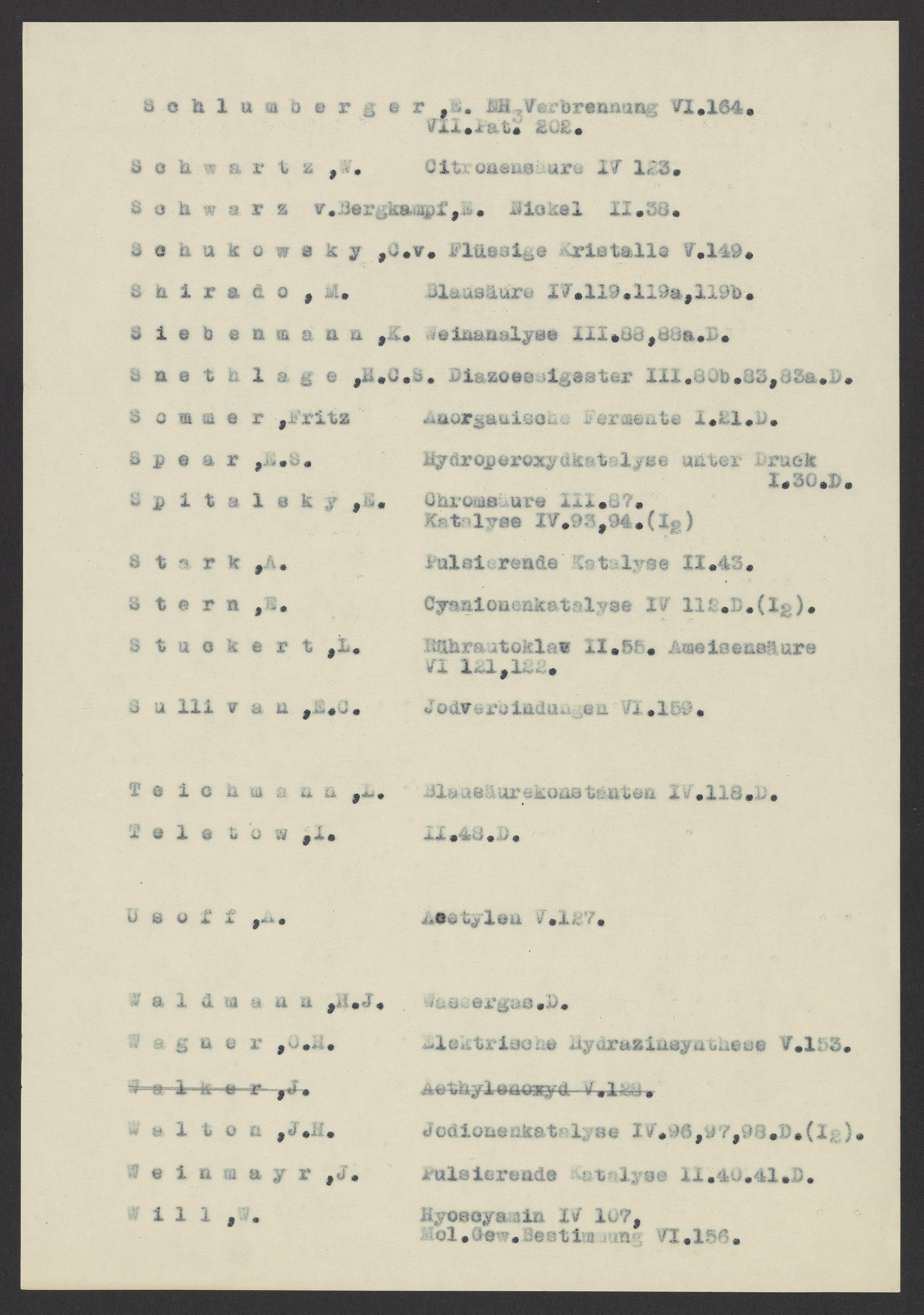 Includes a table of contents and an alphabetical list of Georg Bredig's (1868-1944) employees.