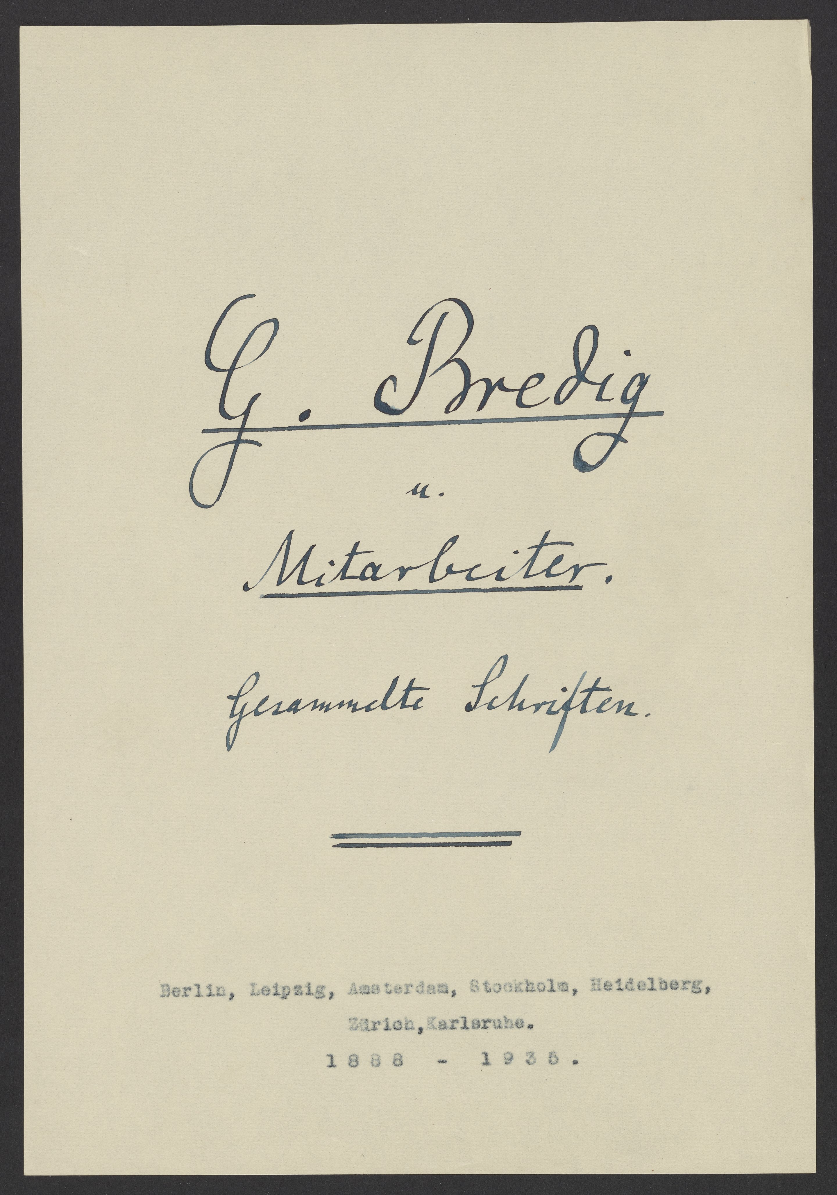 Bredig, Georg. “G. Bredig u. Mitarbeiter Gesammelte Schriften,” circa 1935. Papers of Georg and Max Bredig, Box 5, Folder 6. Science History Institute. Philadelphia. https://digital.sciencehistory.org/works/wsa6nnu.