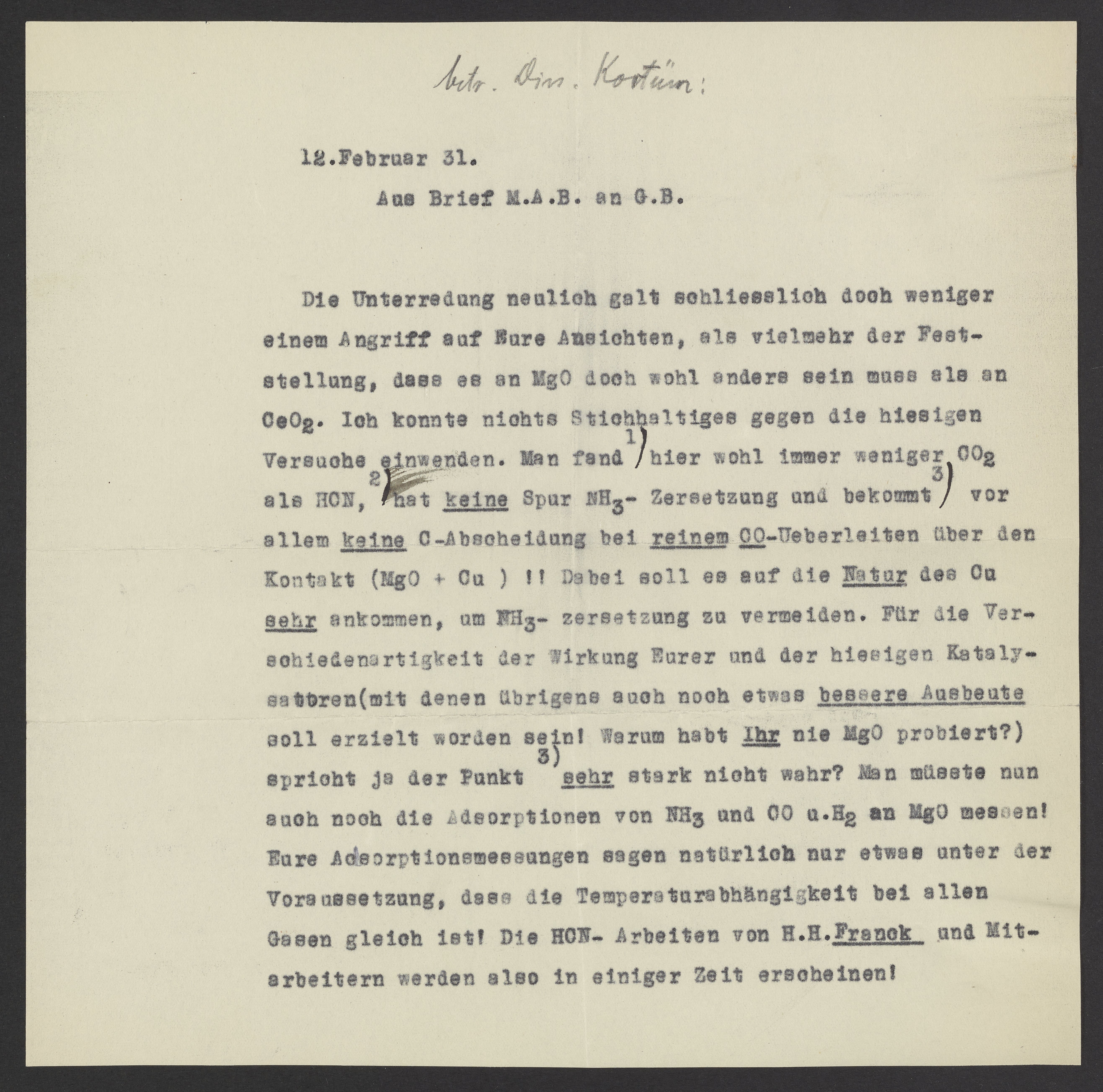Die Unterredung neulich galt schliesslich davon weniger einem Angriff auf Eure Ansichten, als vielmehr der Feststellung, dass es an MgO doch wohl andere sein muss als an CeO2. Ich konnte nichts Stichhaltiges gegen die hiesigen Versuche einwenden. Man fand 1) hier wohl immer weniger CO2 als HON, 2) hat keine Spur NH3-Zersetzung und bekommt 3) vor allem keine C-Abscheidung bei reinem CO-Überleiten über den Kontakt (MgO + Cu)!! Dabei soll es auf die Natur des Cu sehr ankommen, um NH3-Zersetzung zu vermeiden. Für die Verschiedenartigkeit der Wirkung Eurer und der hiesigen Katalysatoren (mit denen übrigens auch noch etwas besser Ausbeute soll erzielt worden sein! Warum habt ihr nie MgO probiert?) spricht ja der Punkt 3) sehr stark nicht wahr? Man müsste nun auch noch die Adsorptionen von NH3 und Co u. H2 and MgO messen! Eure Adsorptionsmessungen sagen natürlich nur etwas unter der Voraussetzung, dass die Temperaturabhängigkeit bei allen Gasen gleich ist! Die HON-Arbeiten von H.H. Franck und Mitarbeitern werden also in einiger Zeit erscheinen.