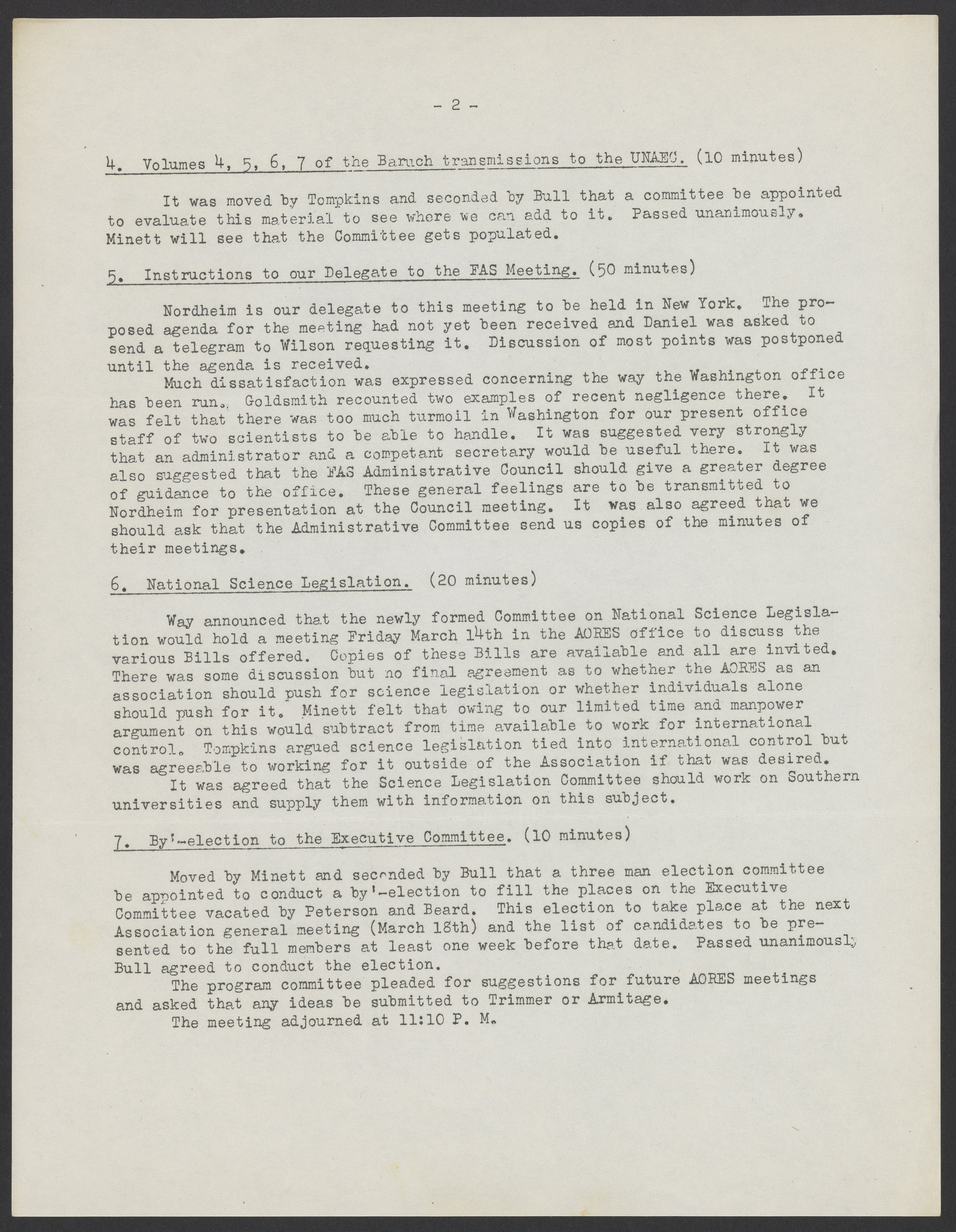 Meeting minutes from the executive committee meeting of the Association of Oak Ridge Engineers and Scientists (AORES). AORES was formed in 1946 through a merger between the Atomic Engineers of Oak Ridge and Atomic Production Scientists of Oak Ridge.