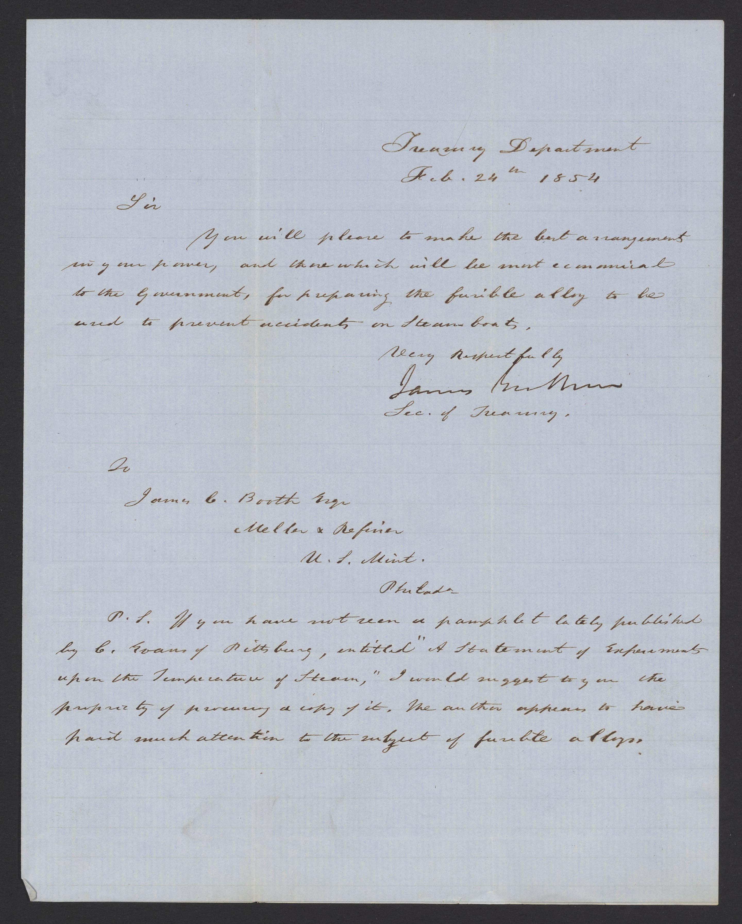 Letter from James B. Guthrie to James Curtis Booth, February 24, 1854