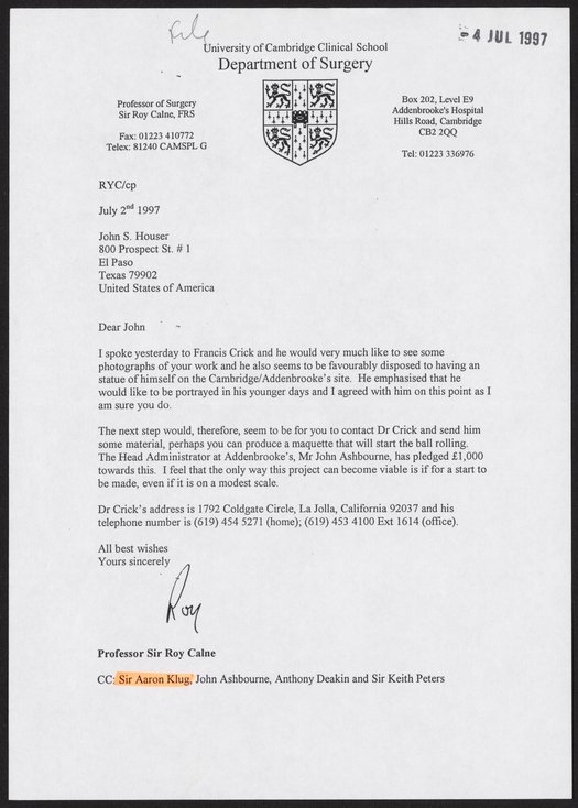 Calne, Roy Yorke. “Letter from Roy Calne to John S. Houser, July 2, 1997,” July 2, 1997. History of Molecular Biology Collection, Box 20, Folder 6. Science History Institute. Philadelphia. https://digital.sciencehistory.org/works/wwkn3an.
