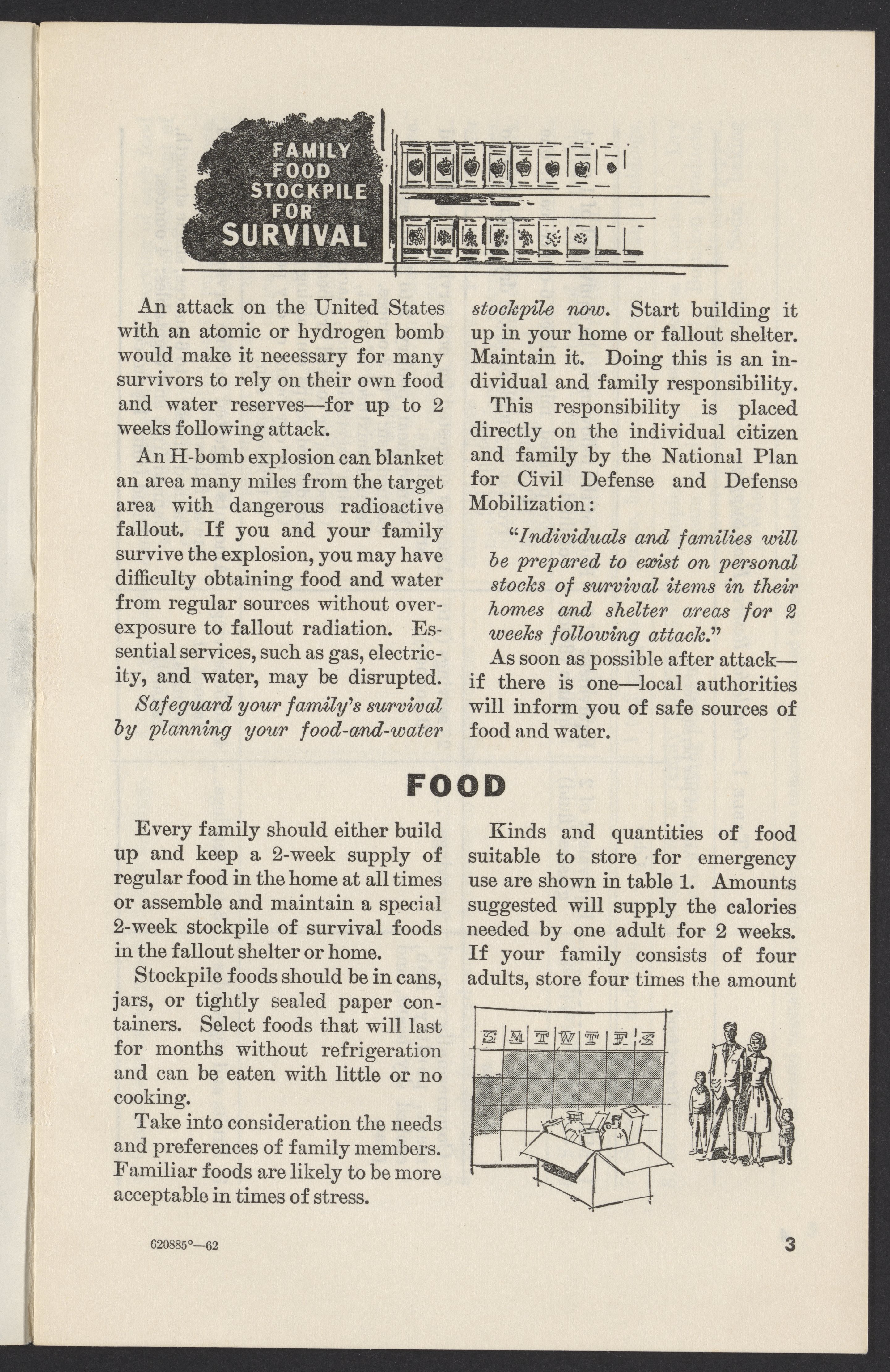 United States. Department of Agriculture. “Family Food Stockpile for Survival.” Washington (D.C.), August 1961. Science History Institute. Philadelphia. https://digital.sciencehistory.org/works/wxp246t.