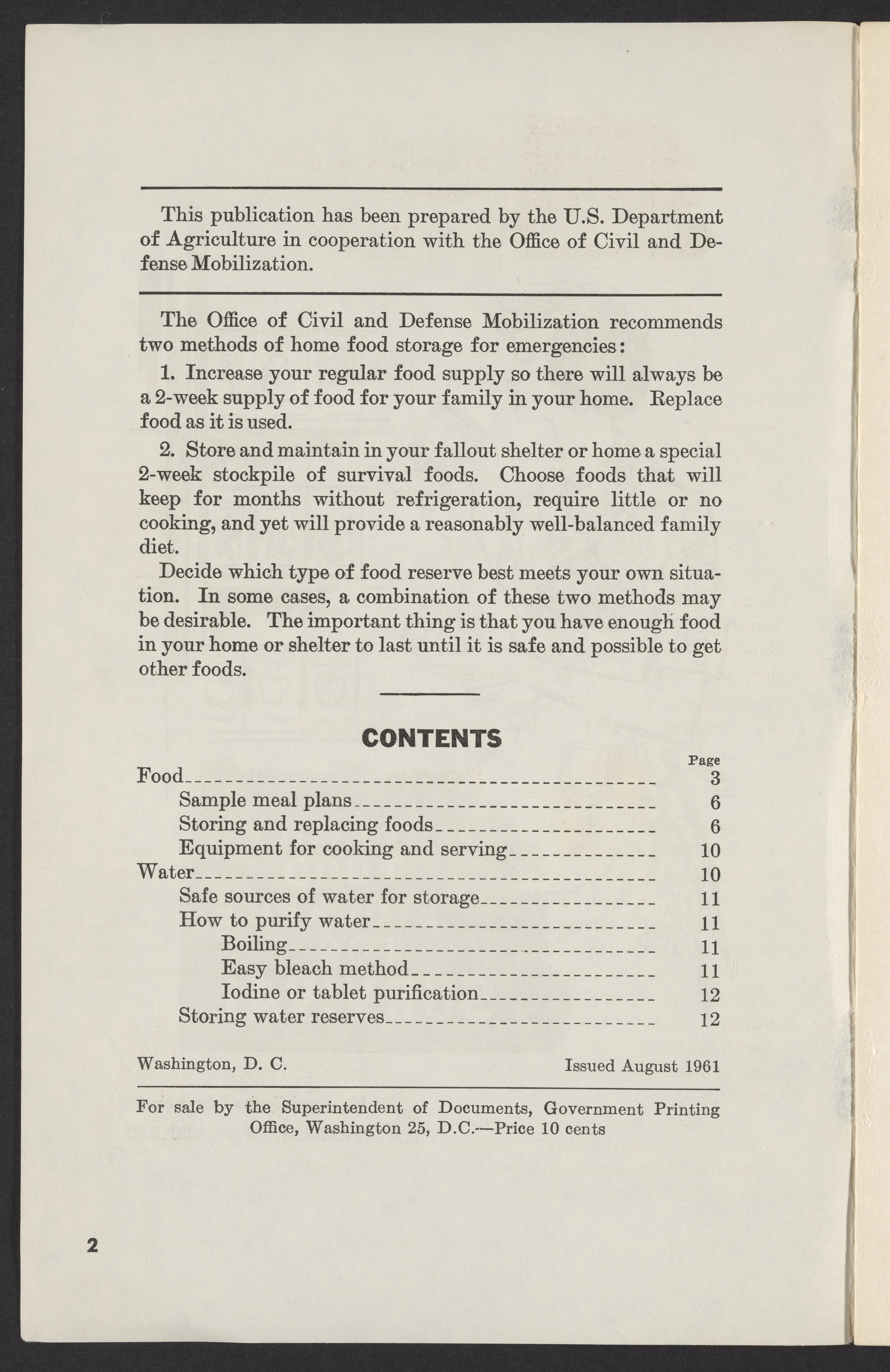Small JPG1200 x 1846px — 384 KBLarge JPG2880 x 4431px — 2.1 MBFull-sized JPG3715 x 5716px — 3.3 MBOriginal fileTIFF — 3715 x 5716px — 60.8 MBPamphlet published by the United States Department of Agriculture instructing citizens on home food and water storage for a fallout shelter.