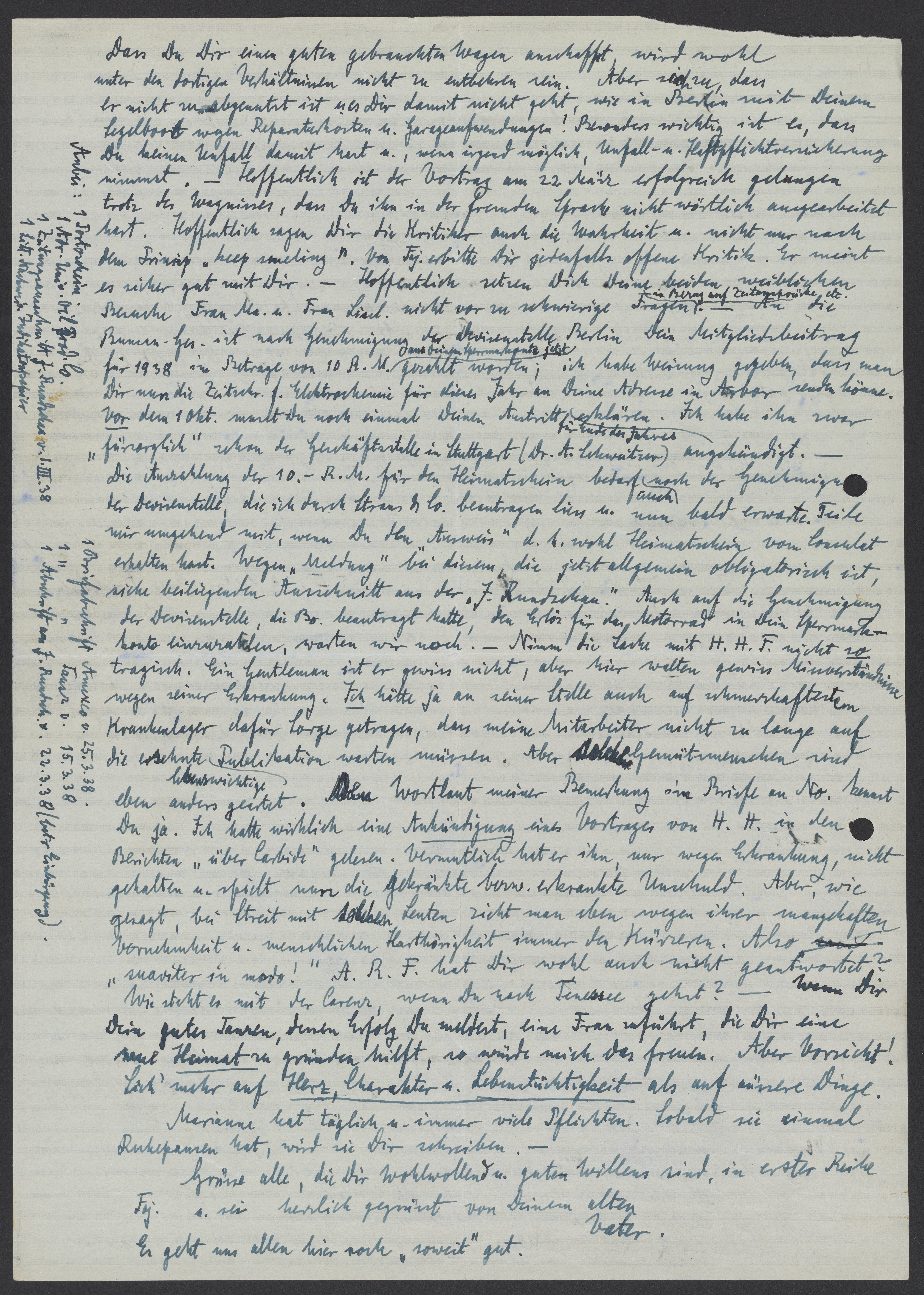 Dass Du Dir einen guten gebrauchten Wagen anschaffst, wird wohl unter den dortigen Verhältnissen nicht zu entheben sein. Aber sieh zu, dass er nicht zu abgenutzt ist u es Dir damit nicht geht, wie in Berlin mit Deinem Segelboot wegen Reparaturkosten u. Garageaufwendungen! Besonders wichtig ist es, dass Du keinen Unfall damit hast u., wenn irgend möglich, Unfall-u. Haftpflichtversicherung nimmst. – Hoffentlich ist der Vortrag am 22. März erfolgreich gelungen trotz des Wagnisses, dass Du ihn in der fremden Sprache nicht wörtlich ausgearbeitet hast. – Hoffentlich setzen Dich Deine beiden weiblichen Besuche Frau Ma. U. Frau Lisel. nicht vor zu schwierige Fragen in Bezug auf Zeitansprüche etc. – An die Bunsen Ges. ist nach Genehmigung der Devisenstelle Berlin Dein Mitgliedbeitrag für 1938 in Betrage von 10 R.M. gezahlt worden; ich habe Weisung gegeben, dass man Dur nun die Zeitschr. f. Elektrochemie für dieses Jahr an Deine Adresse in Arbor senden könne. Vor dem 1 Okt. musst Du noch einmal Deinen Austritt für Ende des Jahres erklären. Ich habe ihn zwar „fürsorglich“ schon der Geschäftsstelle in Stuttgart (Dr. A. Schweizer) angekündigt. Die Auszahlung der 10. – R.M. für den Heimatschein bedarf auch noch der Genehmigung der Devisenstelle, die ich durch Straus & Co. beantragen liess u. nun bald erwarte. Teile mir umgehend mit, wenn Du den „Ausweis“ d.h. wohl Heimatschein vom Consulat erhalten. Wegen „Meldung“ bei diesem, die jetzt allgemein obligatorisch ist, siehe beispielweise Ausschnitt aus der „J.Rundschau.“ Auch auf die Genehmigung der Devisenstelle, die Bo. beantragt hatte, den Erlös für den Motorrad in Dein Sperrmarkkonto einzuzahlen, warten wir noch. – Nimm die Sache mit H.H.F. nicht so tragisch. Ein Gentleman ist er gewiss nicht, aber hier walten gewiss Missverständnisse wegen seiner Erkrankung. Ich hätte ja an seiner Stelle auch auf schmerzhaftestem Krankenlager dafür Sorge getragen, dass meine Mitarbeiter nicht zu auf die ersehnte lebenswichtige Publikation warten müssen. Aber Gemütsmenschen sind eben anders geartet. Den Wortlaut meiner Bemerkung in Briefe an No. kennst Du ja. Ich hatte wirklich eine Ankündigung eines Vortrages von H.H. in den Berichten „über Carbide“ gelesen. Vermutlich hat er ihn, nur wegen Erkrankung, nicht gehalten u. spielt nur die gekränkte bezw. erkrankte Unschuld. Aber wie gesagt, bei Streit mit solchen Leuten zieht man eben wegen ihrer mangelhaften Vornehmheit u. menschlichen Harthörigkeit immer den Kürzeren. Also „suaviter in modo“! A.R.F hat Dir wohl auch nicht geantwortet? Wie steht es mit der Carenz, wenn Du nach Tenessee gehst? – Wenn Dir Dein gutes Tanzen, dessen Erfolg Du meldest, eine Frau zuführst, die Dir eine neue Heimat zu gründen hilft, so würde mich das freuen. Aber Vorsicht! Sieh mehr auf Herz, Charakter, u. Lebenstüchtigkeit als auf äussere Dinge.