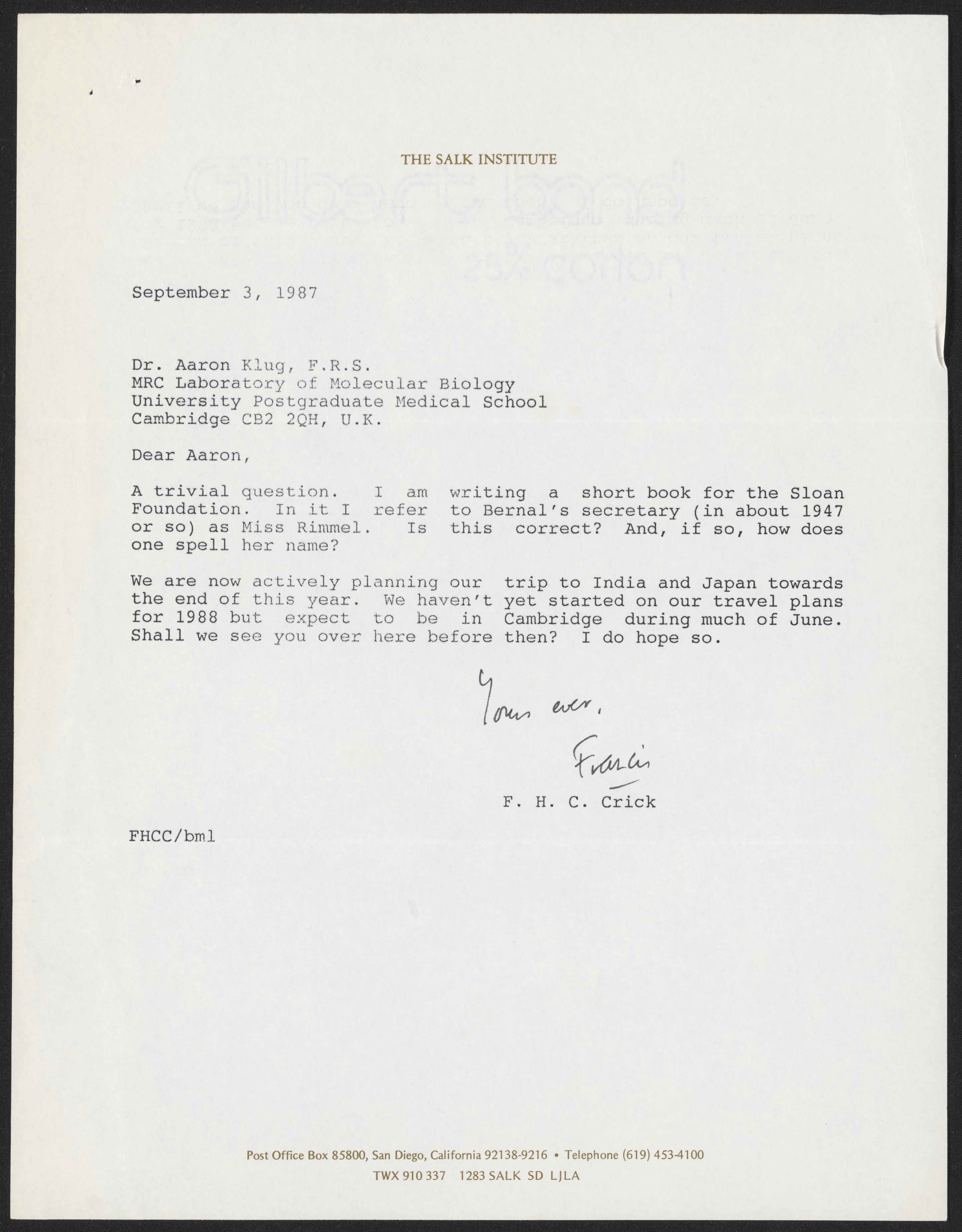 Letter from Francis Crick to Aaron Klug, September 3, 1987