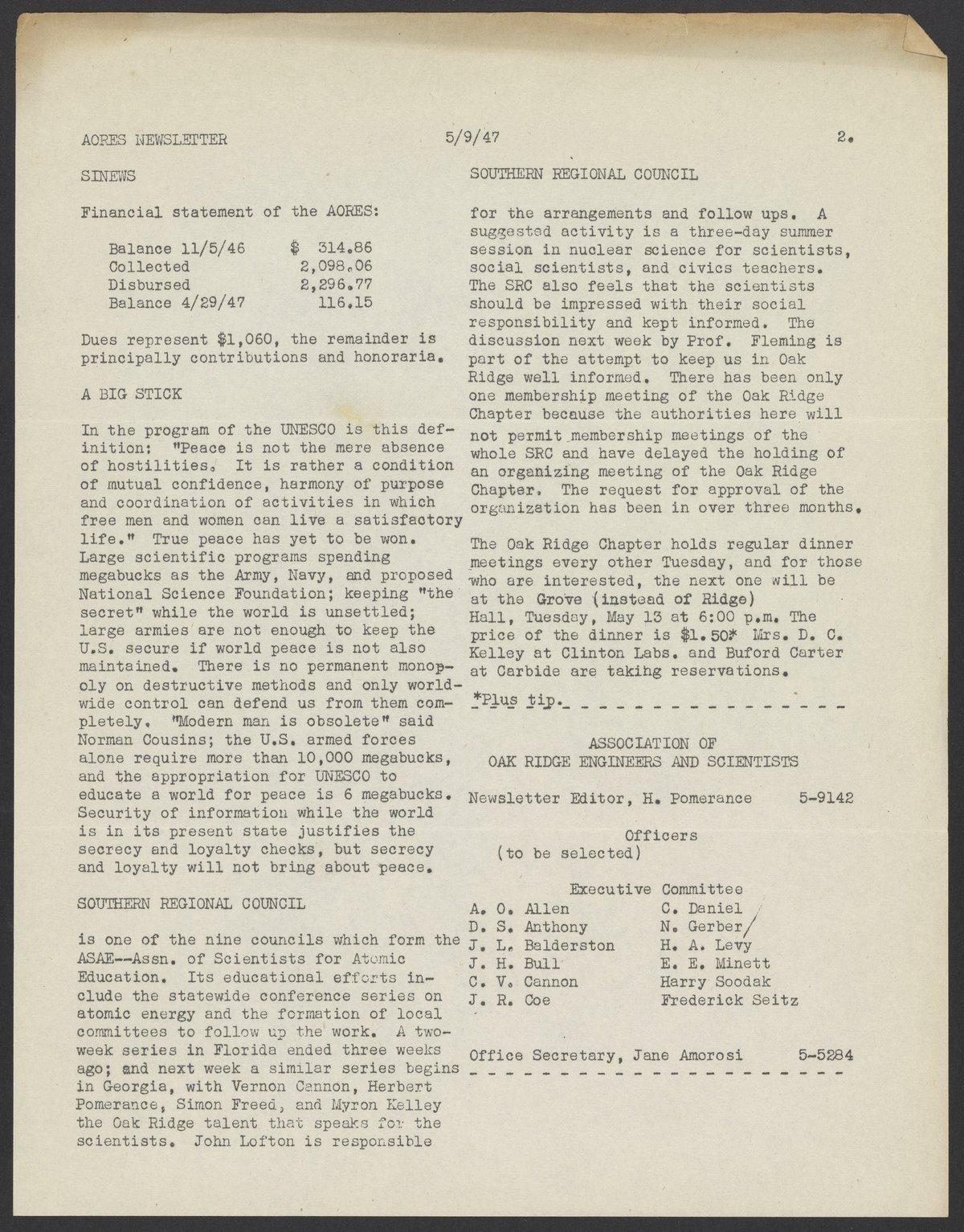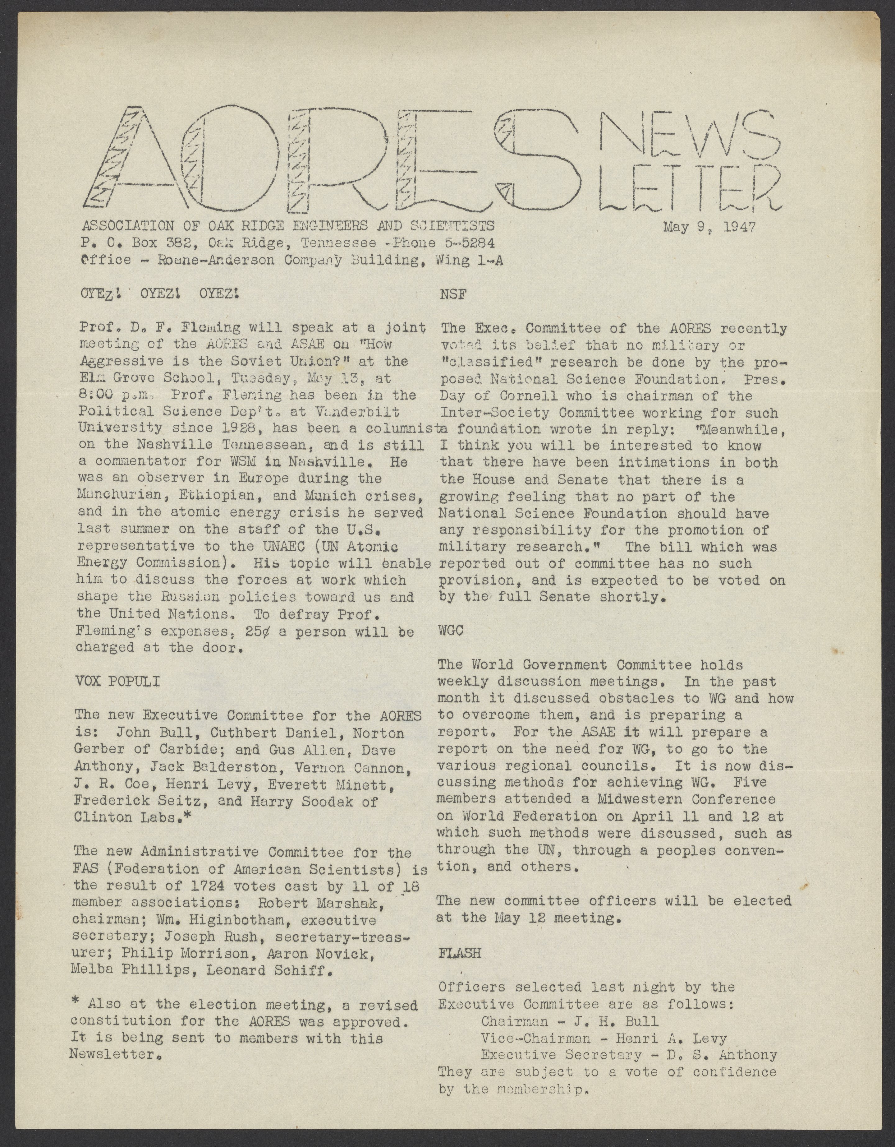 Association of Oak Ridge Engineers and Scientists. “Newsletter for the Association of Oak Ridge Engineers and Scientists (AORES), May 9, 1947,” May 9, 1947. Papers of Georg and Max Bredig, Box 10, Folder 4. Science History Institute. Philadelphia. https://digital.sciencehistory.org/works/x197r1v.