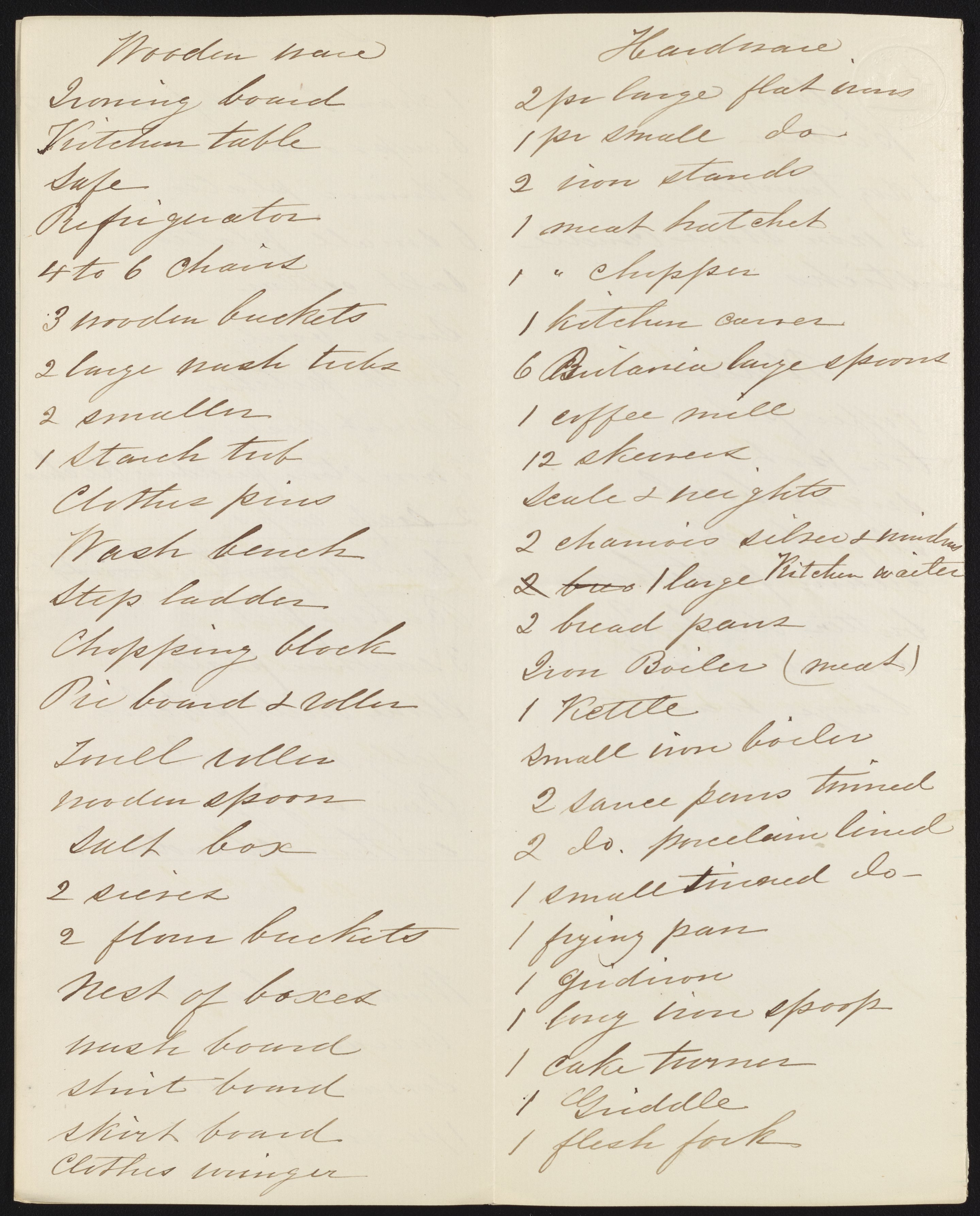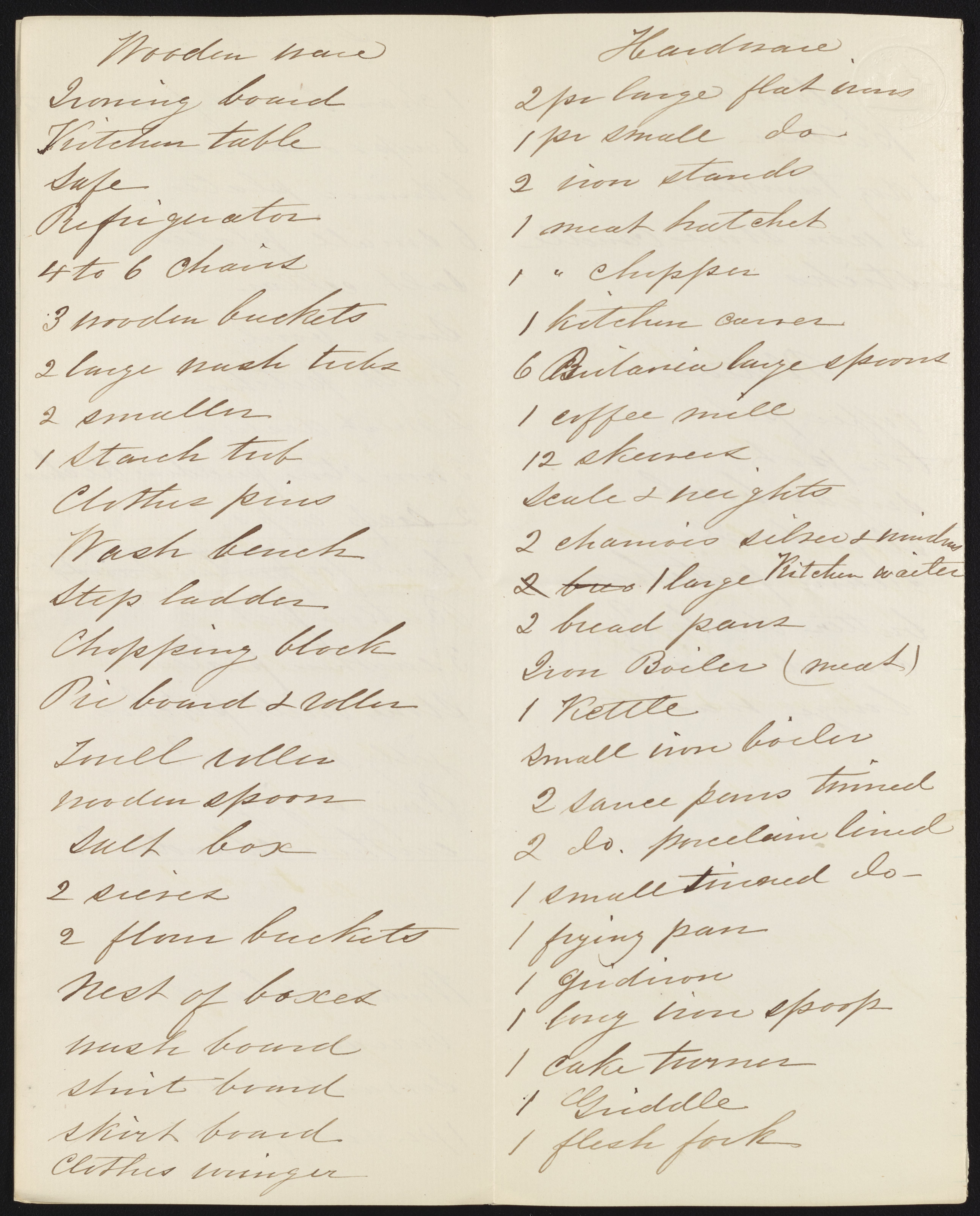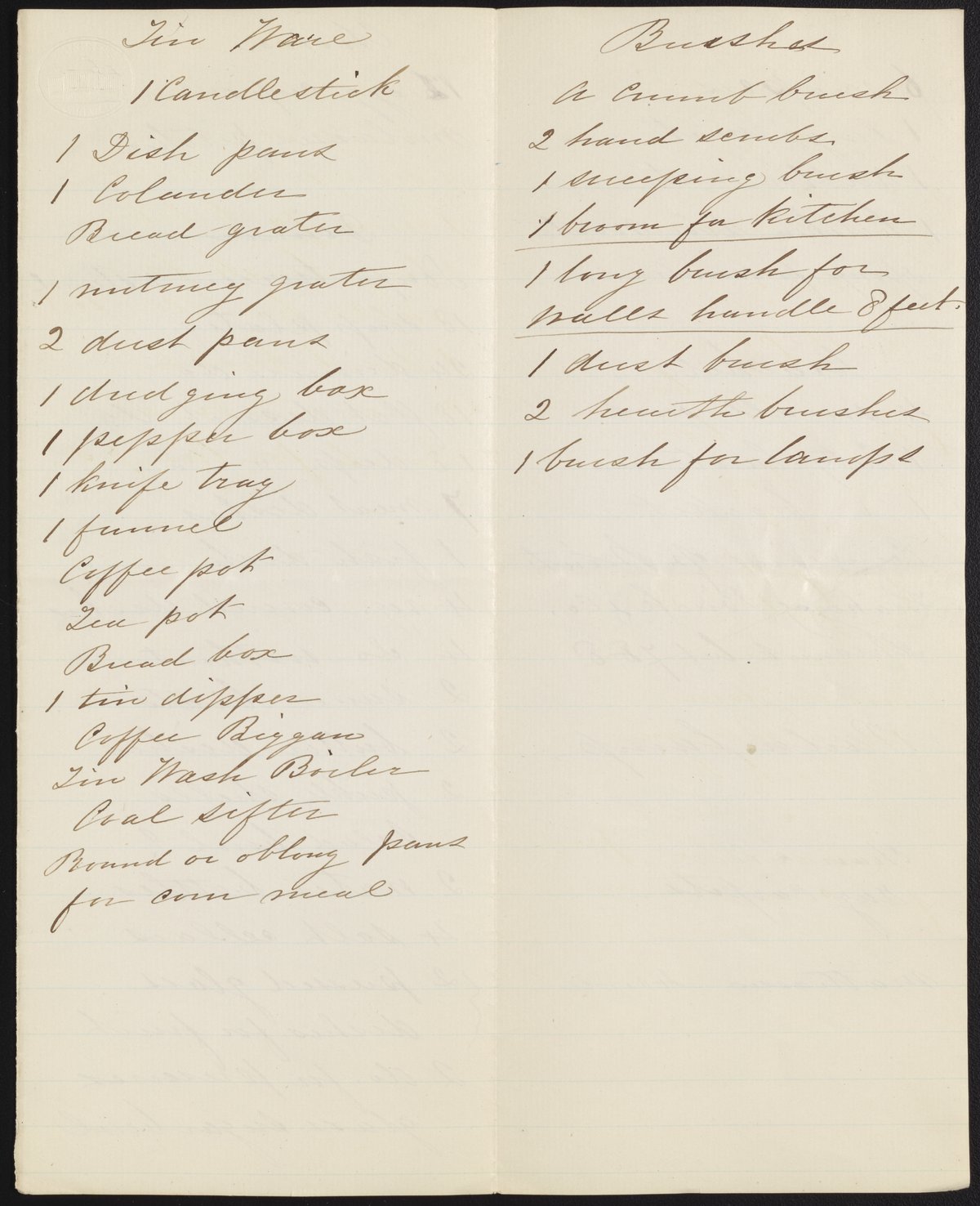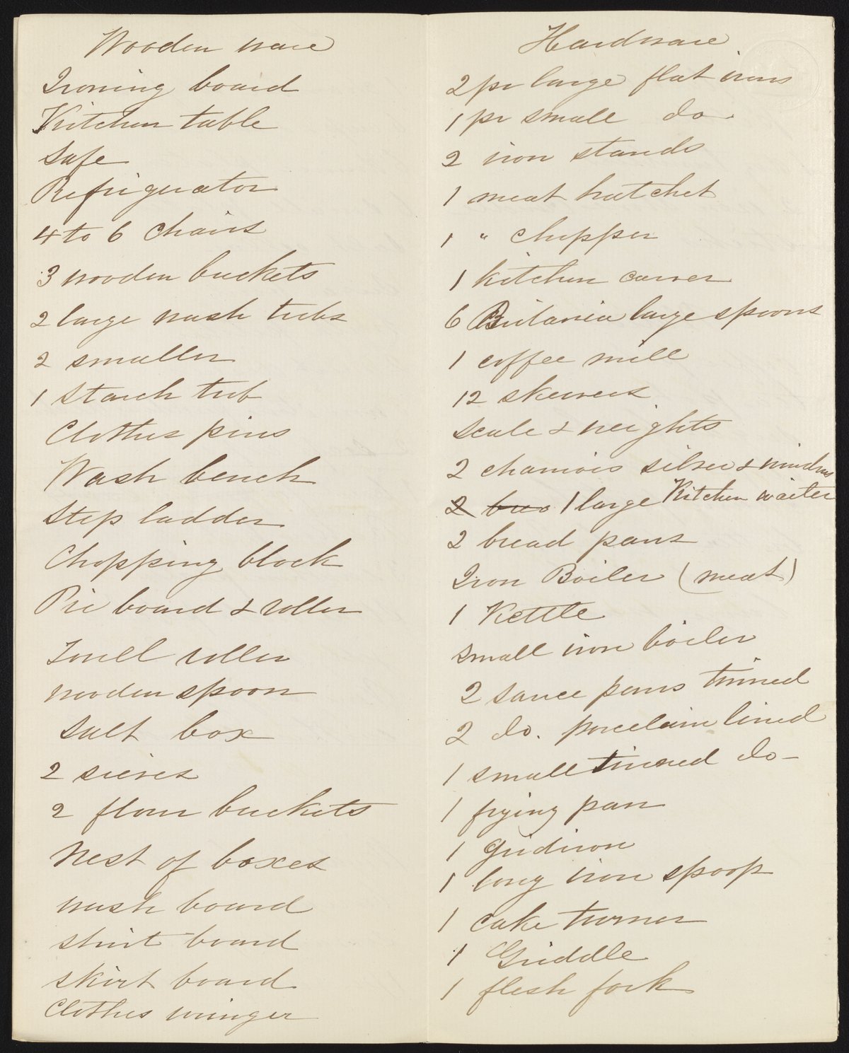 Small JPG1200 x 1476px — 197 KBLarge JPG2880 x 3543px — 985 KBFull-sized JPG5166 x 6356px — 2.8 MBOriginal fileTIFF — 5166 x 6356px — 94.0 MBA list of household items separated by topic including tinware, bushels, parlor lamps, china, dinner, woodenware, and hardware.