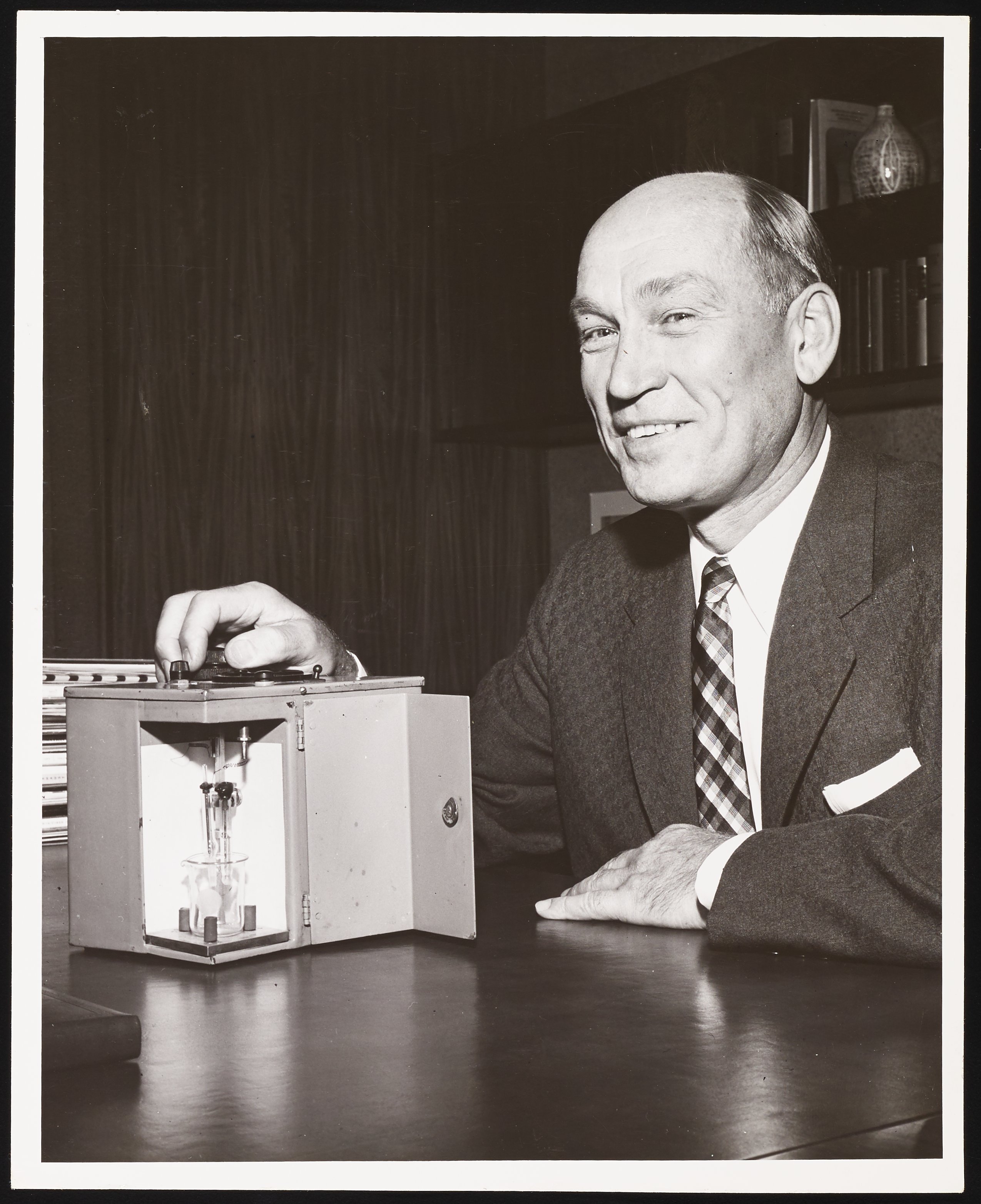 Dr. Arnold O. Beckman (1900-2004) is pictured here with his pH meter, which he invented in 1934 and which became the first commercially successful electric pH meter. Thus began a long career manufacturing scientific and medical instruments with National Technical Laboratories, Arnold O. Beckman, Inc., and Beckman Instruments. After his retirement he devoted his life to philanthropy and specifically supporting scientific innovation.