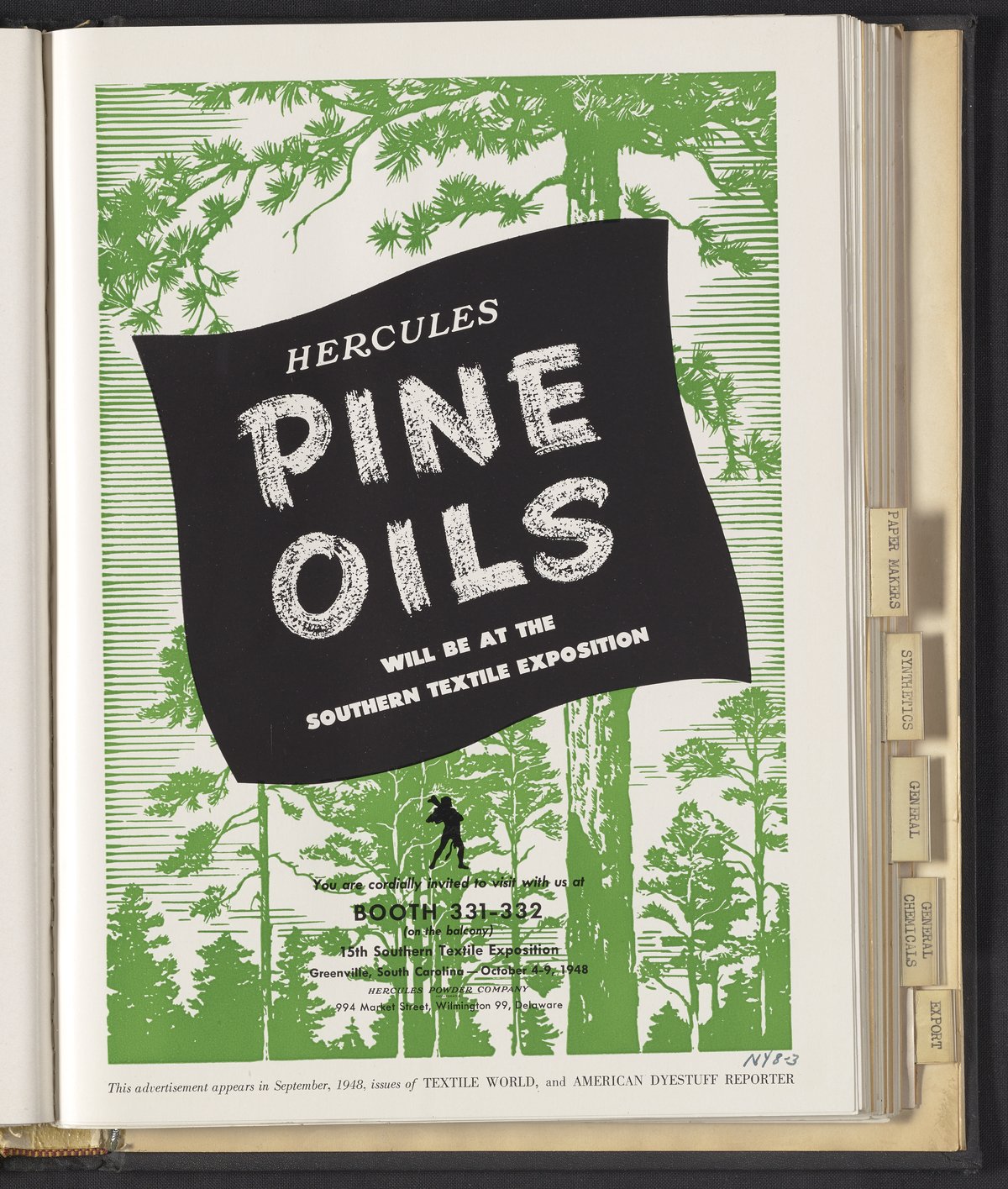 Hercules Incorporated. “Hercules Pine Oils Will Be at the Southern Textile Exposition.” 1948 Hercules Advertisements, 1948. Records of Hercules Incorporated, Volume 1948. Science History Institute. Philadelphia. https://digital.sciencehistory.org/works/x633f175k.
