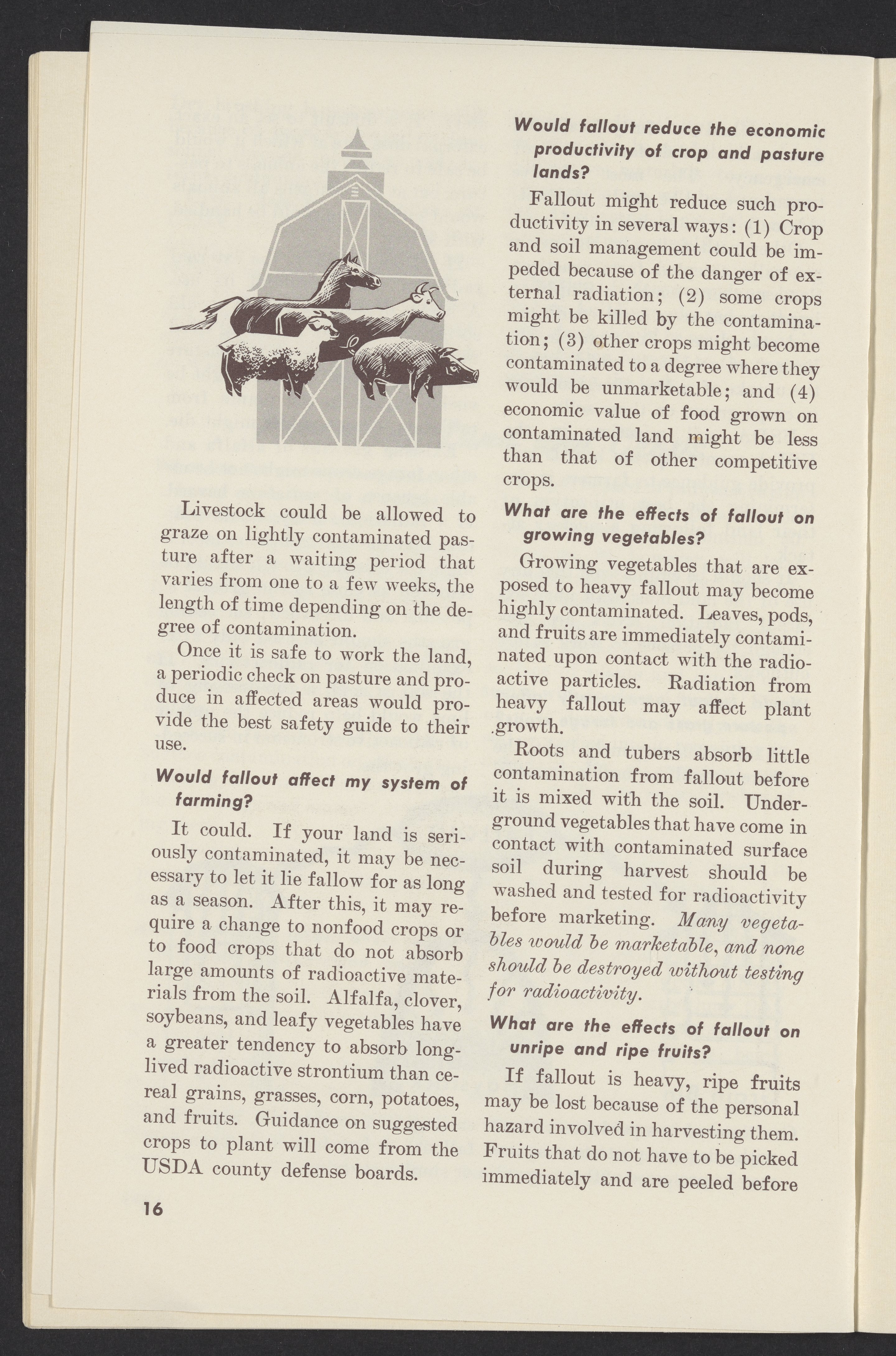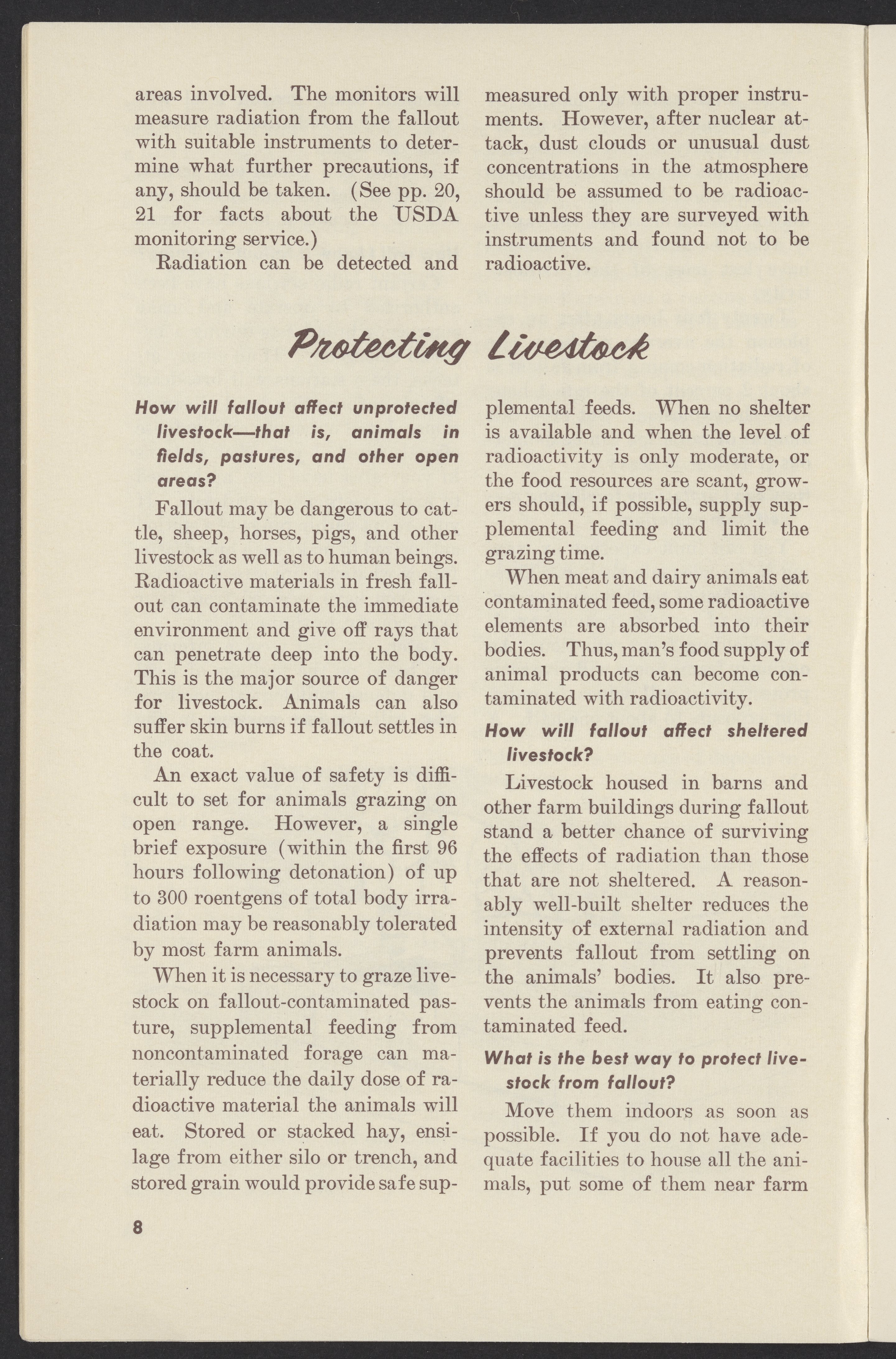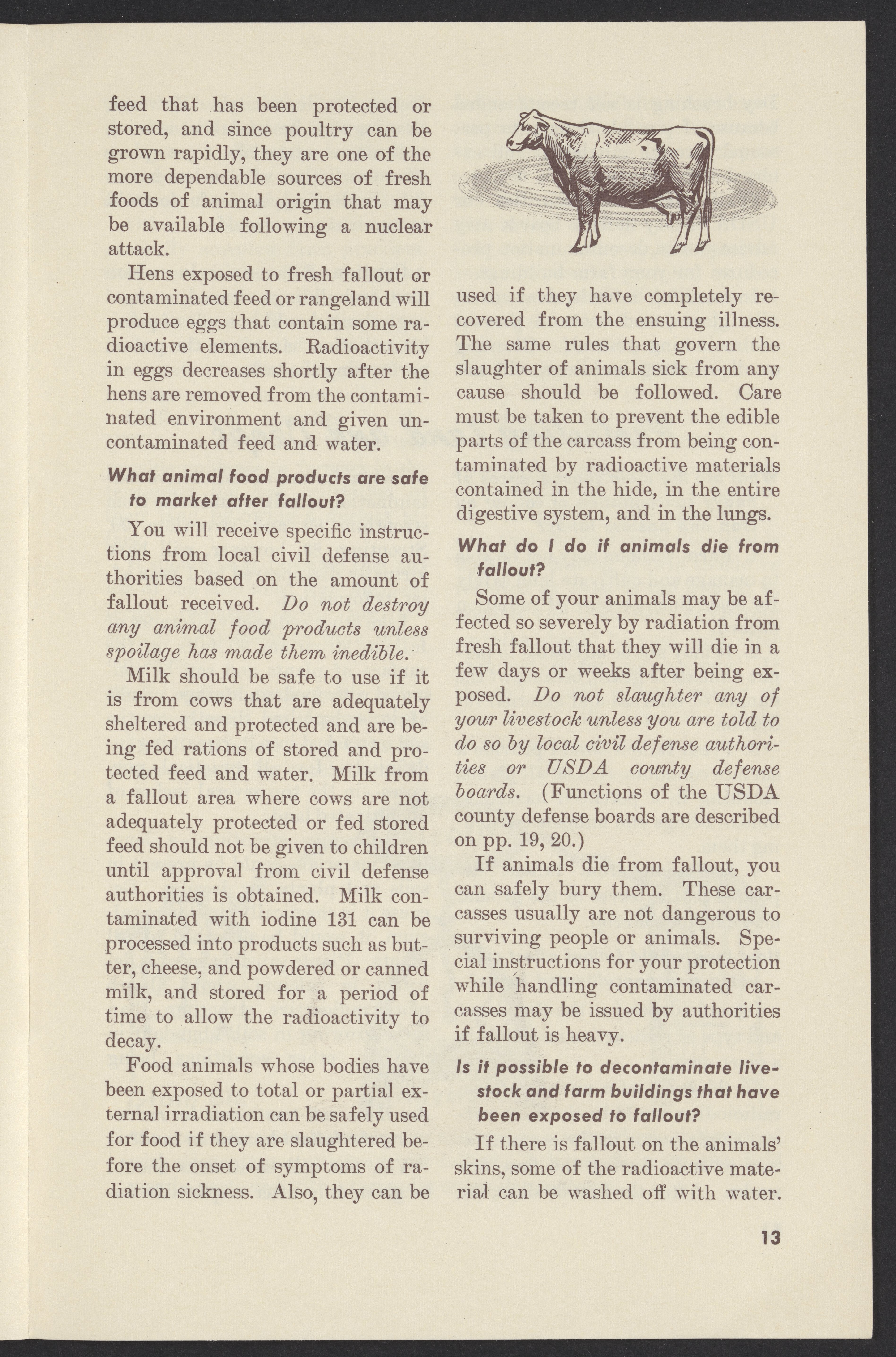 Small JPG1200 x 1831px — 302 KBLarge JPG2880 x 4395px — 1.9 MBFull-sized JPG3761 x 5739px — 3.2 MBOriginal fileTIFF — 3761 x 5739px — 61.8 MBPamphlet published by the United States Department of Agriculture instructing farmers how to protect themselves, their land, crops, and livestock from radioactive fallout in the event of a nuclear attack.