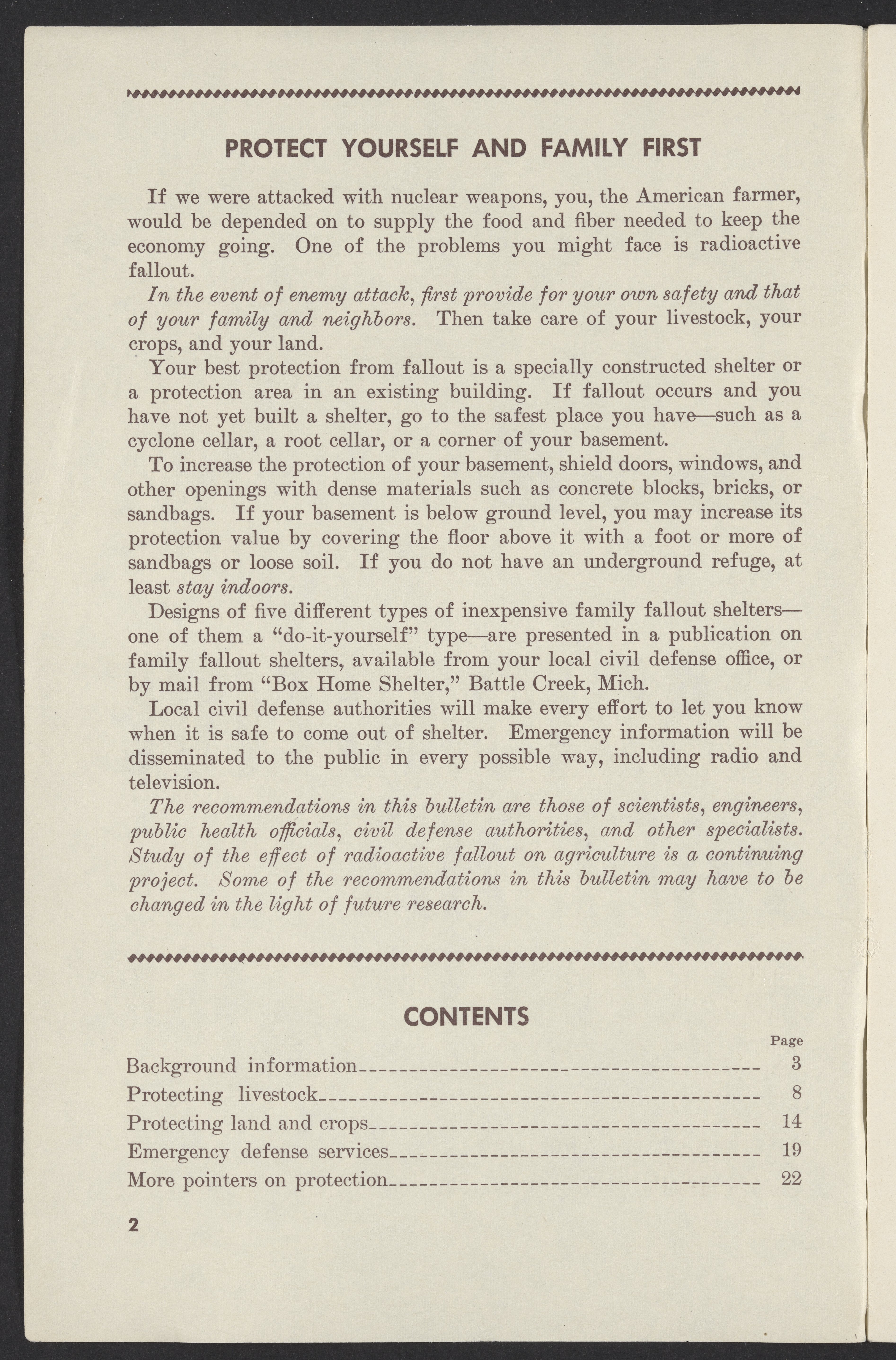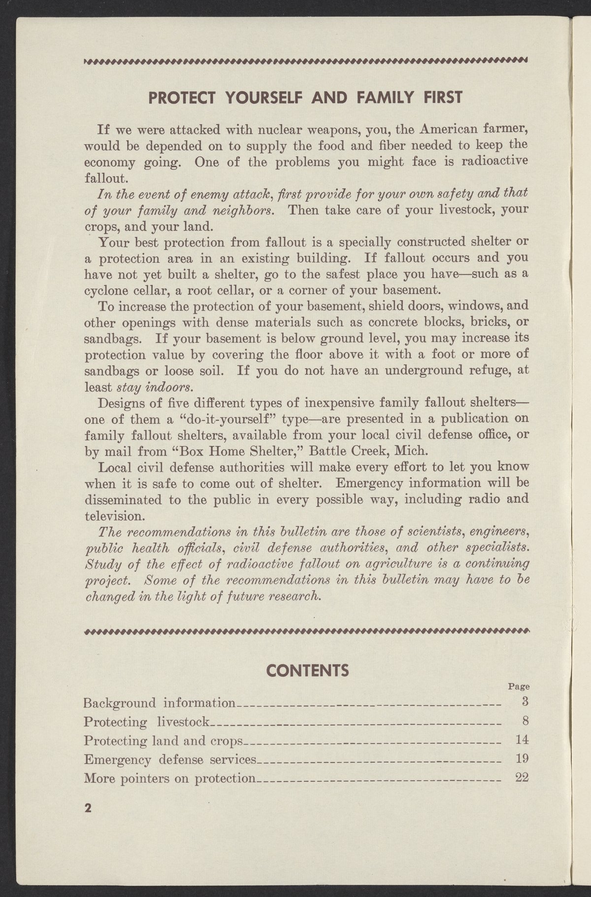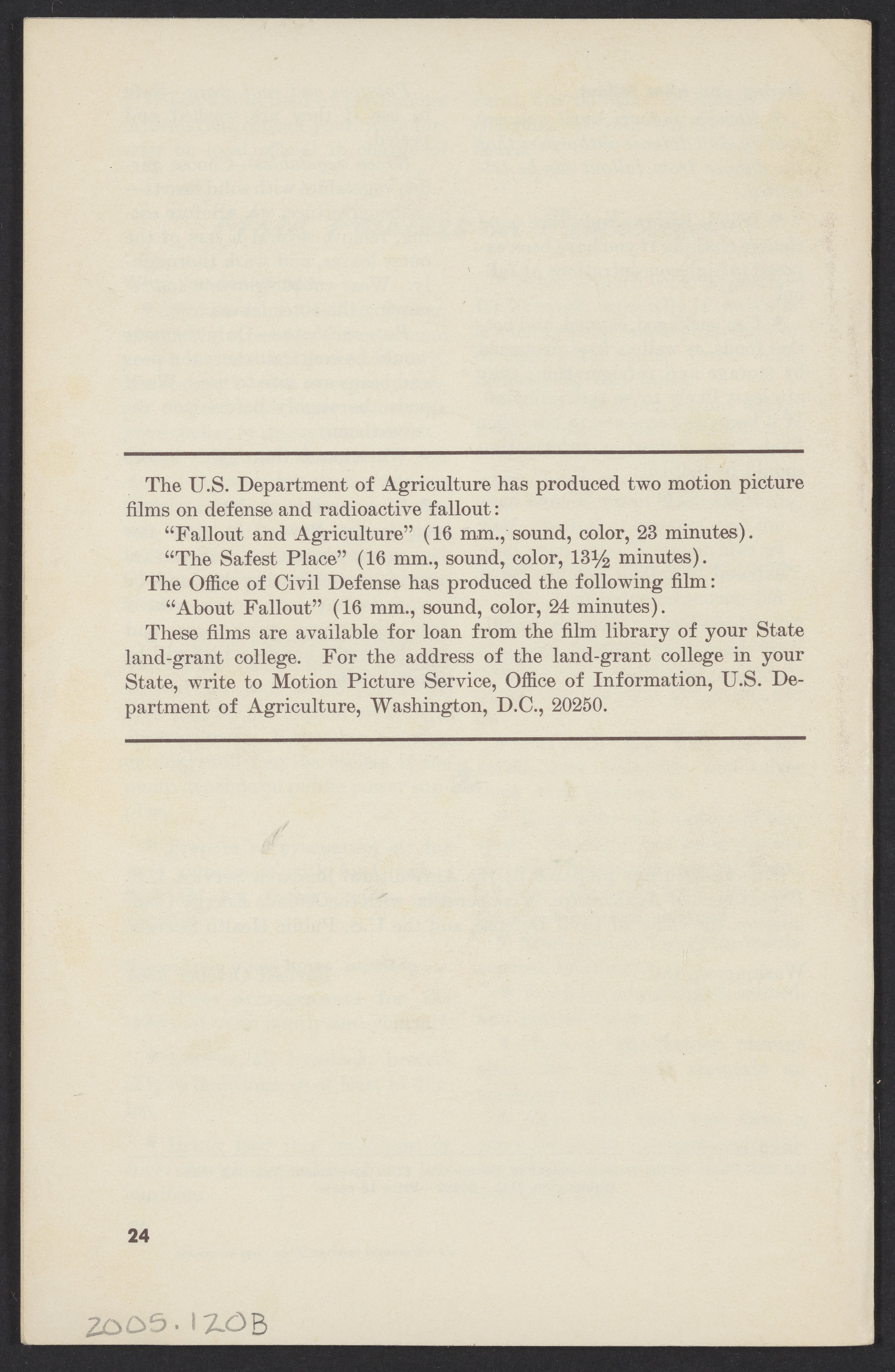 Small JPG1200 x 1831px — 302 KBLarge JPG2880 x 4395px — 1.9 MBFull-sized JPG3761 x 5739px — 3.2 MBOriginal fileTIFF — 3761 x 5739px — 61.8 MBPamphlet published by the United States Department of Agriculture instructing farmers how to protect themselves, their land, crops, and livestock from radioactive fallout in the event of a nuclear attack.