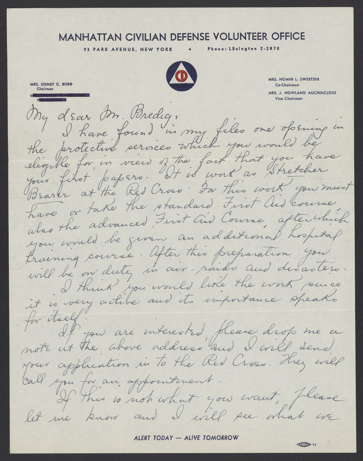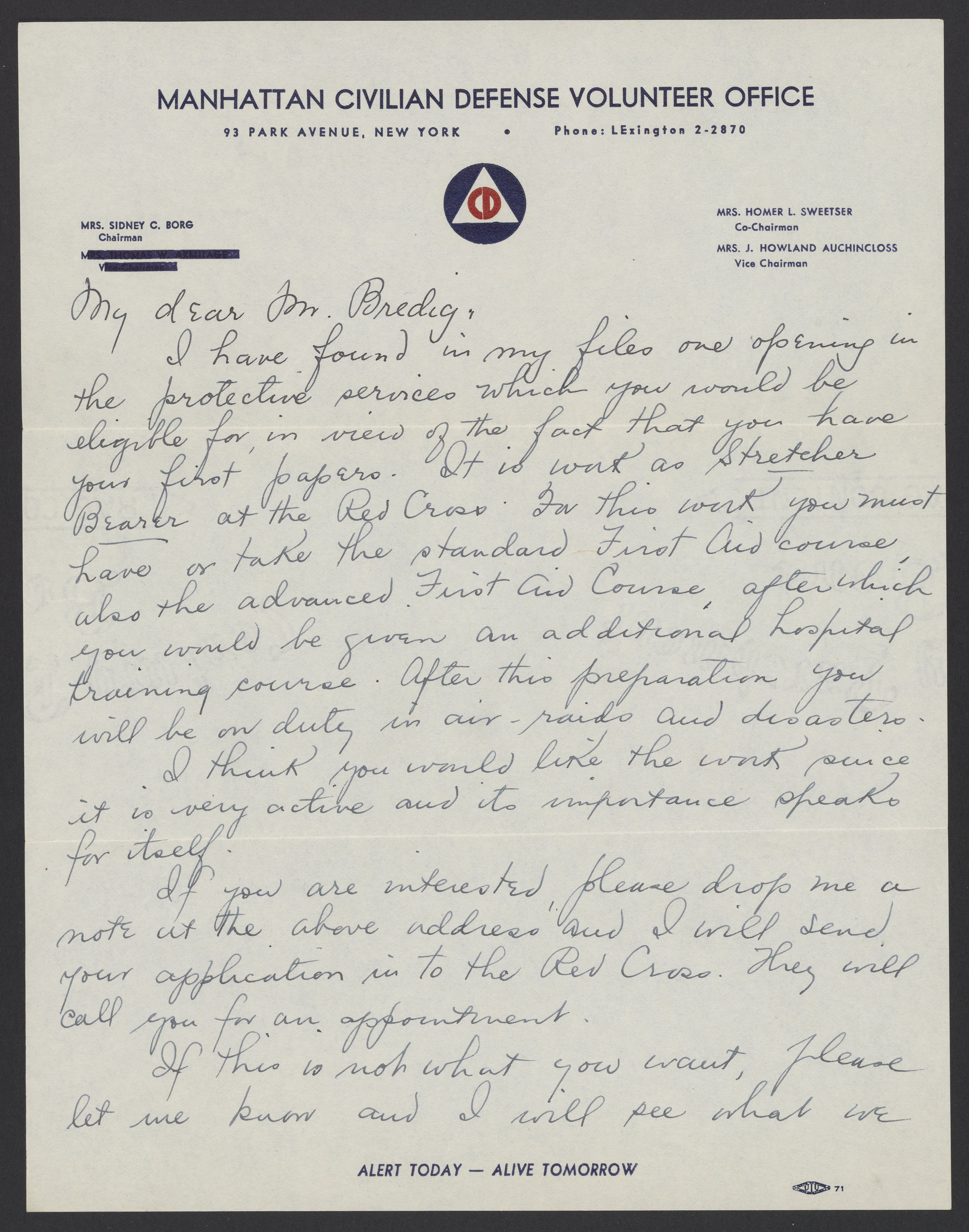 Letter from the Manhattan civilian defense volunteer office to Max Bredig