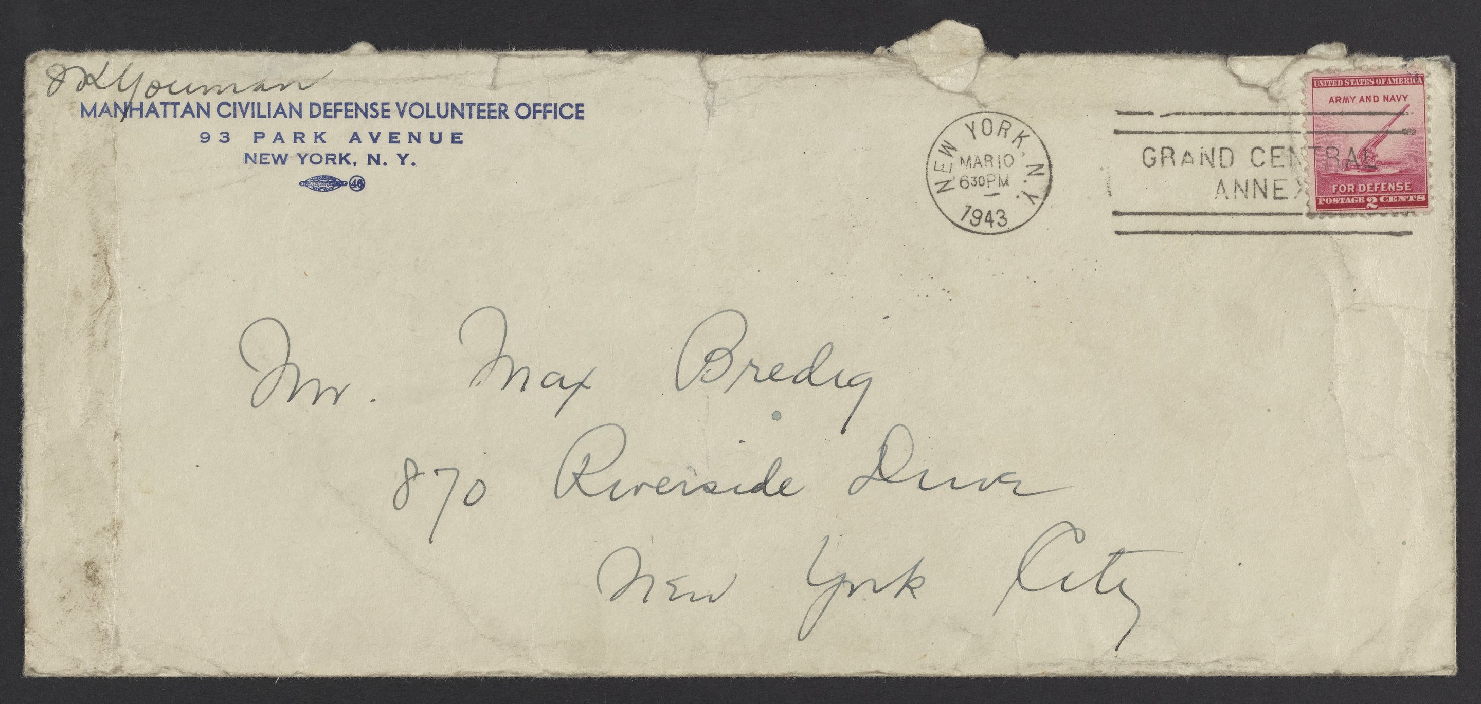 Small JPG1200 x 1525px — 293 KBLarge JPG2880 x 3661px — 1.6 MBFull-sized JPG5457 x 6936px — 5.4 MBOriginal fileTIFF — 5457 x 6936px — 108 MBThe Manhattan civilian defense volunteer office informs Max Bredig (1902-1977) that a volunteer position has opened in the protective services division.