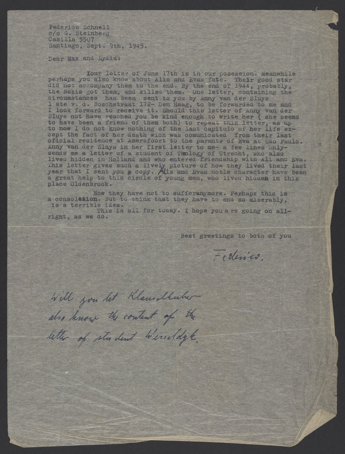 Letter from Federico Schnell to Max and Lydia Bredig, September 9, 1945