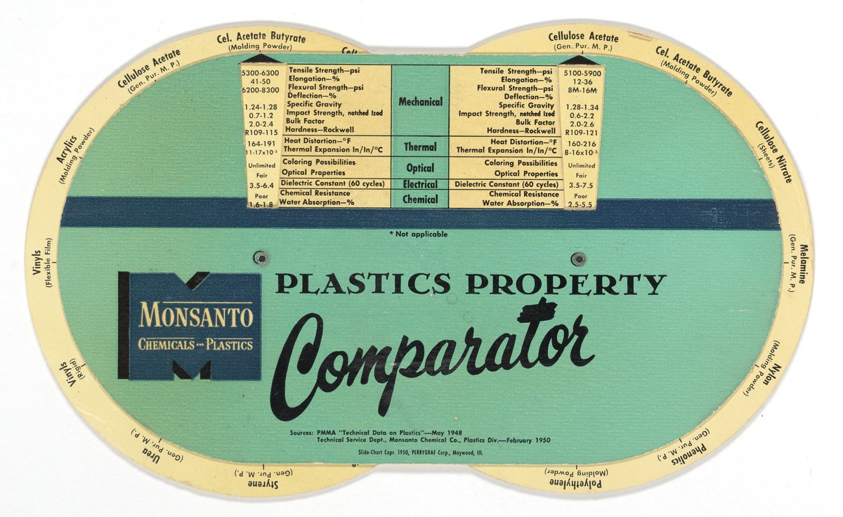 Perrygraf Promotion Works. “Dual-Sided Plastics Property and Material Cost Comparator.” Paper (fiber product), metal, 1950. Science History Institute. Philadelphia. https://digital.sciencehistory.org/works/x70vejb.