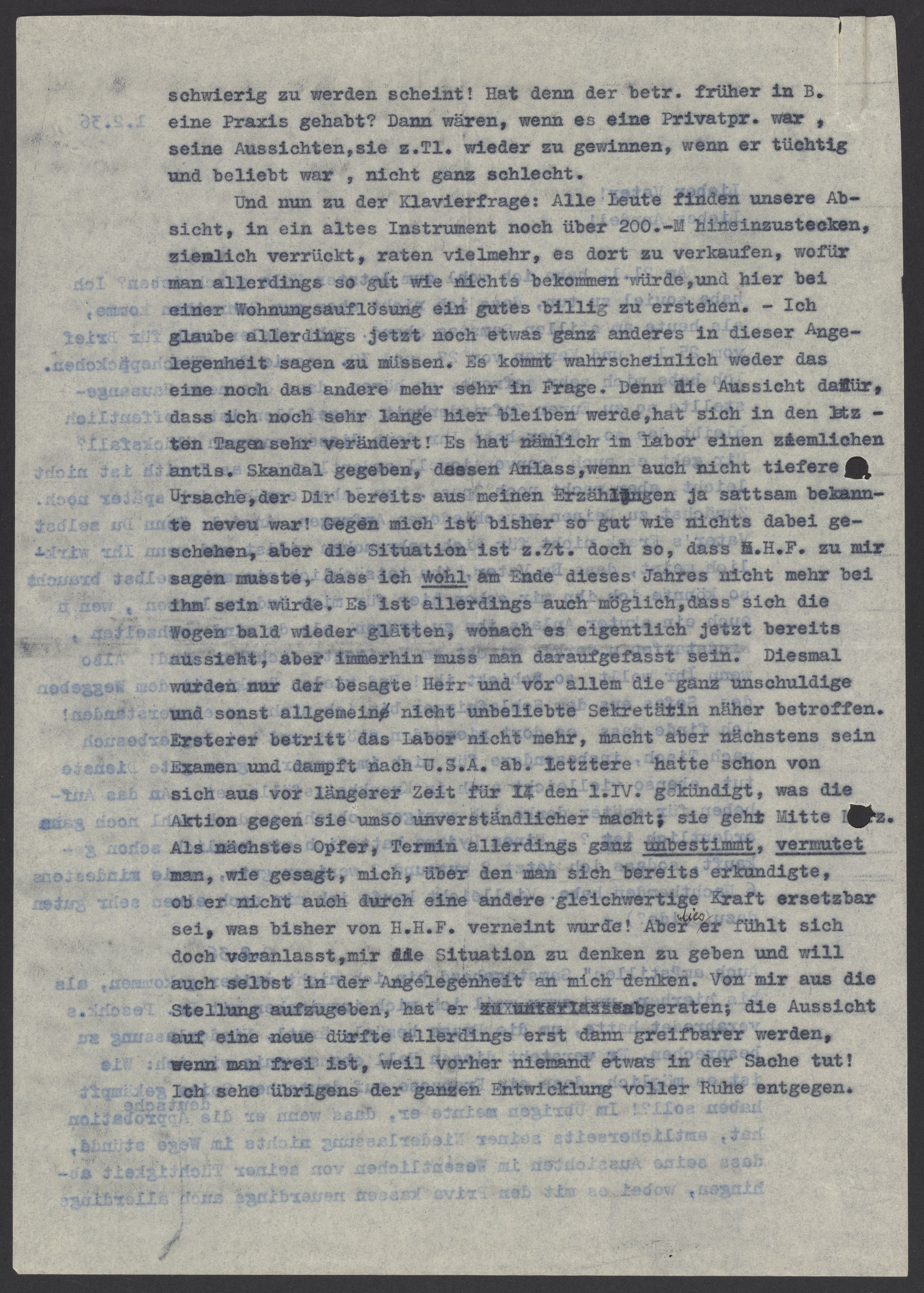 Und nun zu der Klavierfrage: Alle Leute finden unsere Absicht, in ein altes Instrument noch über 200.-Mhineinzustecken, ziemlich verrückt, raten vielmehr, es dort zu verkaufen, wofür man allerdings so gut wie nichts bekommen würde, und hier bei einer Wohnungsauflösung ein gutes billig zu erstehen. – Ich glaube allerdings jetzt noch etwas ganz anderes in dieser Angelegenheit sagen zu müssen. Es kommt wahrscheinlich weder das eine noch das andere mehr sehr in Frage. Denn die Aussicht dafür, dass ich noch sehr lange hier bleiben werde, hat sich in den letzten Tagen sehr verändert! Es hat nämlich im Labor einen ziemlichen antisemitischen Skandal gegeben, dessen Anlass, wenn auch nicht tiefere Ursache, der Dir bereits aus meinen Erzählungen ja sattsam bekannt neveu war! Gegen mich ist bisher so gut wie nichts dabei geschehen, aber die Situation ist z.Zt. doch so, dass H.H.F. zu mir sagen musste, dass ich Wohl am Ende dieses Jahres nicht mehr bei ihm sein würde. Es ist allerdings auch möglich, dass sich die Wogen bald wieder glätten, wonach es eigentlich jetzt bereits aussieht, aber immerhin muss man darauf gefasst sein. Diesmal wurden nur der besagte Herr und vor allem die ganz unschuldige und sonst allgemeine nicht unbeliebte Sekretärin näher betroffen. Ersterer betritt das Labor nicht mehr, macht aber nächstens sein Examen und dampft nach U.S.A. ab. Letztere hatte schon von sich aus vor längerer Zeit für 1x den 1.IV. gekündigt, was die Aktion gegen sie umso unverständlicher macht; sie geht Mitte Maerz. Als nächstes Opfer, Termin allerdings ganz unbestimmt, vermutet man, wie gesagt, mich, über den man sich bereits erkundigte, ober nicht auch durch eine andere gleichwertige Kraft ersetzbar sei, was bisher von H.H.F. verneint wurde! Aber wie er fühlt sich doch veranlasst, mir die Situation zu denken zu geben und will auch selbst in der Angelegenheit an mich denken. Von mir aus die Stellung aufzugeben, hat er abgeraten; die Aussicht auf eine neue dürfte allerdings erst dann greifbarer werden, wenn man frei ist, weil vorher niemand etwas in der Sache tut! Ich sehe übrigens der ganzen Entwicklung voller Ruhe entgegen.