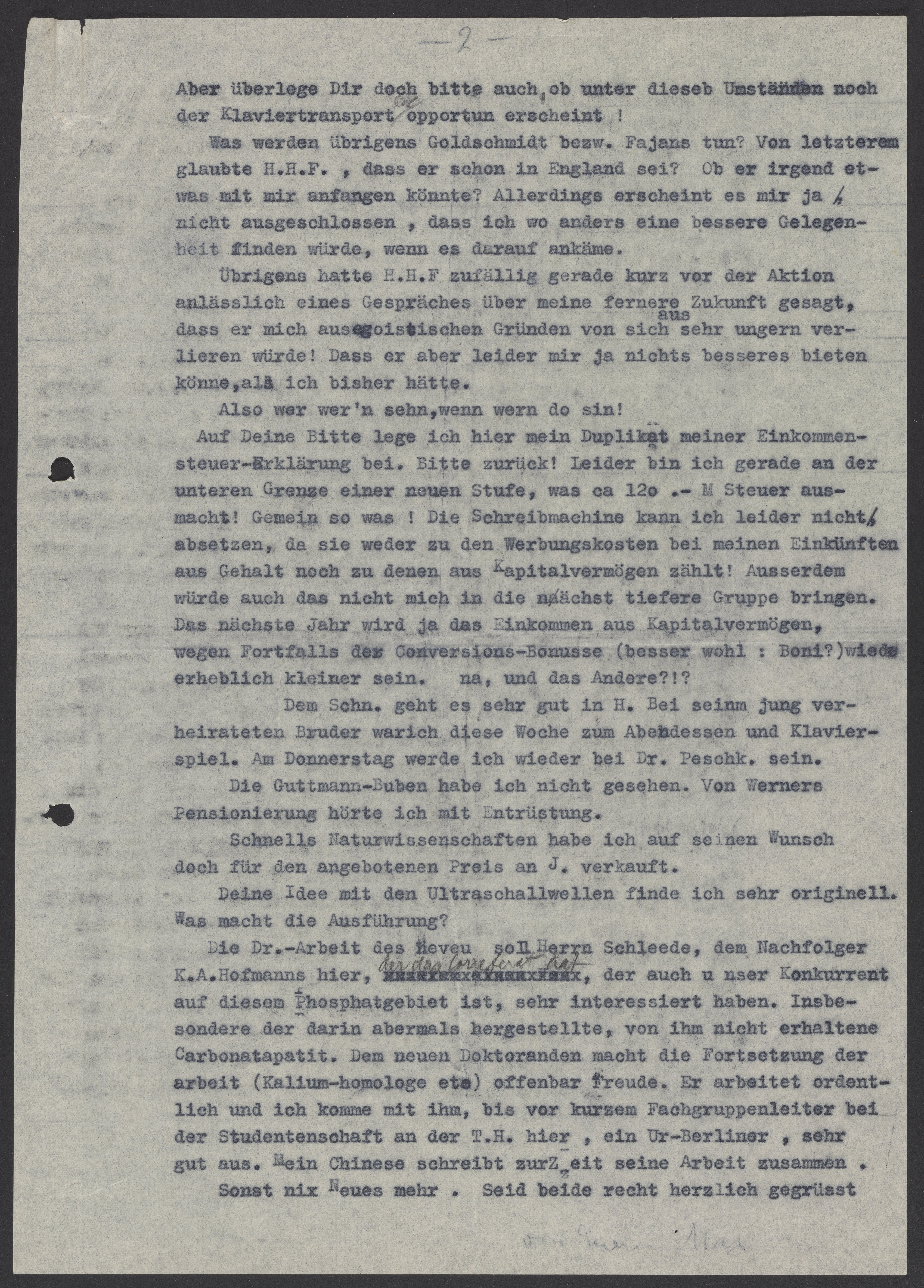 Was werden übrigens Goldschmidt bezw. Fajans tun? Von letzterem glaubte H.H.F., dass er schon in England sei? Ob er irgend etwas mit mir anfangen könnte? Allerdings erscheint es mir ja / nicht ausgeschlossen, dass ich wo anders eine bessere Gelegenheit finden würde, wenn es darauf ankäme.
