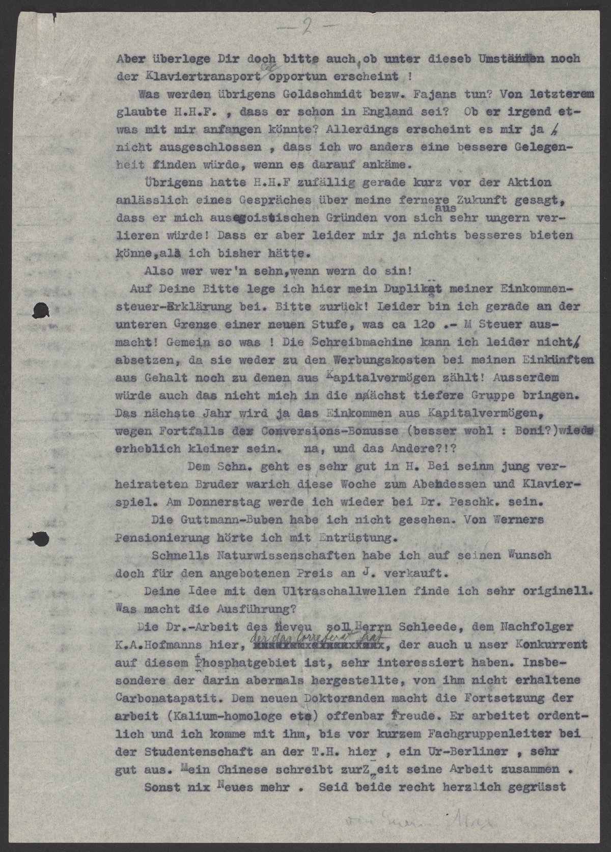 At your request, I am enclosing a duplicate copy of my income tax return. Please send it back to me once you have reviewed it. Unfortunately, I have reached the lower limit of a new tax bracket, which means that I now have to pay around 120 Marks in taxes. This is a significant amount of money for me. I had hoped that the typewriter I own could be counted as an income-related expense towards my salary or capital assets, but unfortunately, it cannot. Selling the typewriter wouldn’t help me to lower my tax bracket either. However, next year my income from capital assets will be considerably smaller as the conversion bonuses are being discontinued. As for the other issue, I am not sure what you are referring to. Please let me know if you need any further information.