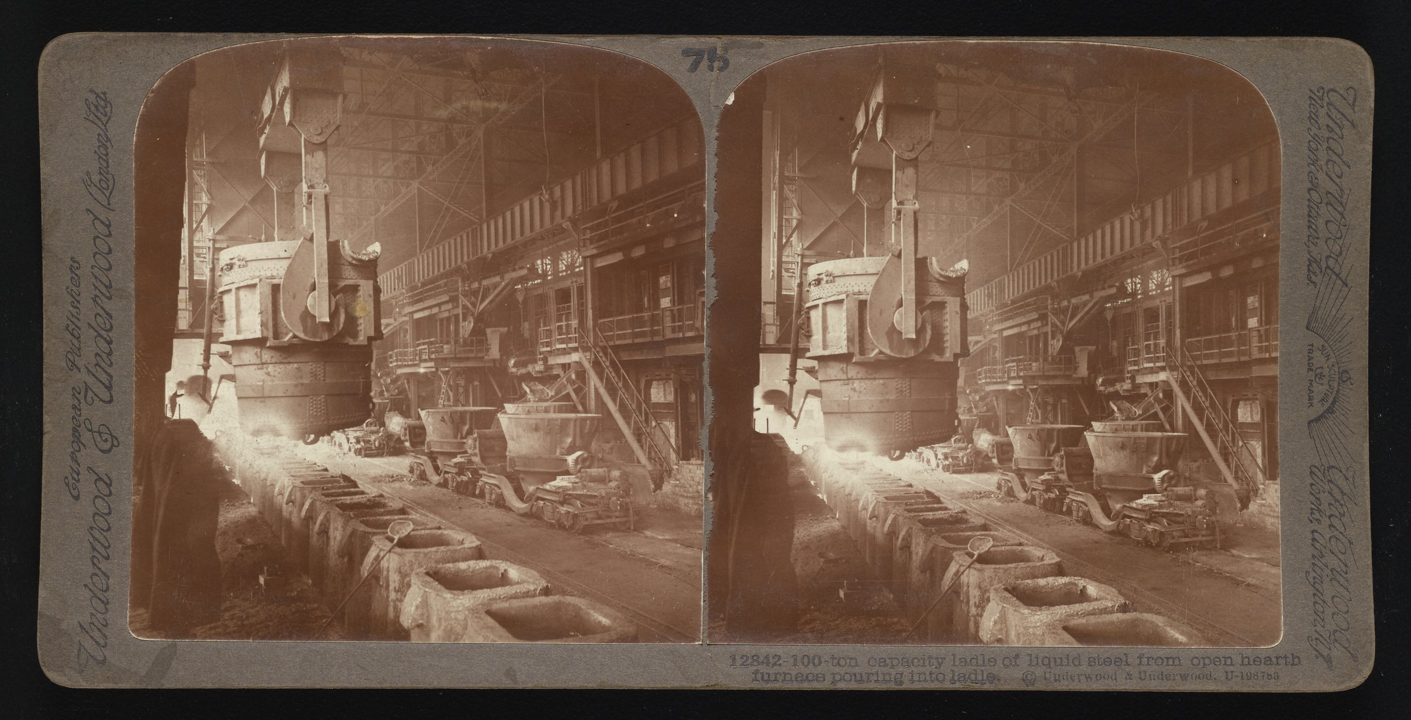 “100-Ton Capacity Ladle of Liquid Steel from Open Hearth Furnace Pouring into Ladle.” Underwood & Underwood, n.d. Underwood & Underwood Stereographs of Manufacturing Industries. Science History Institute. Philadelphia. https://digital.sciencehistory.org/works/x920fw85p.