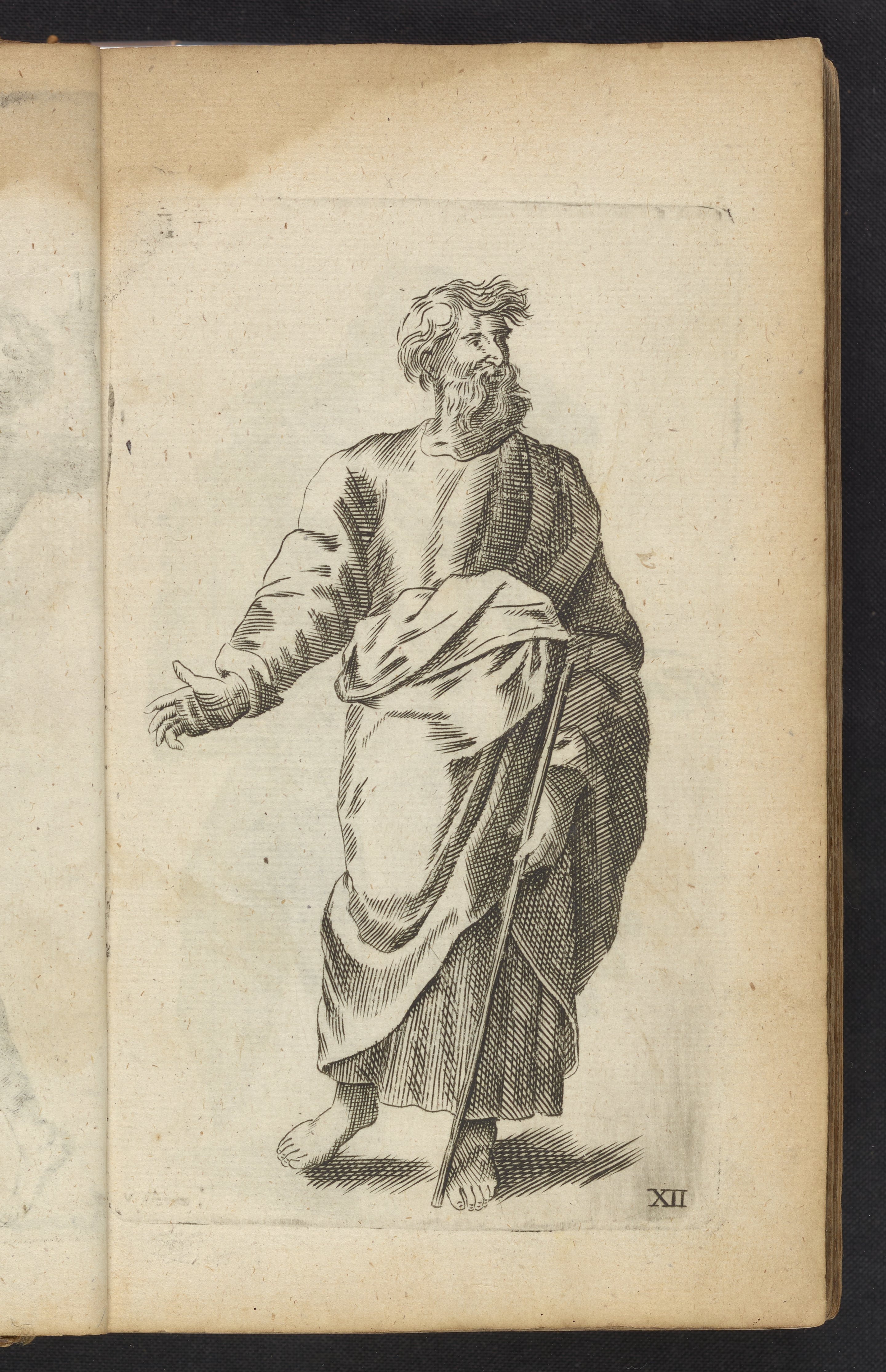 Engraved artist study of a bearded man wearing draped clothing and holding a stick. He gestures with his right hand.