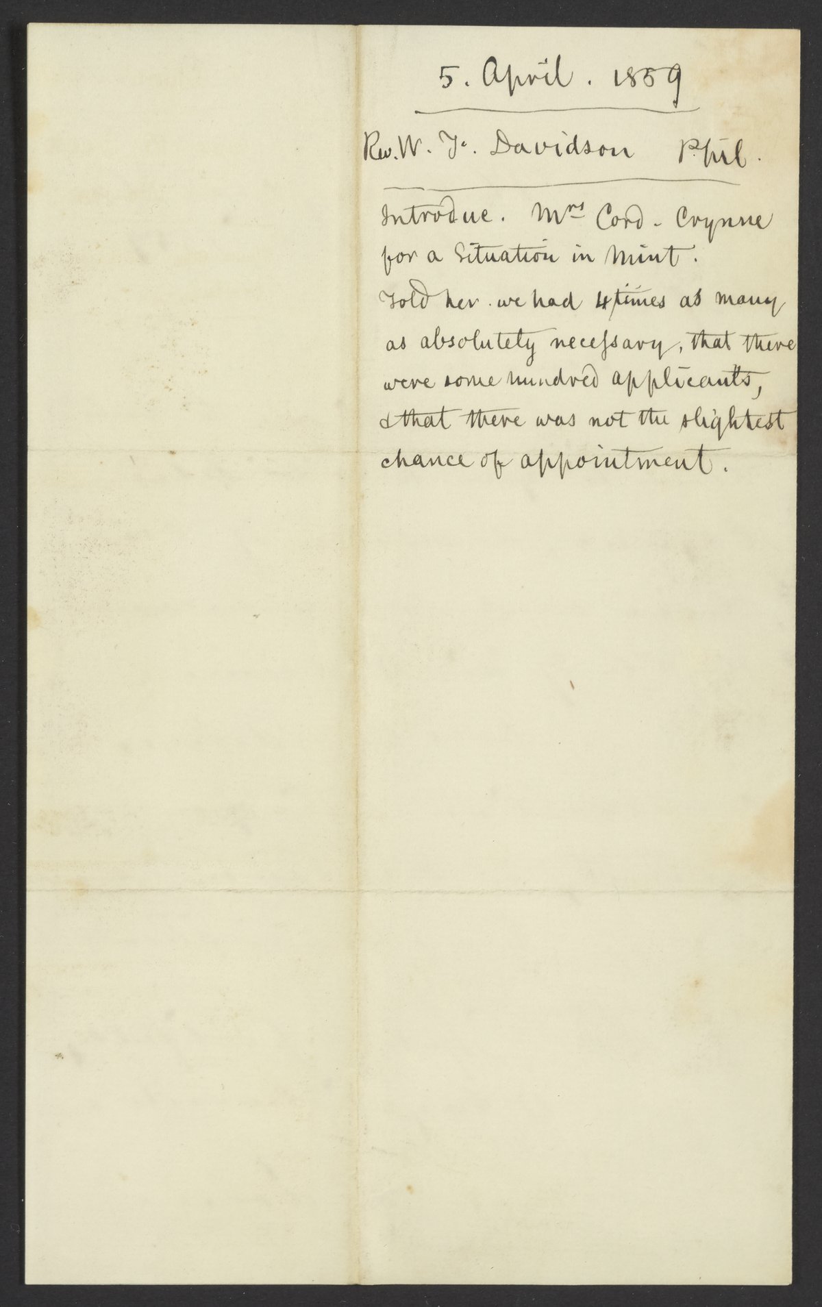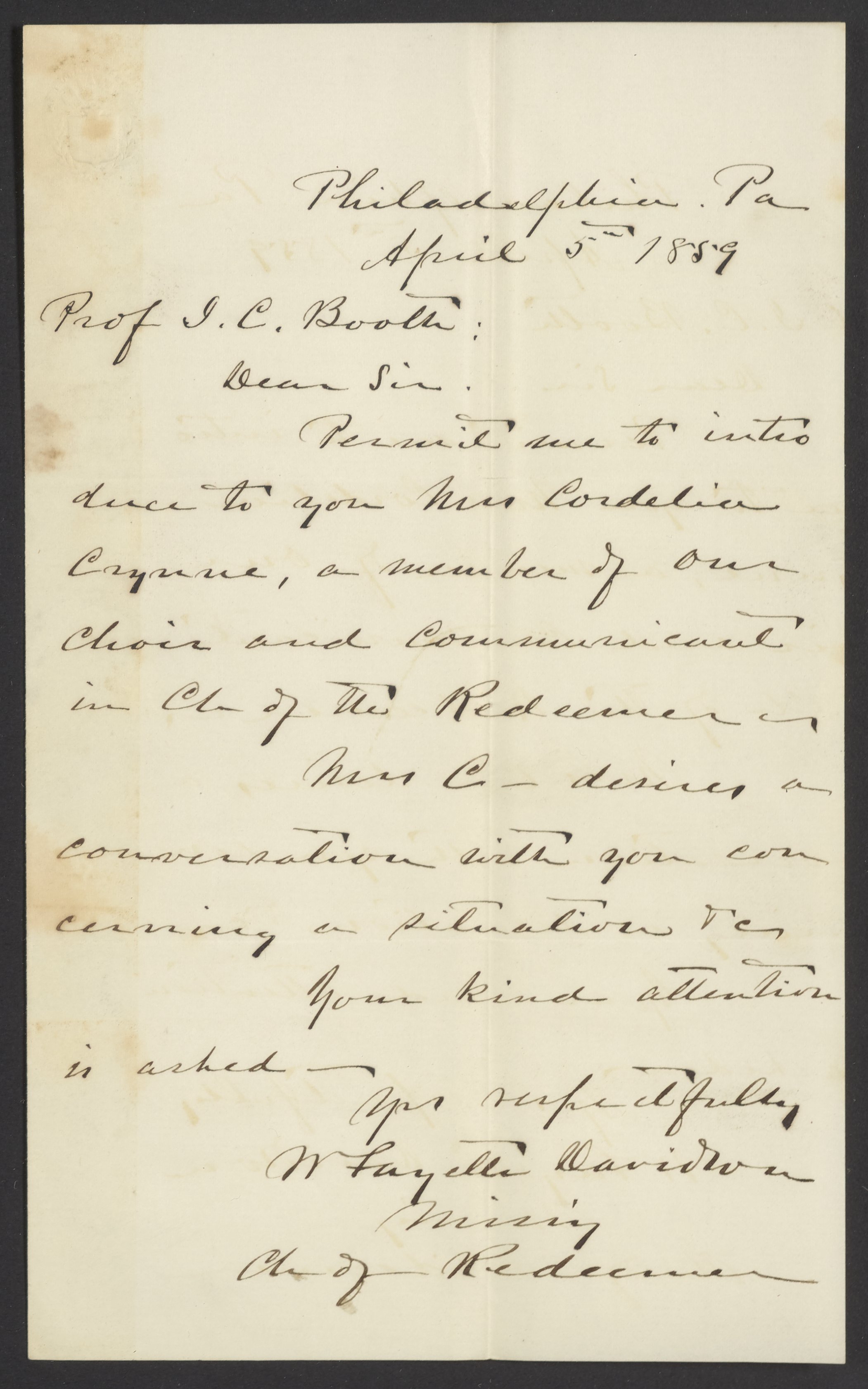 Letter from Rev. W. T. Davidson to James Curtis Booth, April 5, 1859